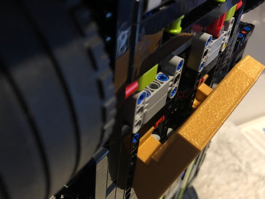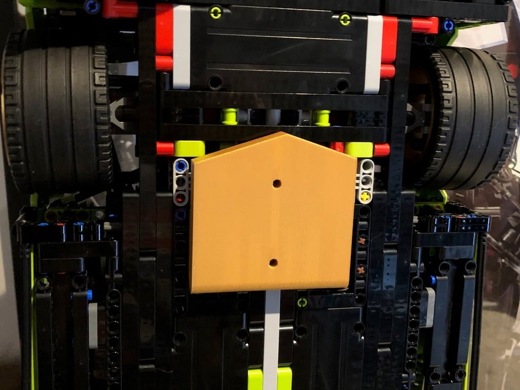 Jest to wydrukowany w 3D uchwyt ścienny do Lego Lamborghini Sián FKP 37. Haczyki montażowe wsuwają się w dwa otwory w dolnej części samochodu. Zwróć uwagę na strzałkę u góry płyty montażowej, która wskazuje, gdzie będzie znajdować się oś centralna samochodu.