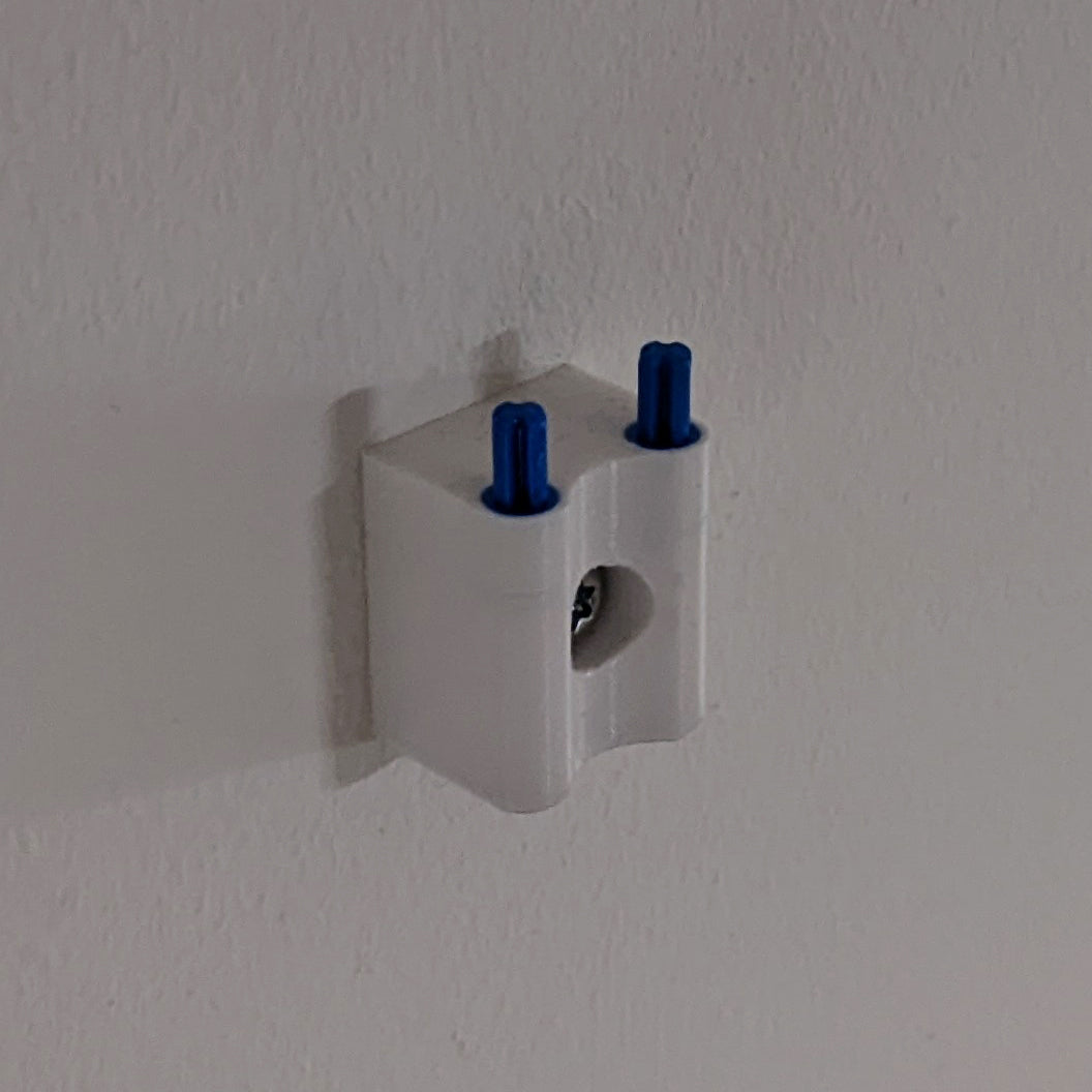 Uchwyt jest wydrukowany w kolorze białym Prusament PETG, ale każdy sztywny (nieelastyczny) filament powinien działać dobrze. Wystarczy użyć dwóch niebieskich kołków LEGO Technic (powinno ich być dużo w zapasie w zestawie) i śruby, aby przymocować go do ściany.