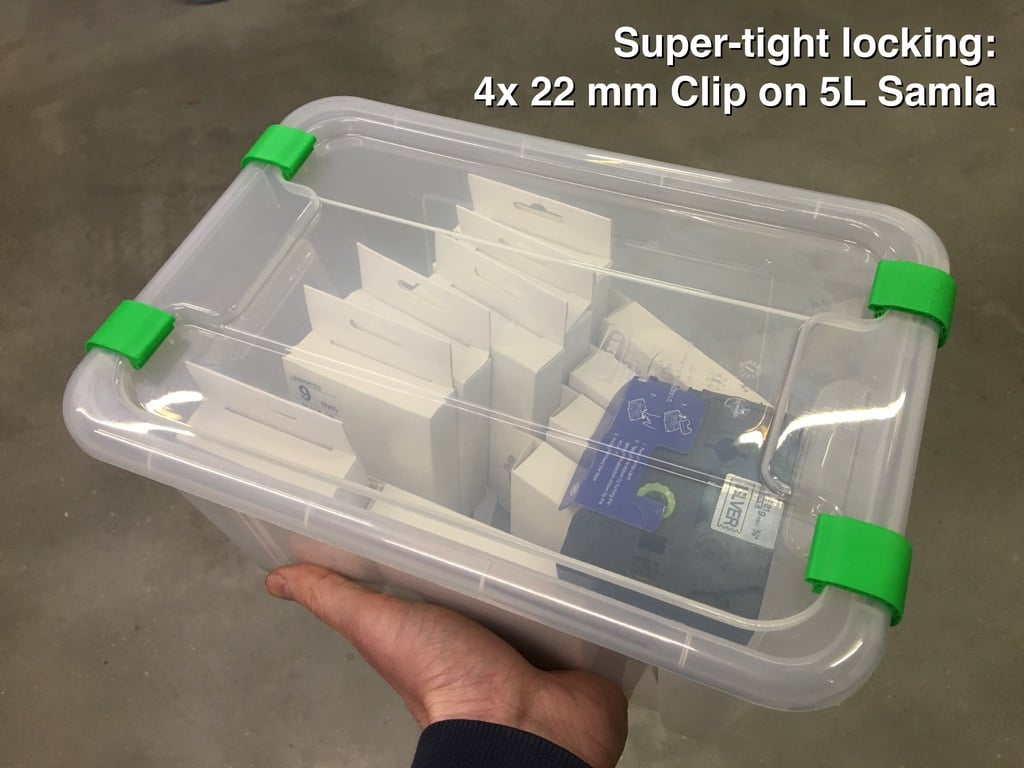 To jest samodzielnie wykonany klips do popularnych pudełek Samla z IKEA. Wykonany z naciskiem na wytrzymałość i trwałość, klips ten spełni wszystkie Twoje potrzeby związane z przechowywaniem, niezależnie od tego, czy dotyczy to pudełek o pojemności 5, 11, 22, 45 czy 65 litrów. Idealny dla tych, którzy potrzebują bardziej efektywnego rozwiązania zaciskowego do swoich pudełek Samla.