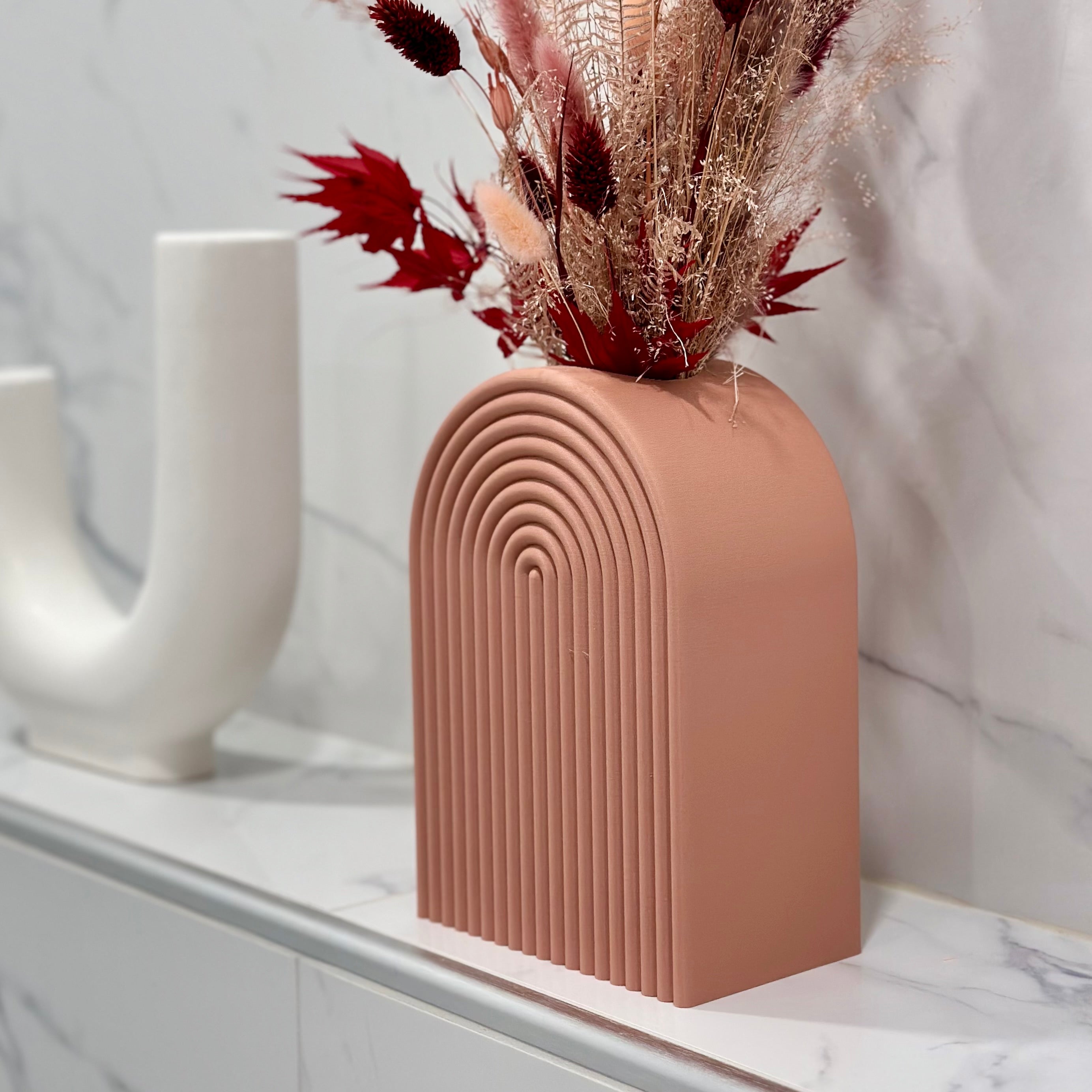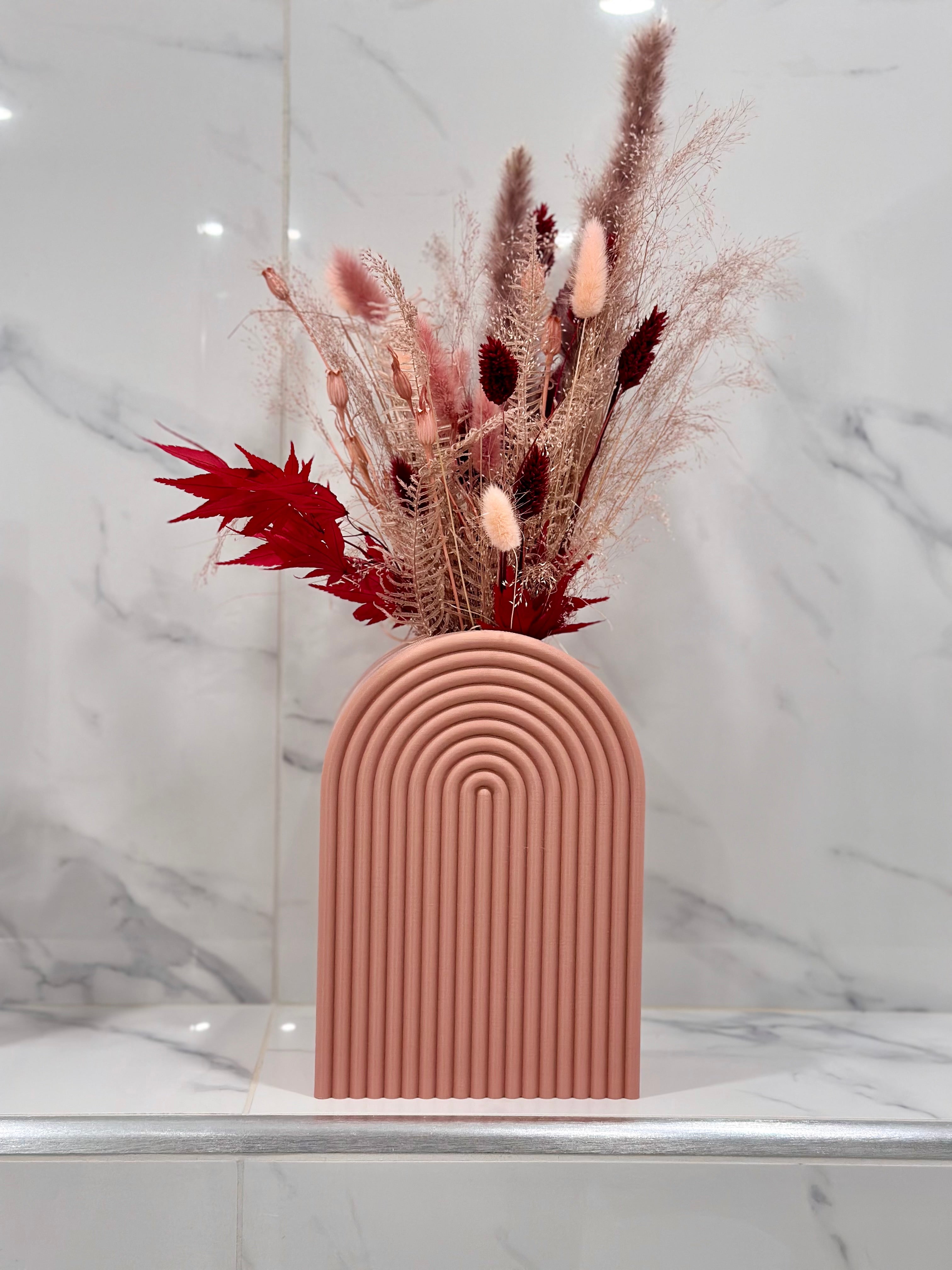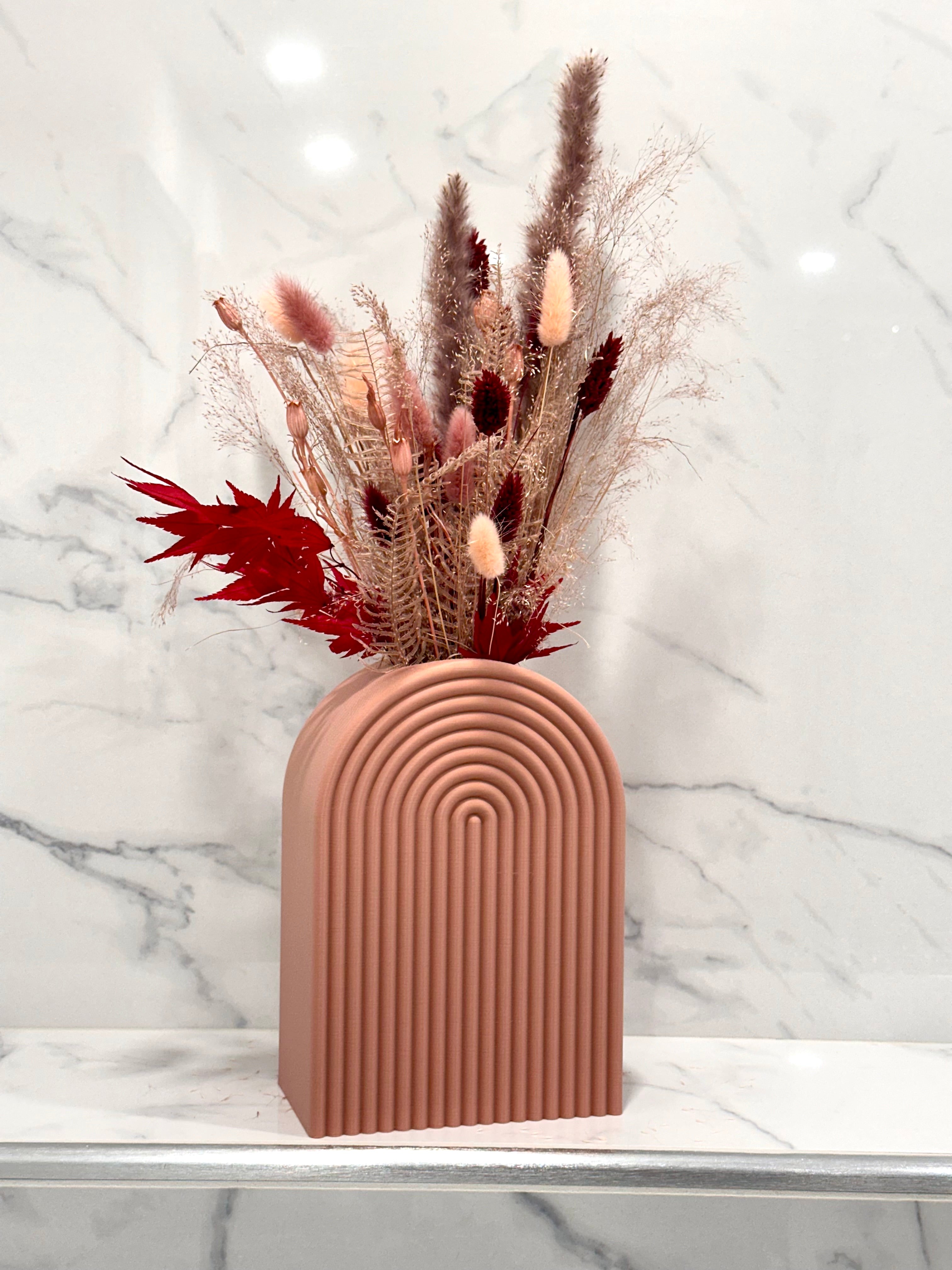 Ten nowoczesny wazon w kształcie tęczy doda stylowego akcentu każdemu wystrojowi wnętrza. Jego unikalny, estetyczny kształt jest idealny do eksponowania ulubionych kwiatów lub bukietów. Stabilna konstrukcja z łatwością pomieści wysokie kwiaty. Skaluj ten nowoczesny element dekoracyjny, aby pasował do Twoich konkretnych potrzeb.
