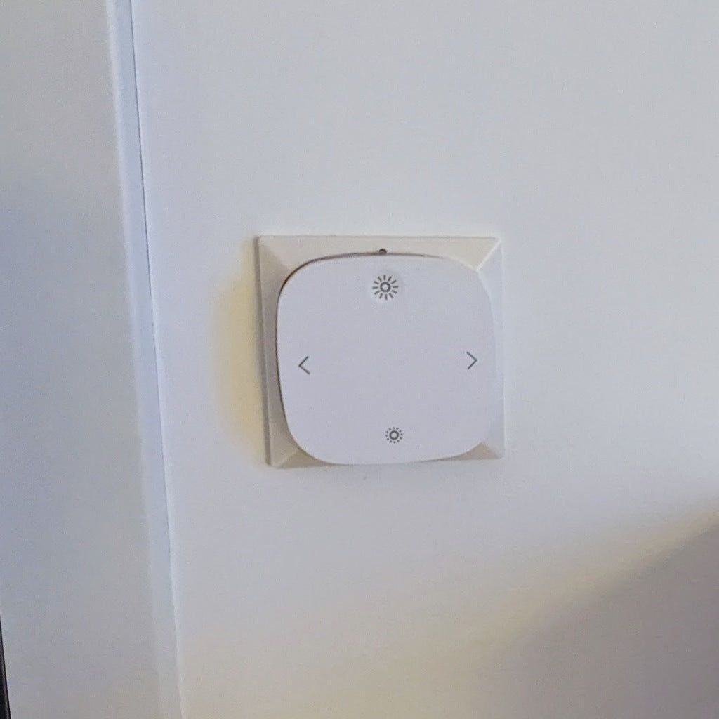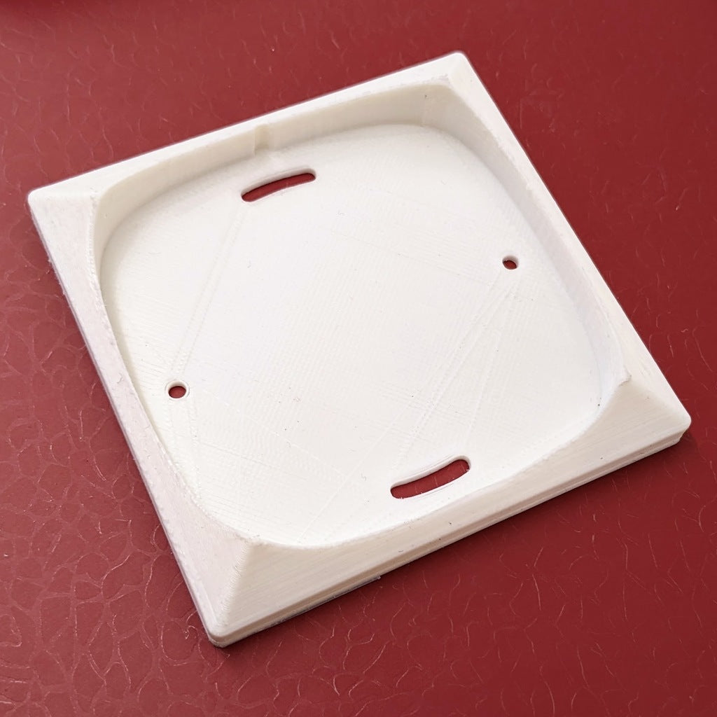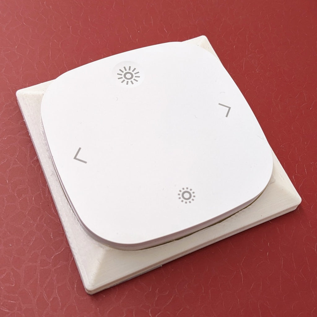 Uchwyt ścienny do pilota IKEA STYRBAR do inteligentnego domu. Ponieważ pilot zasadniczo zastępuje zwykły włącznik światła, ten uchwyt pozwala umieścić go w miejscu włącznika światła. Model posiada otwory do montażu na standardowej puszce podtynkowej.