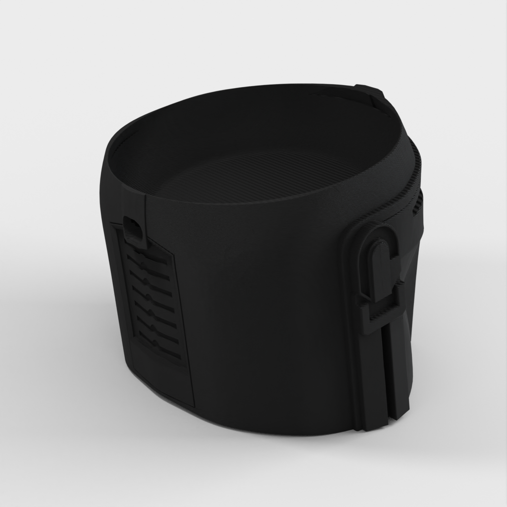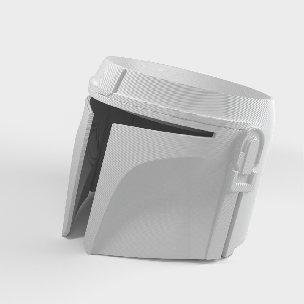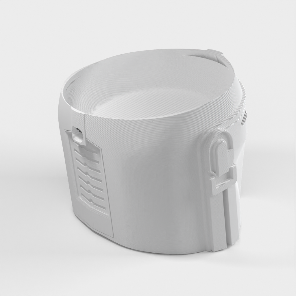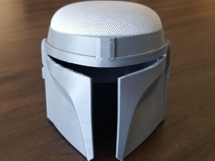 Zabawny uchwyt do Google Home Nest 2. generacji, który ma kształt hełmu Mandalorianina z Gwiezdnych Wojen.