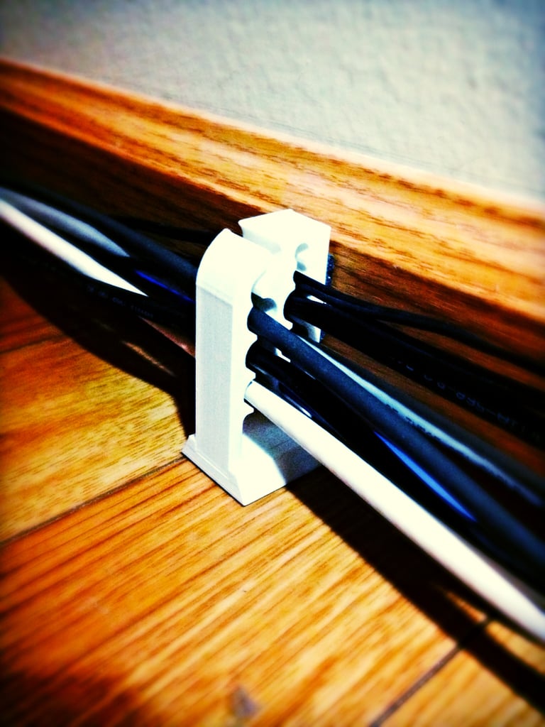 Organizer kabli do montażu na listwie przypodłogowej, który może uporządkować stos kabli komputerowych biegnących wzdłuż listew przypodłogowych w biurze. Ten organizer może pomieścić wiele kabli komputerowych o niemal dowolnej średnicy i utrzyma je w porządku, gdy będą używane parami.