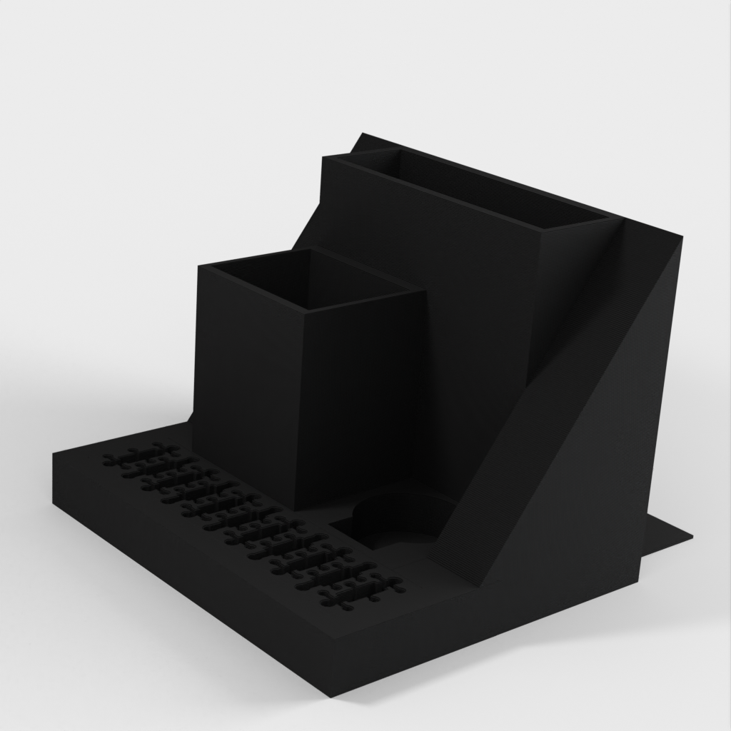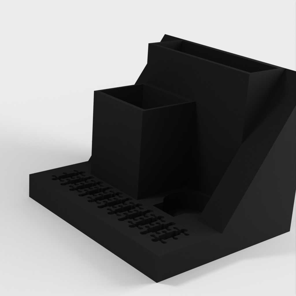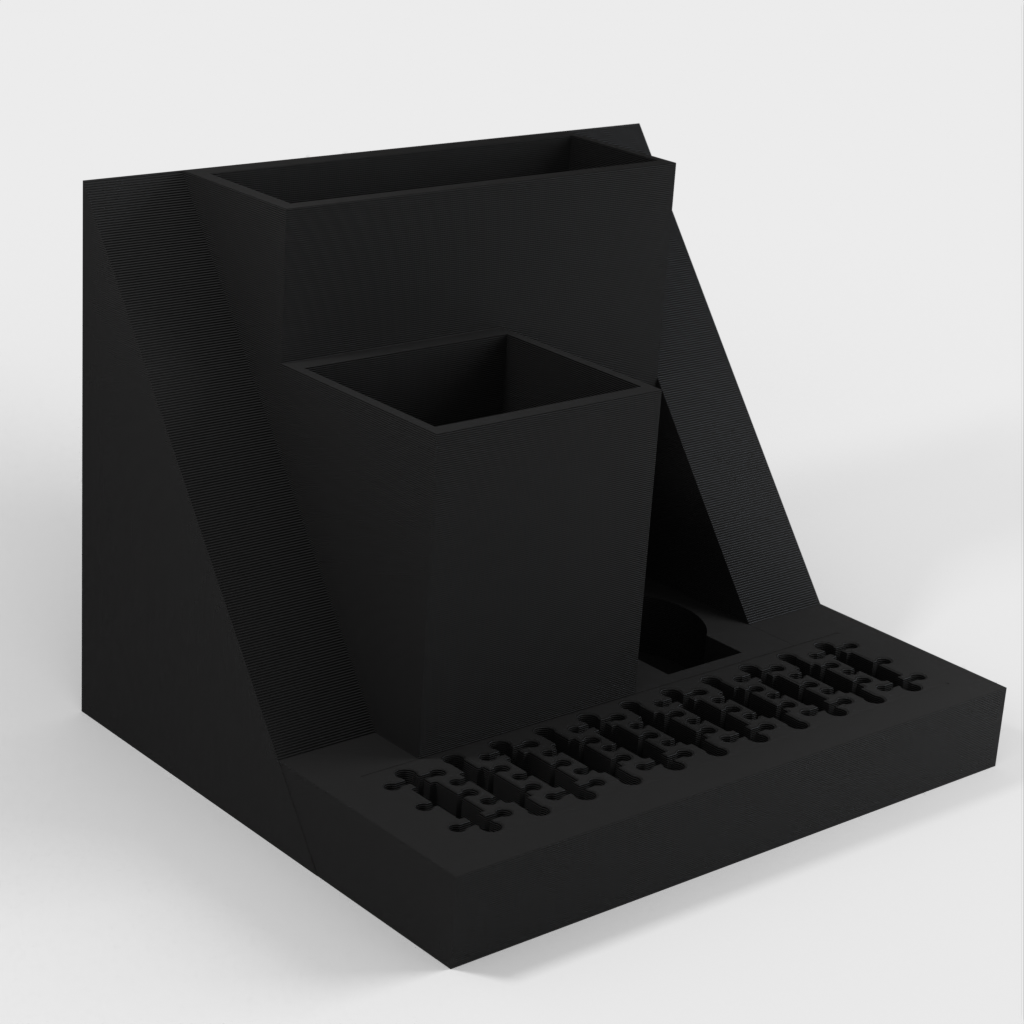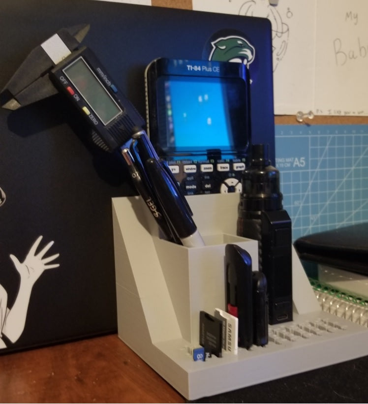 Organizer na biurko z miejscem na laptopa, który można łatwo wsunąć pod tablicę korkową obok biurka. Model ten posiada również wbudowane gniazdo USB i uchwyt na karty SD, a także oddzielne gniazda na tablet TI-84 Plus CE oraz długopisy i inne drobne przedmioty. Uporządkuj swoje biurko i zwiększ produktywność dzięki temu eleganckiemu i funkcjonalnemu organizerowi.