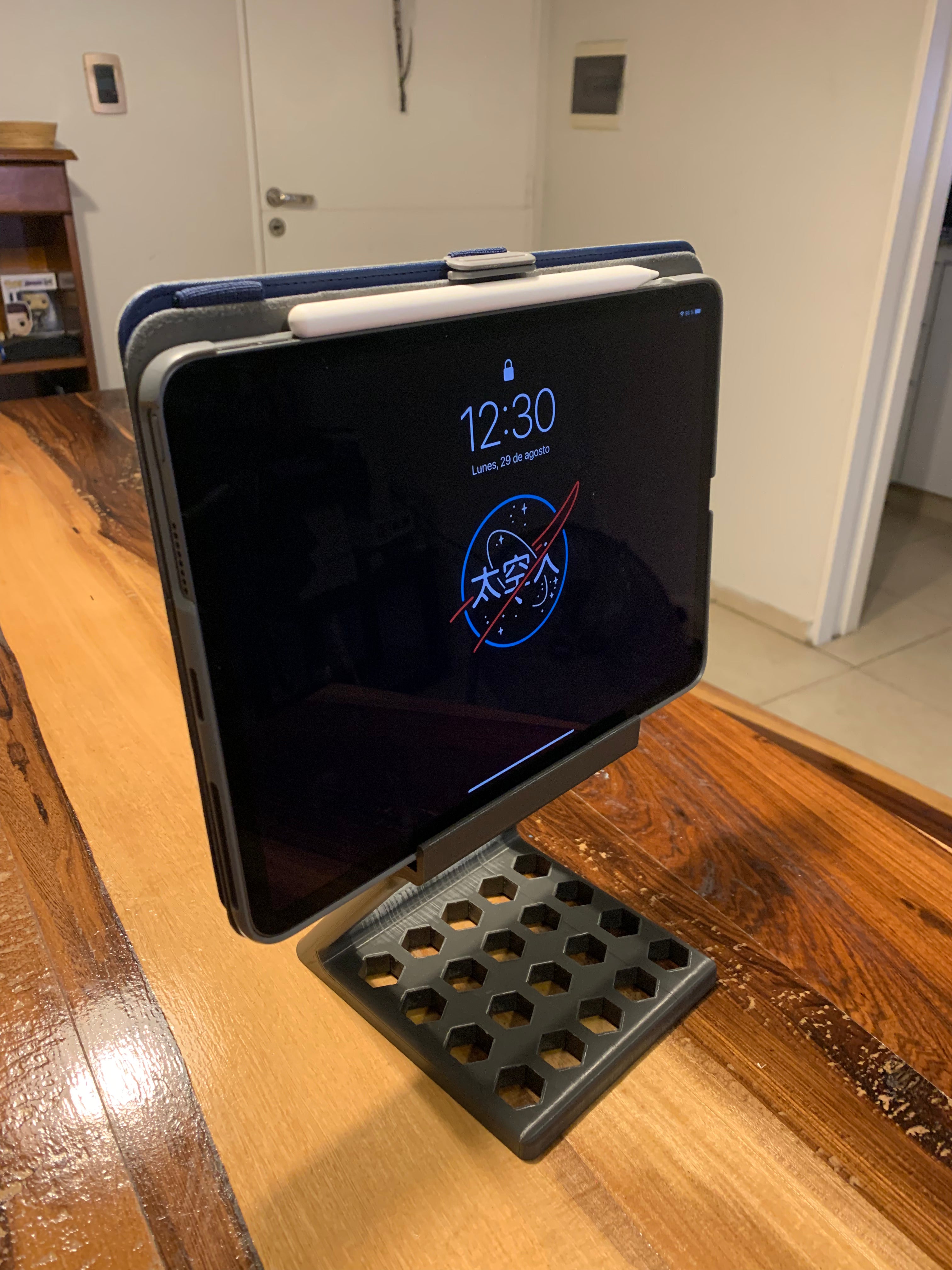 Precyzyjnie wykonany uchwyt na iPada. Można go dostosować do idealnego punktu widzenia, aby ułatwić czytanie, przeglądanie lub rozmowy wideo. Jego konstrukcja jest prosta i podąża za minimalistyczną estetyką iPada.