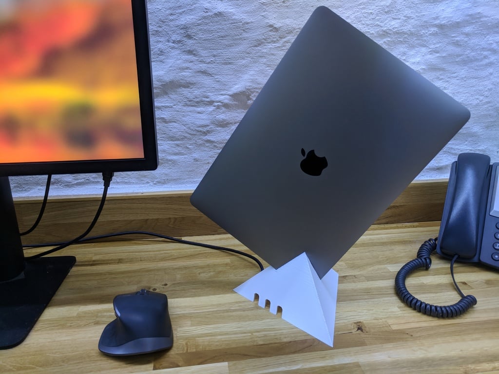 Stojak utrzymuje MacBooka Pro w pozycji pionowej, co nie tylko uwalnia cenną przestrzeń na biurku, ale także zapewnia maksymalny przepływ powietrza wokół urządzenia. Jest kompatybilny zarówno z oryginalnym kablem USB-C Apple, jak i kablem USB-C LG dołączonym do monitora LG UltraFine 4K.