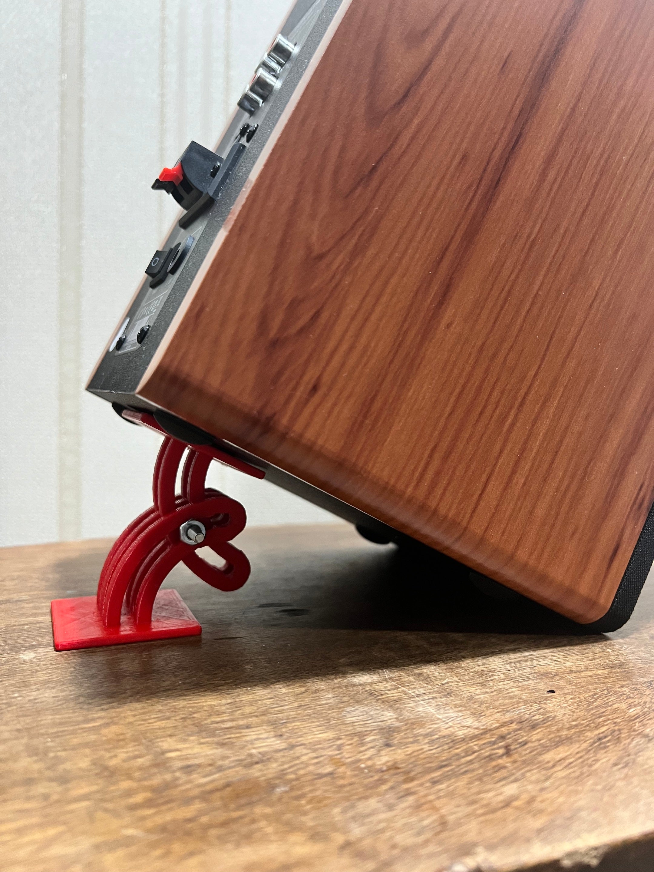 Ten regulowany wspornik głośnikowy został opracowany w celu poprawy jakości dźwięku, szczególnie w pomieszczeniach, w których optymalne umiejscowienie głośników stanowi wyzwanie. Wspornik montuje się na spodzie głośników półkowych i umożliwia precyzyjną regulację kąta, dzięki czemu głośnik wysokotonowy jest skierowany bezpośrednio na uszy słuchacza. Jest to szczególnie korzystne w małych lub umeblowanych pomieszczeniach, w których umieszczenie na wysokości uszu nie jest możliwe. Regulując pozycję głośnika, zapewnia się wyraźniejsze i bardziej zniuansowane odtwarzanie dźwięku. Wspornik pomaga zoptymalizować akustykę i poprawić ogólną jakość dźwięku z istniejącej konfiguracji głośników.