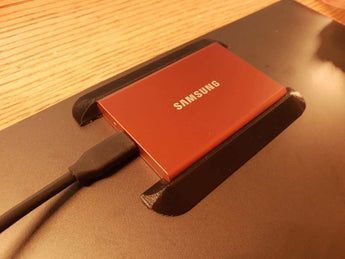 To jest podstawowy uchwyt do przenośnego dysku SSD Samsung T7. Ma mniejszą wysokość niż sam dysk SSD, więc nie dodaje grubości do powierzchni, do której go przyklejasz. Jest zatrzaskowy, więc po przyklejeniu do powierzchni upewnij się, że używasz dysku SSD jako dystansu, aby uzyskać mocne zatrzaśnięcie po jego wyjęciu i ponownym włożeniu.