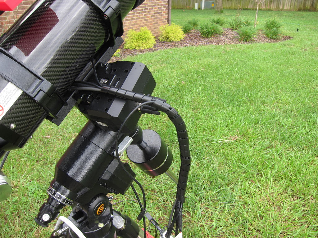 Ten wspornik został zaprojektowany w celu zapewnienia skutecznego zarządzania kablami na nogach statywu montażu teleskopu Exos-2. Działa jako wytrzymały uchwyt na kable, który pomaga utrzymać kable od skrzynki kontrolnej PMC-Eight do mocowania. Minimalizuje to ryzyko zaczepienia się lub splątania kabli podczas obracania się teleskopu, co może uniemożliwić zatrzymanie silników i potencjalnie uszkodzić sprzęt. Oprócz głównych kabli sterujących, ten klips na przewody może być również używany do bezpiecznego utrzymywania kabli grzejnych i kabli kamery astrofotograficznej na miejscu, co przyczynia się do bardziej zorganizowanej i bezproblemowej sesji obserwacyjnej.