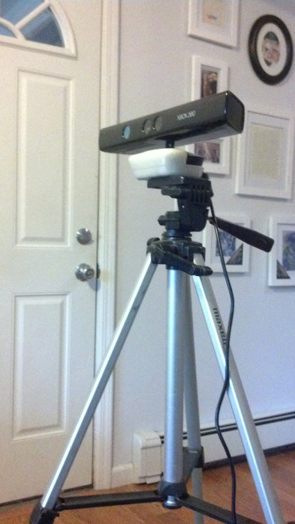 Uchwyt składa się z dwóch elementów: większej części, która otacza i podtrzymuje podstawę Kinecta, oraz mniejszej części, która mocuje się do statywu. Ta dwuczęściowa konstrukcja zapewnia stabilne i niezawodne połączenie, dzięki czemu Kinect pozostaje w żądanej pozycji przez cały proces.