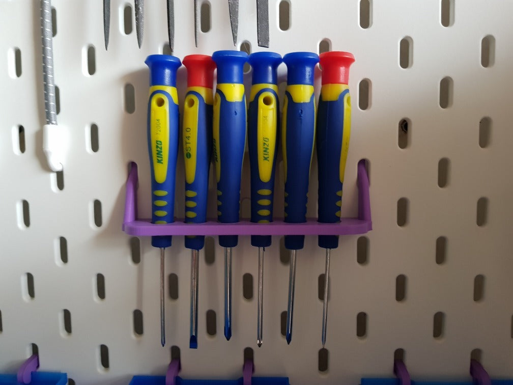 Uchwyt na śruby do płyty ściennej IKEA Skadis (SKÅDIS), zaprojektowany na 6 mniejszych śrubokrętów. Uchwyt idealnie pasuje do systemu organizacji Skadi i ułatwia trzymanie śrubokrętów na miejscu i w zasięgu ręki. Dobrze zaprojektowany, aby pomieścić wkrętaki z rączkami mniejszymi niż część metalowa, ten uchwyt ma pełne nacięcie umożliwiające ich wsunięcie. Jest wyposażony w 7 nasadek, chociaż może pomieścić tylko 6 wkrętaków na raz.