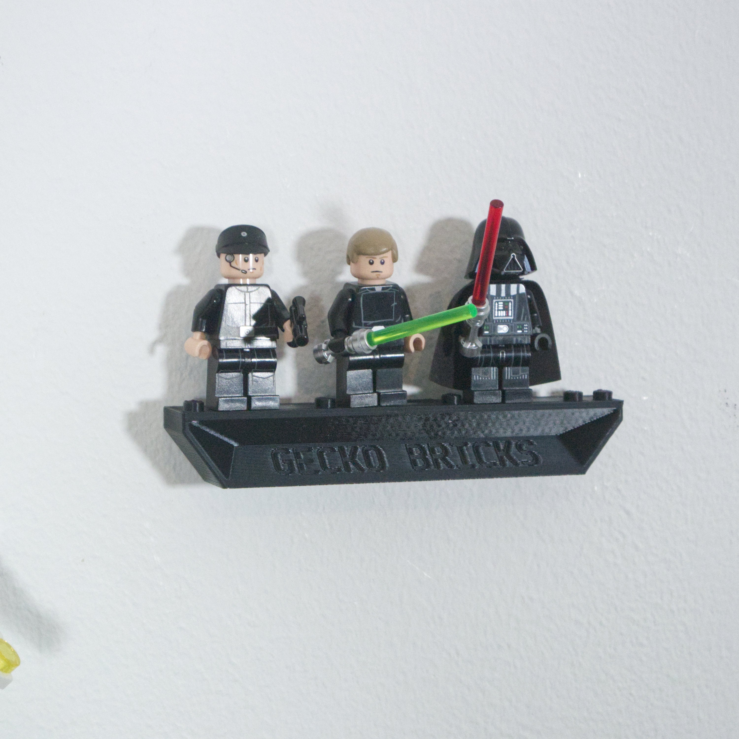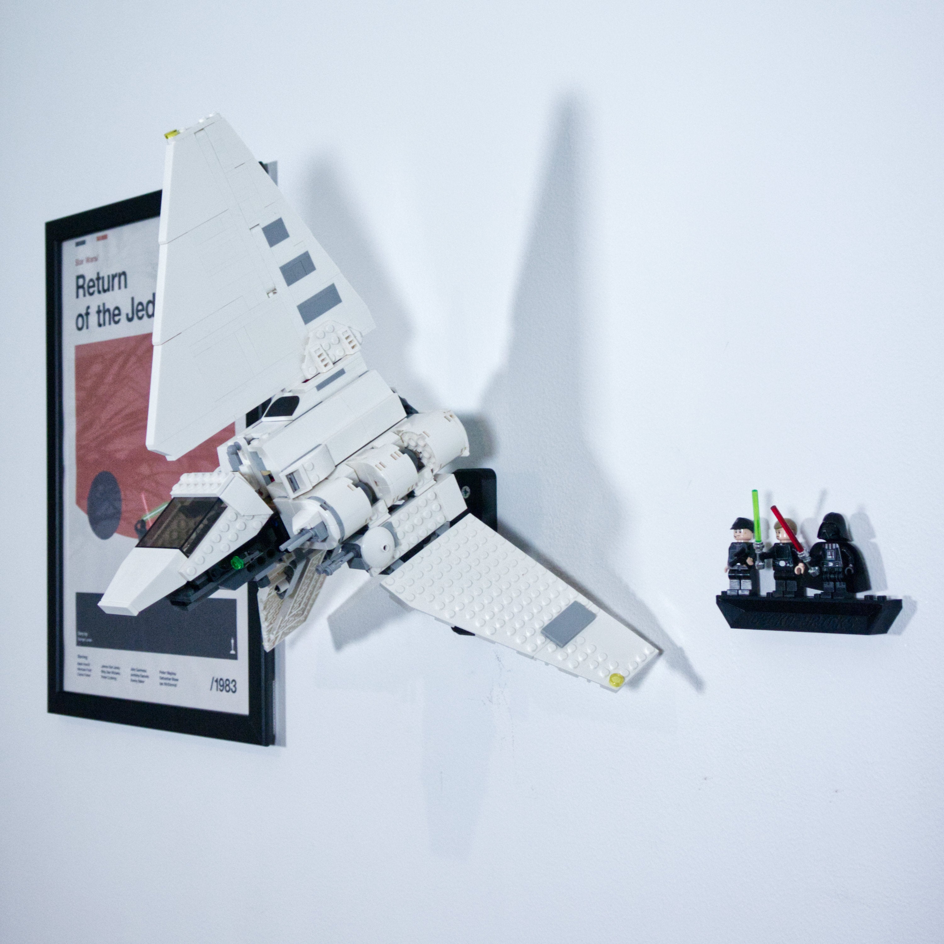 Ten uchwyt ścienny prezentuje Twój Imperial Shuttle od przodu, podkreślając kształt skrzydeł modelu. Uchwyt oferuje regulowany kąt dla optymalnego wyświetlania i ułatwia usunięcie zestawu w razie potrzeby. Dołączony jest oddzielny uchwyt na minifigurki, dzięki czemu całą kolekcję można eksponować razem na ścianie.
