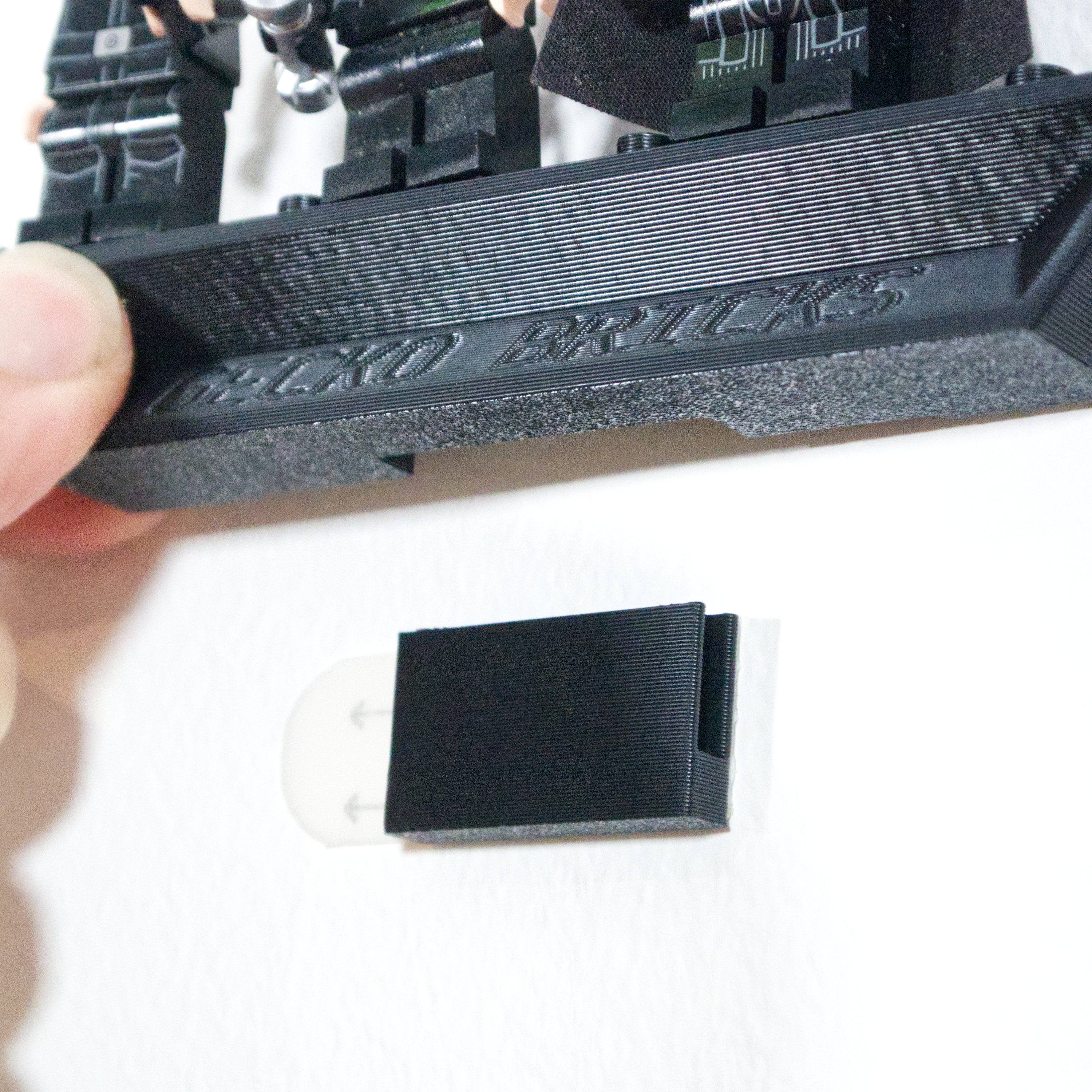 - Dołączony jest oddzielny stojak na minifigurki, który można przymocować taśmą.