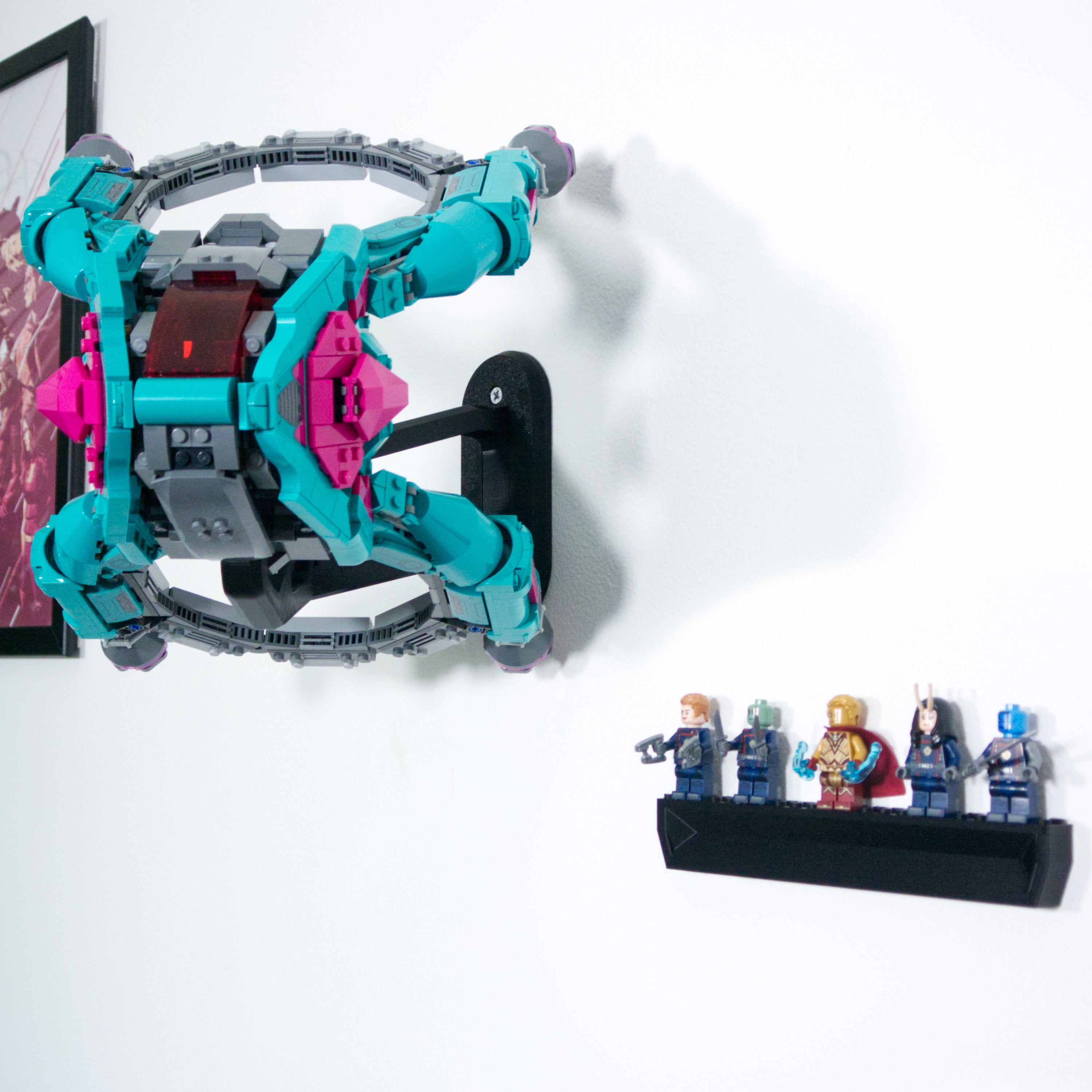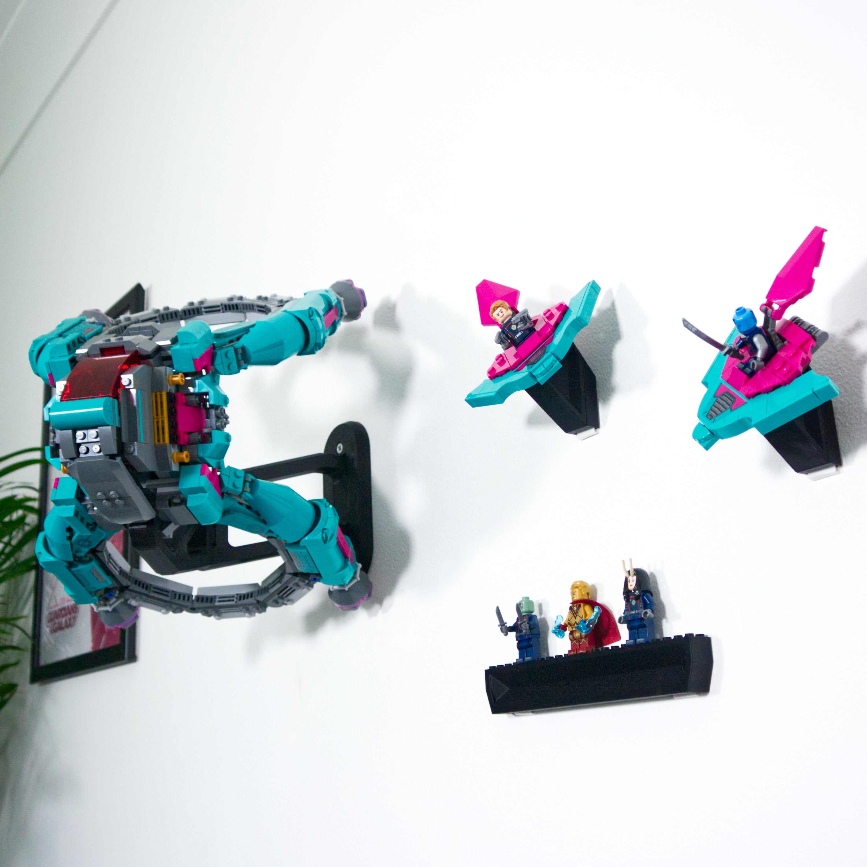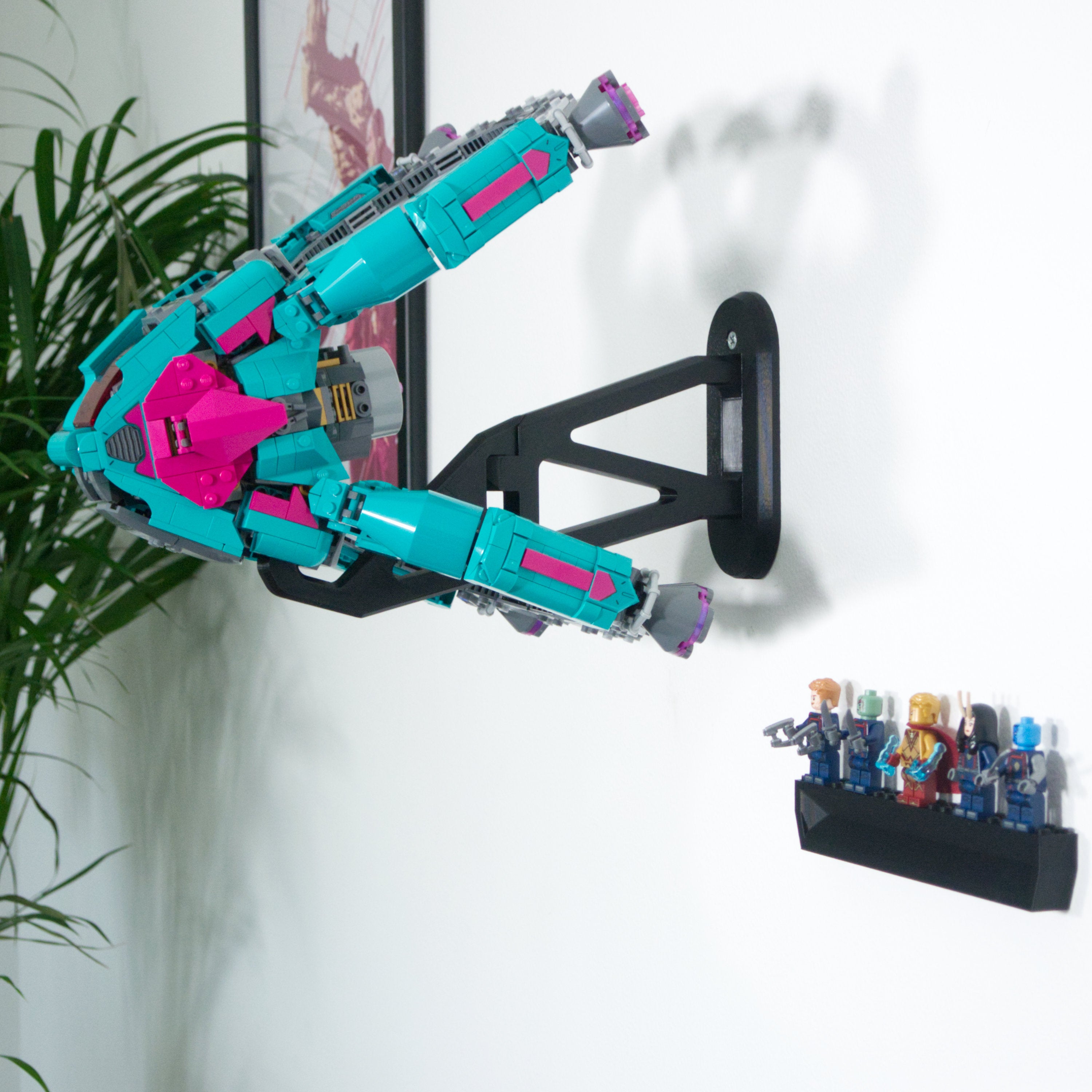 Ten uchwyt ścienny do statku Marvel New Guardians 76255 pozwala na poziome eksponowanie modelu, skierowanego prosto do przodu lub pod kątem do jednej ze stron. Konstrukcja umożliwia łatwe zdejmowanie statku. Zestaw zawiera również oddzielne uchwyty na mini-pojazdy i minifigurki, które łatwo montuje się na ścianie.