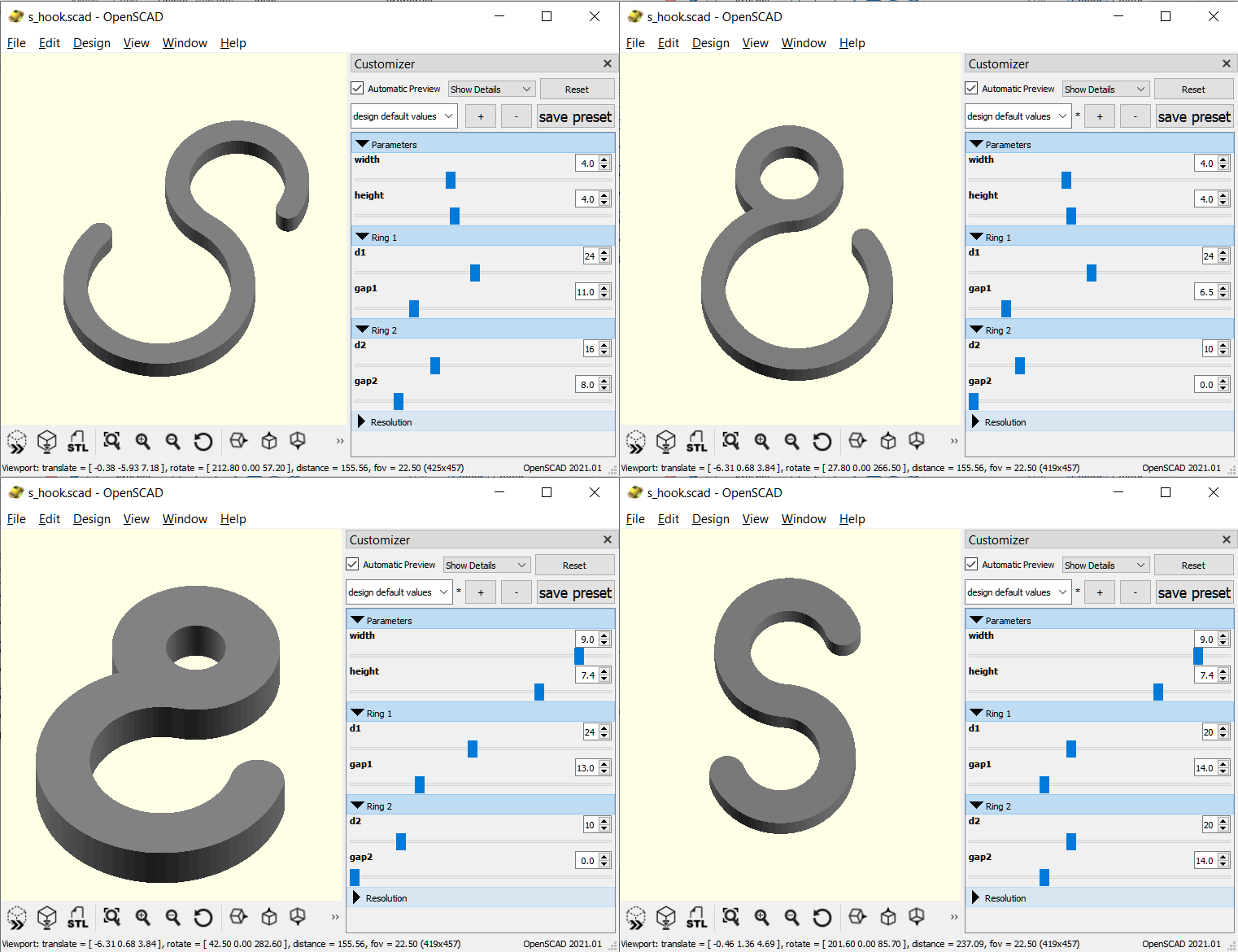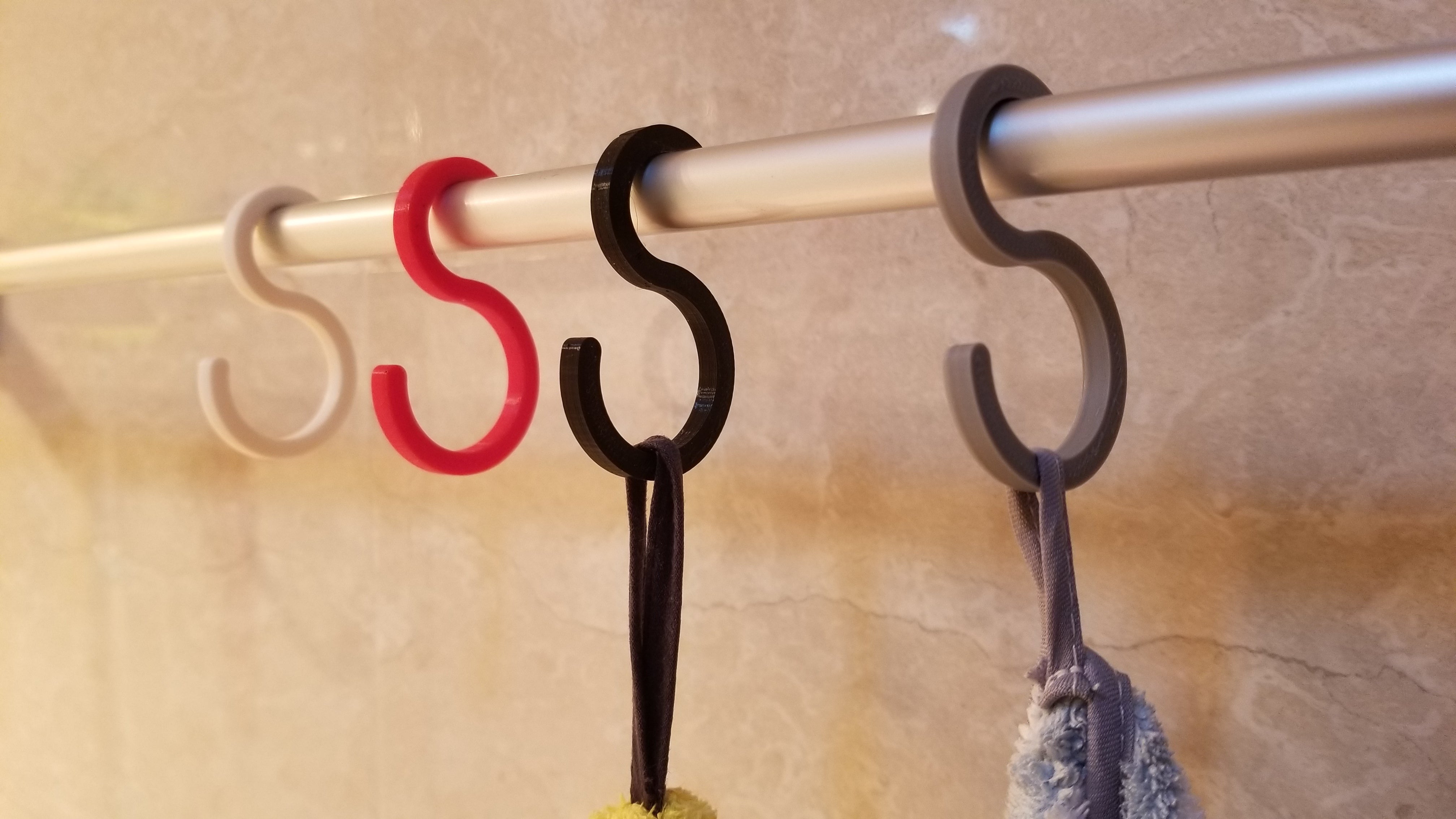 Te niestandardowe haczyki w kształcie litery S można dostosować do własnych preferencji. Są idealne do użytku zarówno w łazience, jak i kuchni i mogą być drukowane bardzo szybko, bez zużywania dużej ilości materiału.
