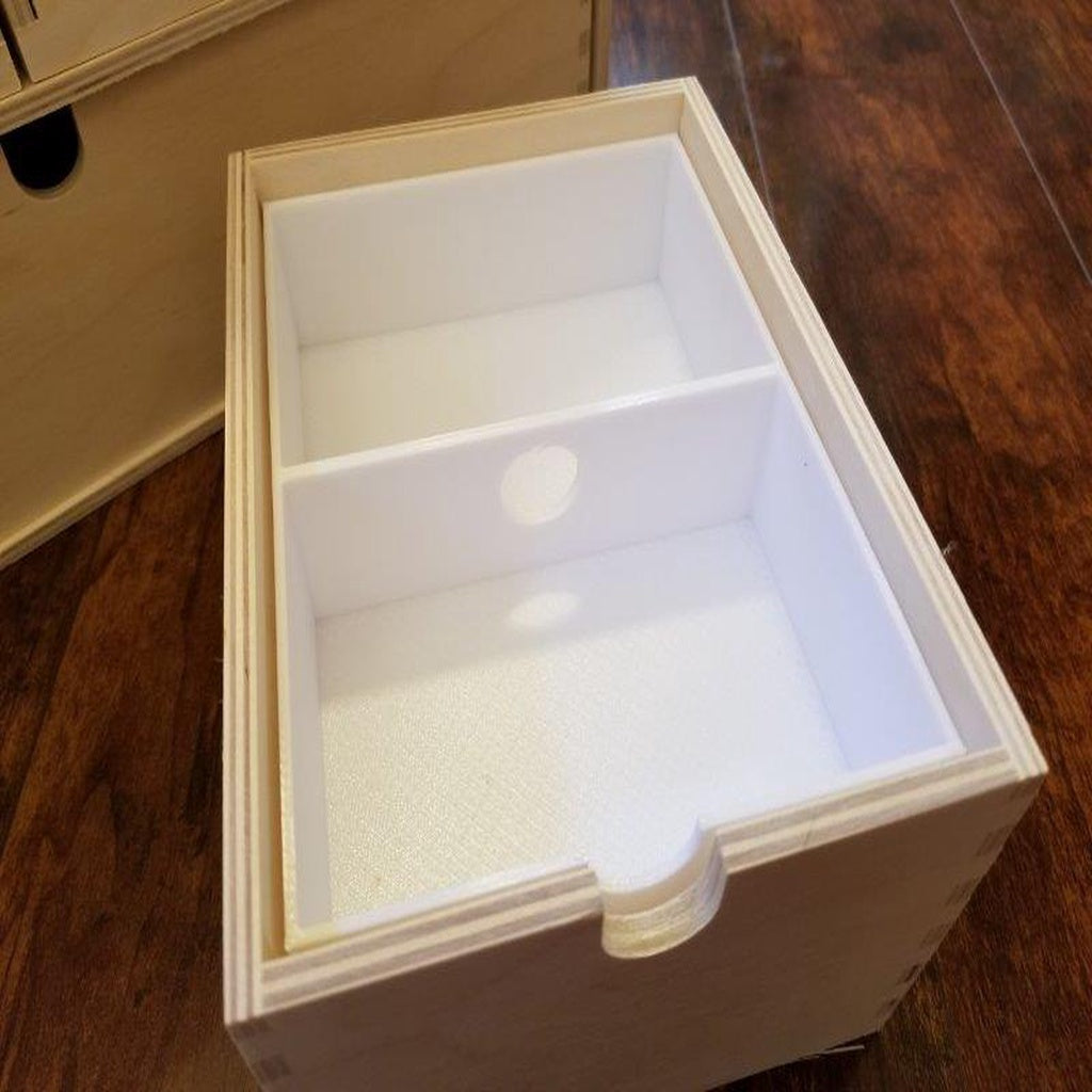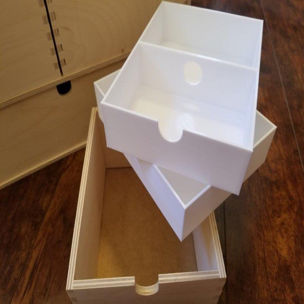Są to organizery wkładane do szuflad Ikea MOPPE. Pasują one do mniejszych szuflad organizera Moppe. Dół i góra są identyczne, z wyjątkiem góry, która posiada wycięcie na uchwyt szuflady.