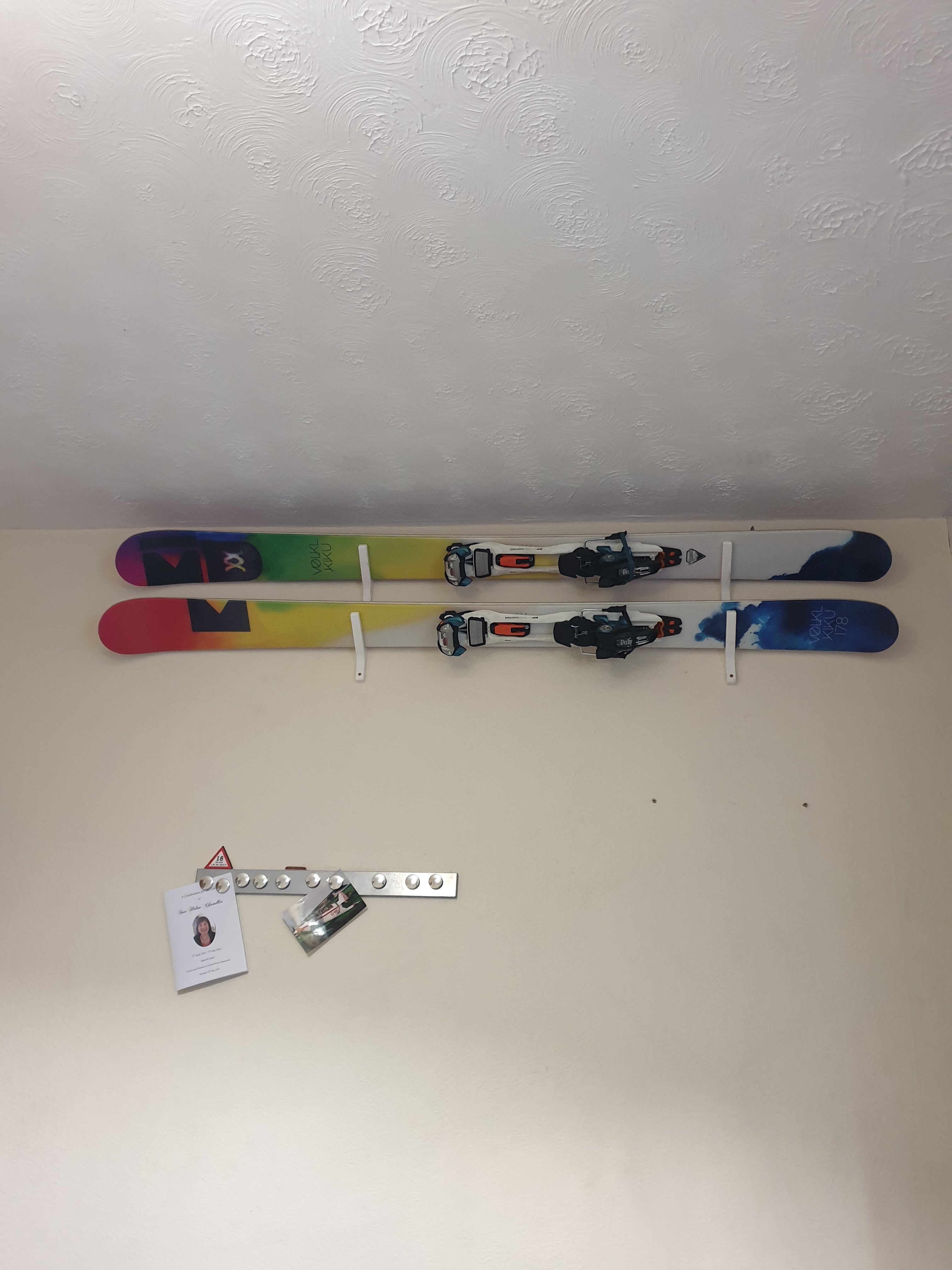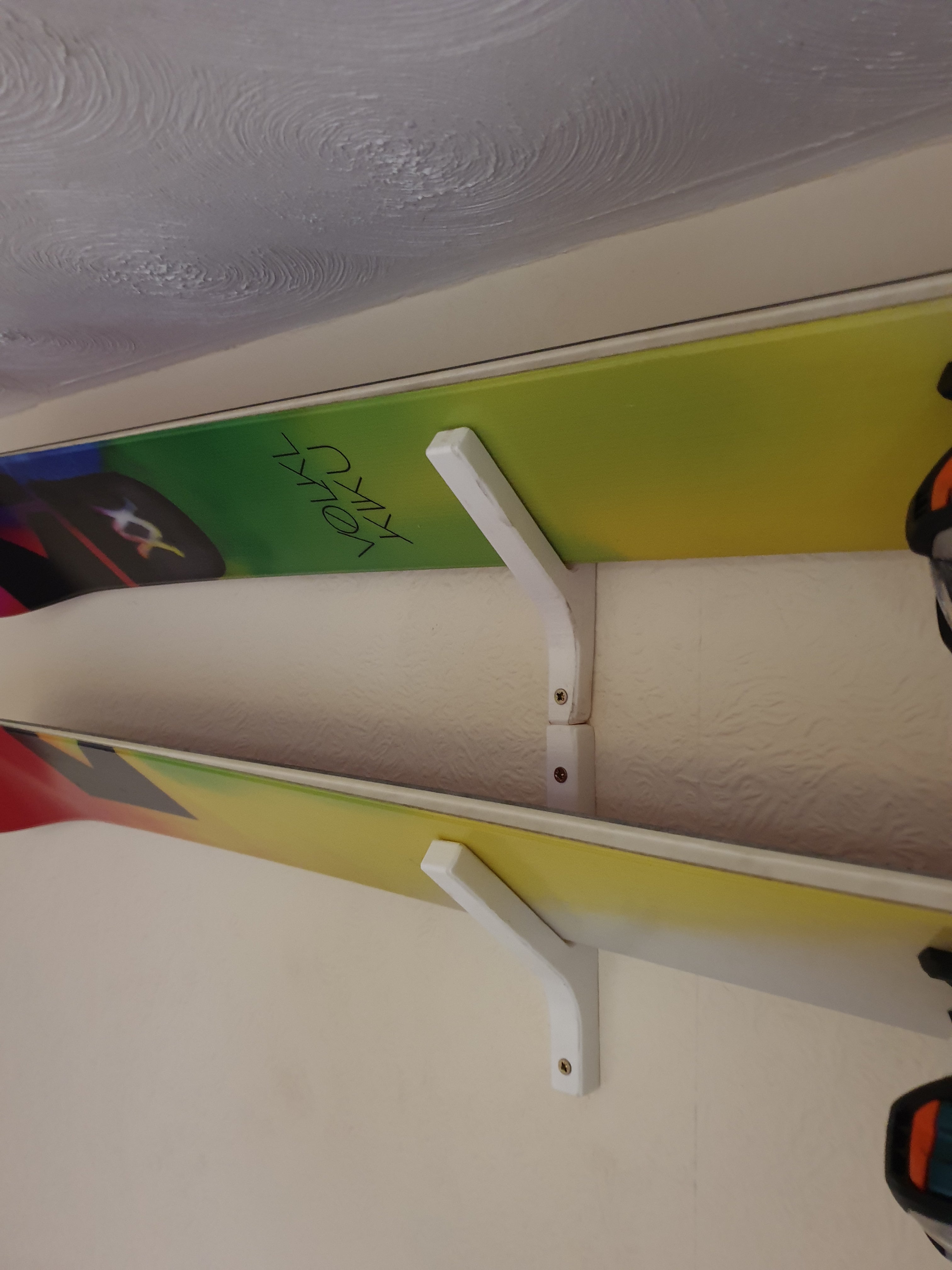 To jest ukośny uchwyt ścienny na narty, który został zaprojektowany do łatwego przechowywania i eksponowania nart w elegancki sposób. Uchwyt umożliwia wyeksponowanie górnej warstwy narty i można go łatwo zdjąć w razie potrzeby. Wymaga dwóch śrub i dwóch kołków rozporowych do przymocowania do ściany z cegły lub tylko śrub do drewna, jeśli jest montowany na płycie gipsowo-kartonowej. Każdy uchwyt może pomieścić parę nart, więc do zawieszenia pary nart potrzebne są łącznie 2 uchwyty.