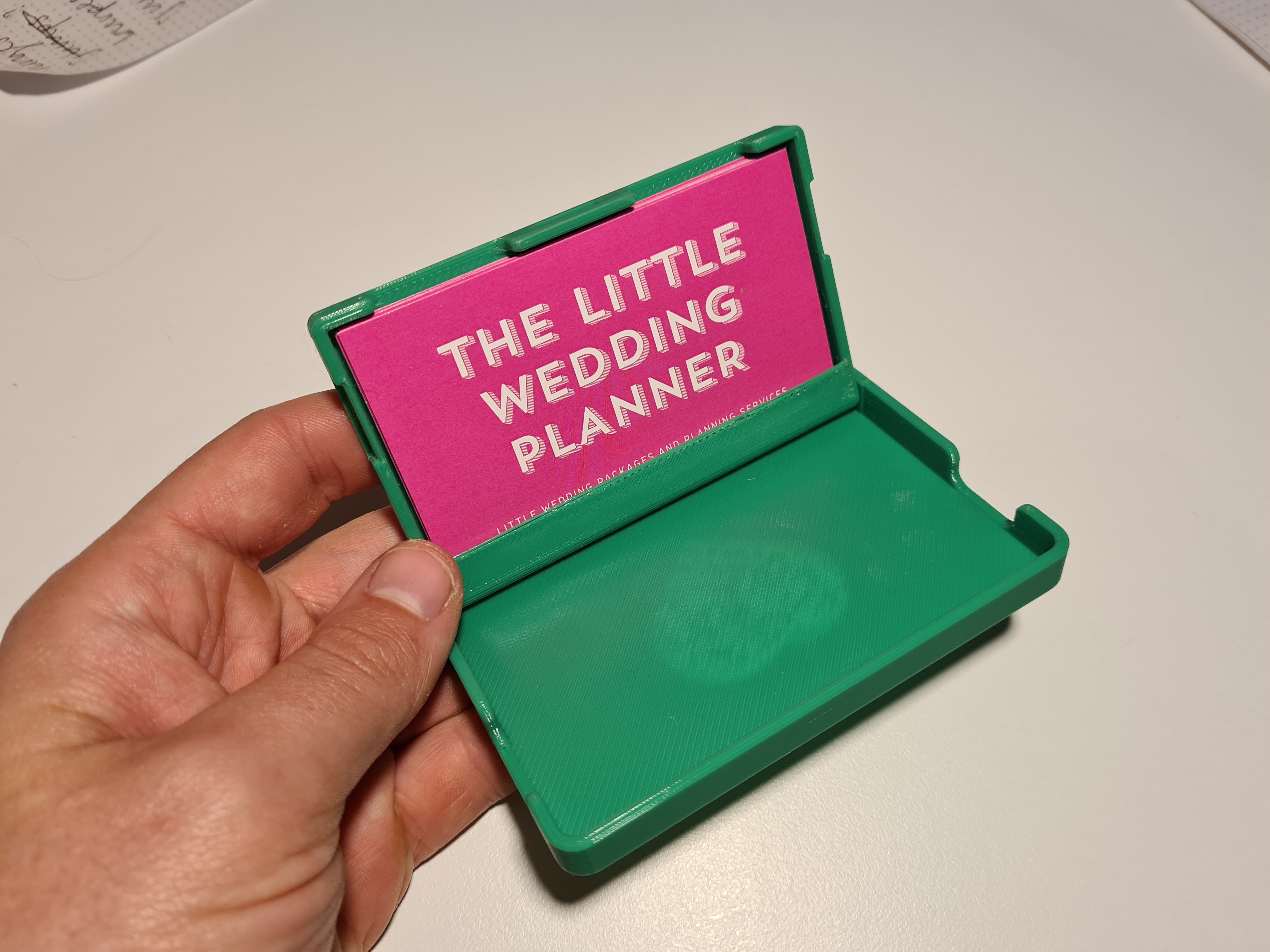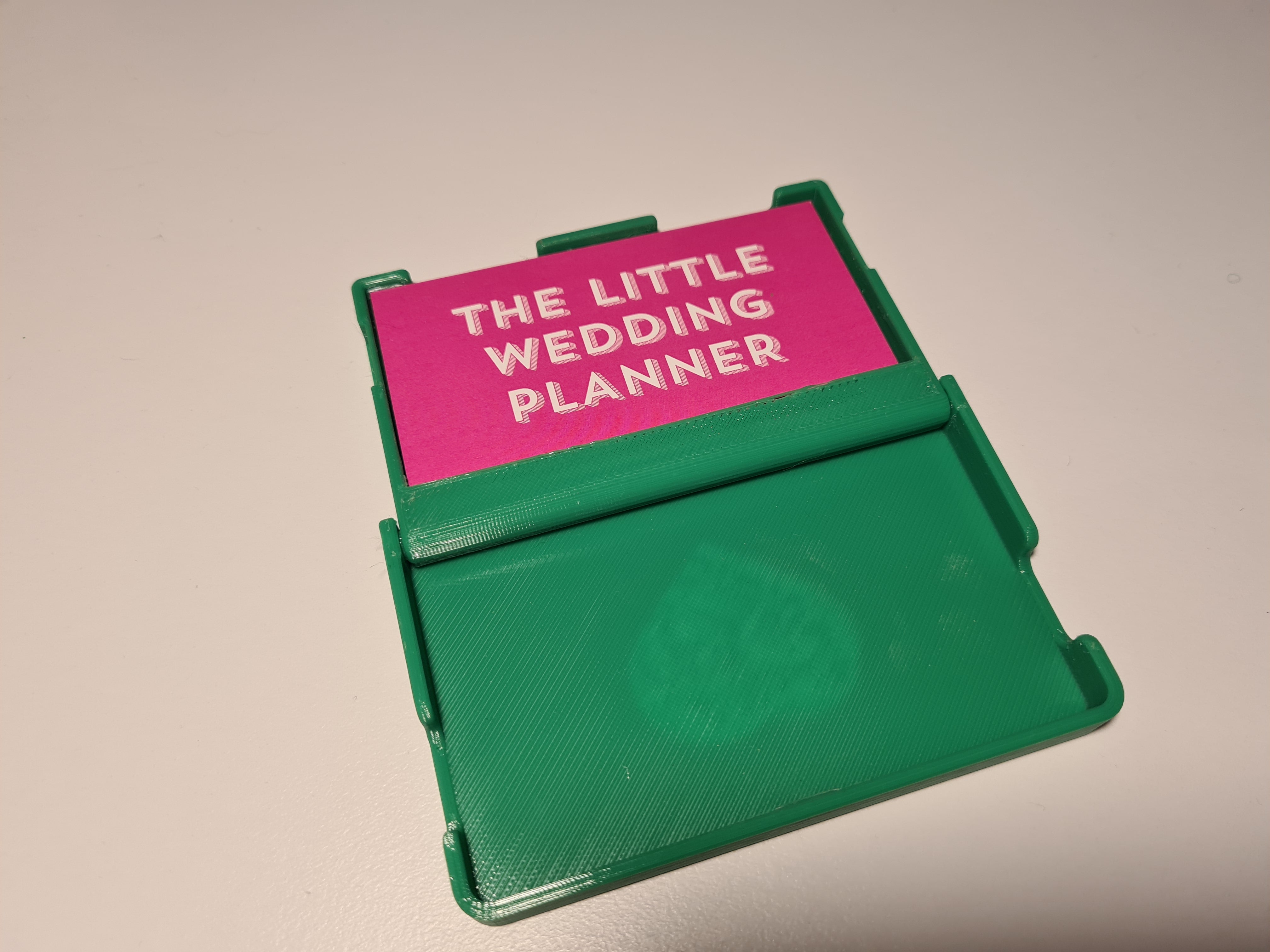 To małe etui na wizytówki chroni karty w kieszeni lub torbie. Zamyka się na zatrzask, dzięki czemu karty nie wysypują się do torby. Otwiera się w stylu klapki, aby odsłonić karty. Zawiera wersję wieczka z sercem i wersję pustą. Możesz umieścić na nim swoje logo lub nazwę.
