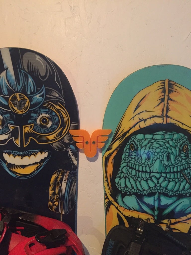 Uchwyt ścienny do snowboardu firmy Thrive Snowboards. Dwa z nich można wykorzystać do zawieszenia snowboardu pionowo na ścianie. Idealny sposób na bezpieczne i stylowe przechowywanie snowboardu.