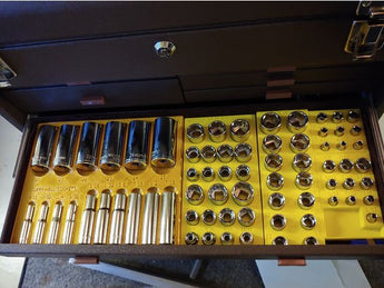 Ten modułowy organizer nasadek został zaprojektowany, aby wprowadzić porządek w Twoim warsztacie i zapewnić, że Twoje nasadki będą zawsze łatwo dostępne. System mieści kompletny zestaw nasadek zarówno w rozmiarach metrycznych, jak i SAE i obsługuje rozmiary napędów 1/4", 3/8" i 1/2". Jest on dostosowany do idealnego dopasowania do szuflad w skrzynce narzędziowej Kennedy, maksymalizując przestrzeń i zapewniając przejrzysty przegląd narzędzi.