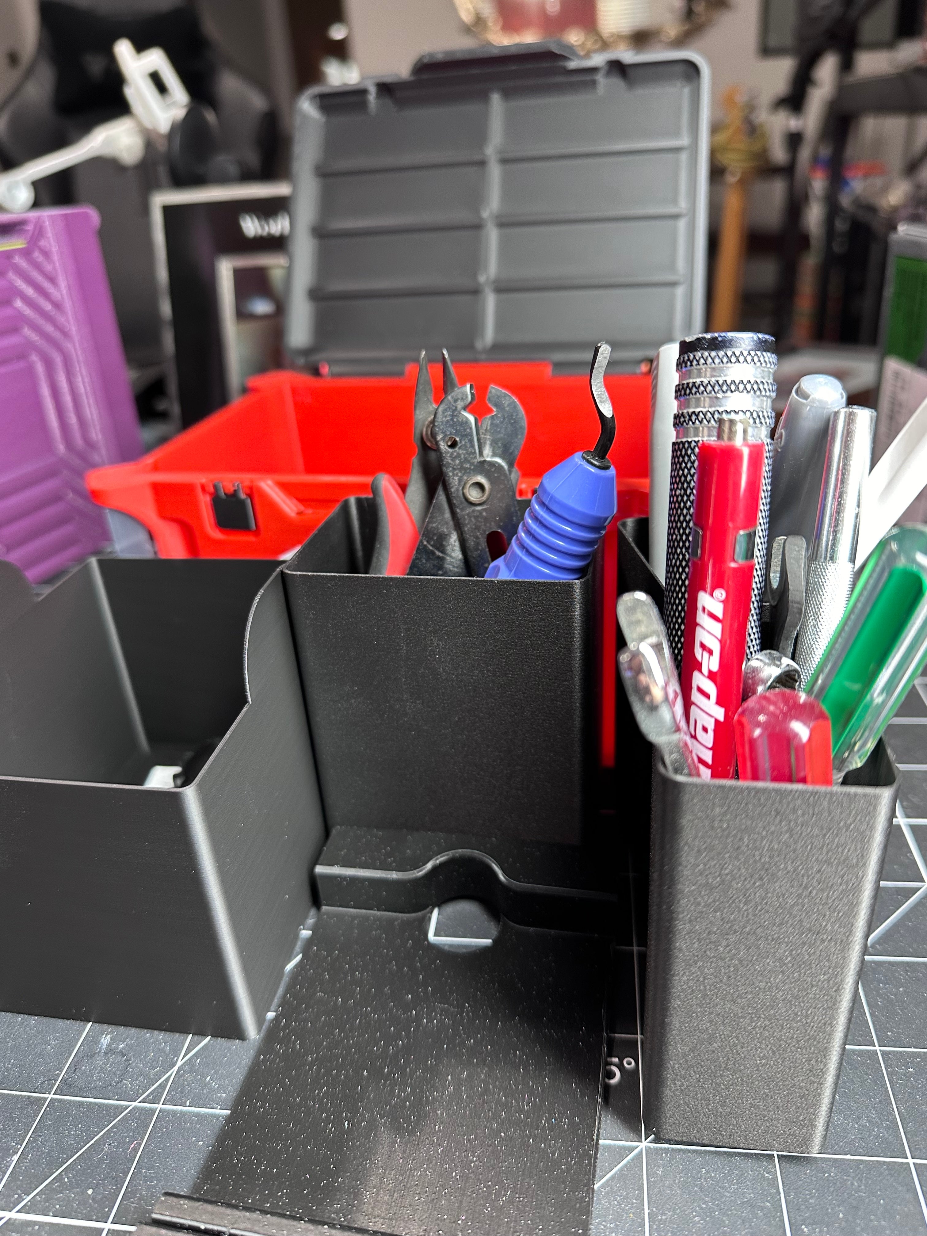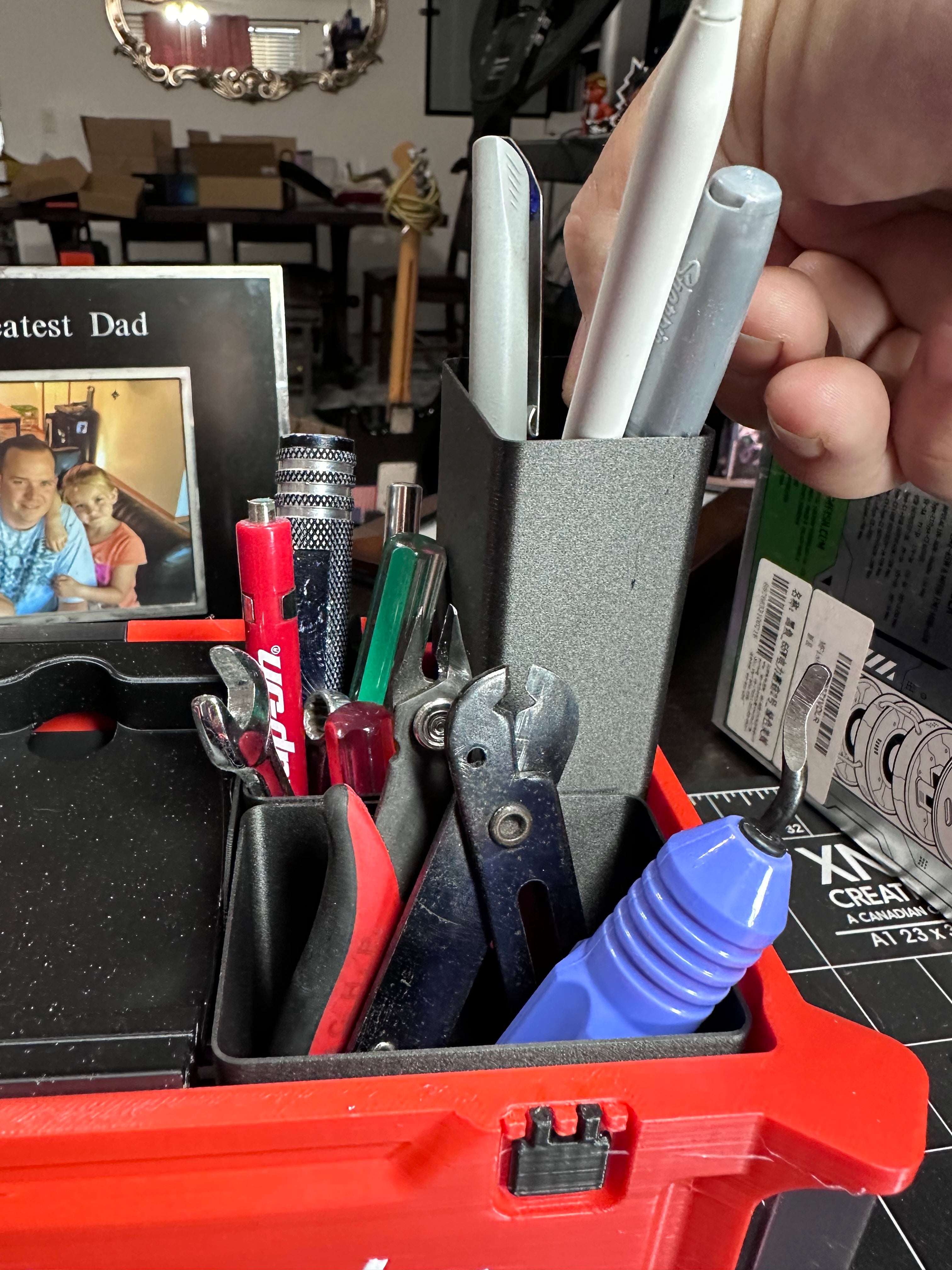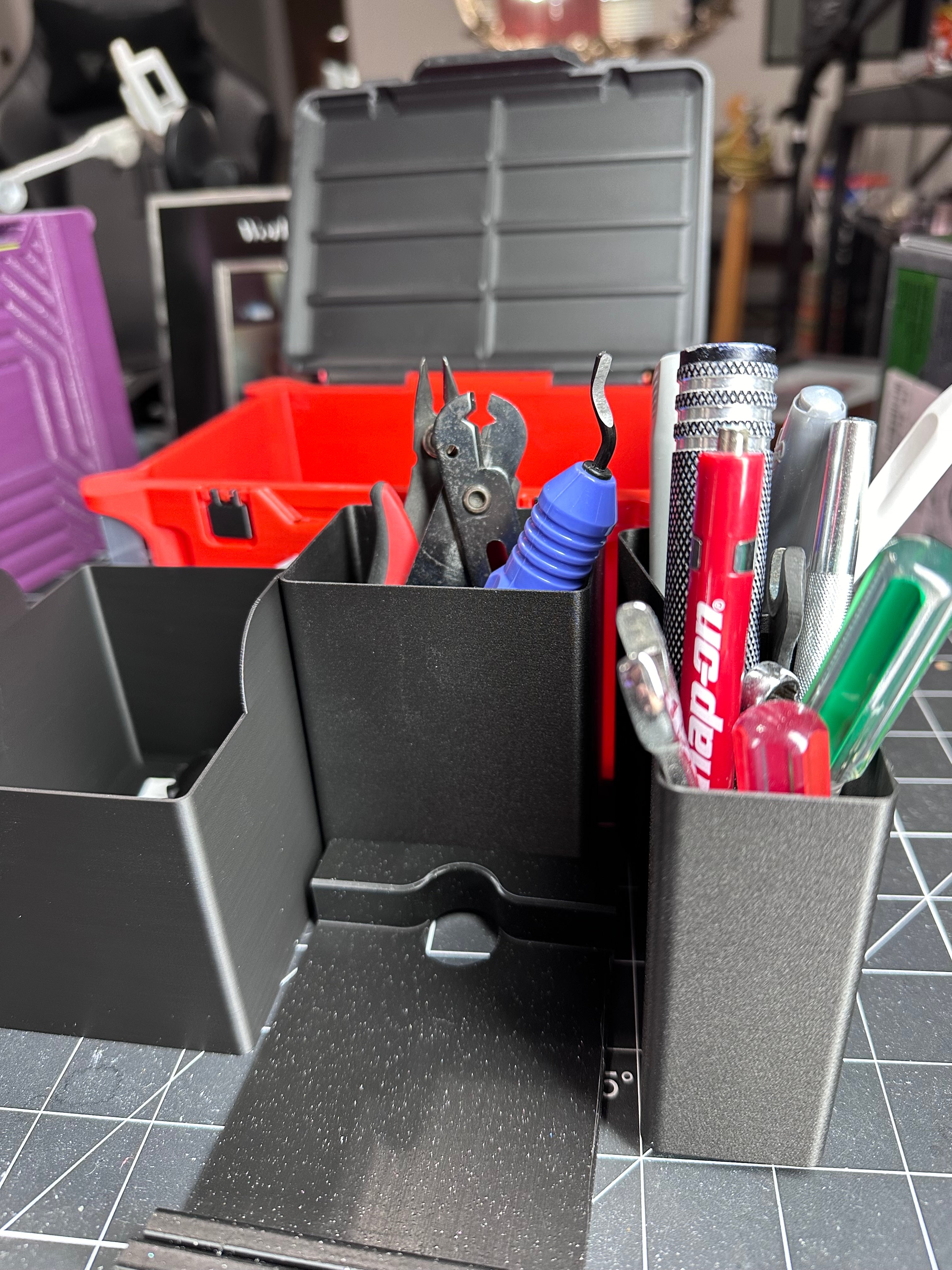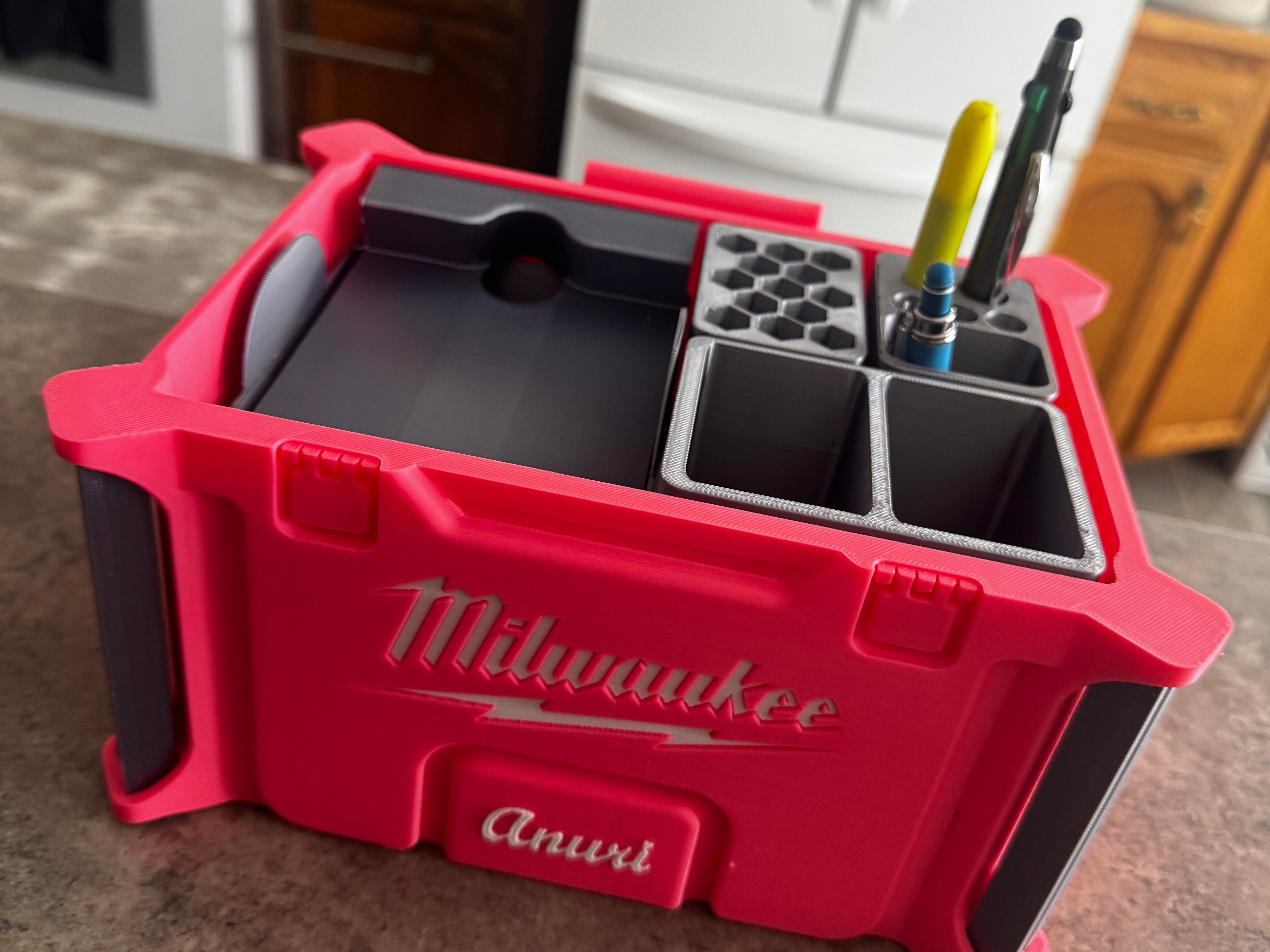 Utrzymuj porządek i organizację w miejscu pracy dzięki temu sprytnemu organizerowi na biurko inspirowanemu Milwaukee Packout. Ten funkcjonalny organizer został zaprojektowany, aby efektywnie przechowywać różnorodne artykuły biurowe i mniejsze narzędzia, dzięki czemu jest idealnym wyborem zarówno do biura, jak i do pokoju hobbystycznego. Dzięki różnym dołączonym wkładom możesz łatwo posortować długopisy, spinacze do papieru, igły i inne drobne przedmioty. Specjalna sprężynowa taca ma idealne wymiary dla standardowego bloku Post-it, a po podniesieniu odsłania przestronny obszar pod spodem na większe przedmioty, takie jak klucze, a nawet kompaktowy śrubokręt akumulatorowy. To sprawia, że jest to mocna alternatywa dla osób poszukujących solidnego i wszechstronnego rozwiązania organizacyjnego. Wybierz jeden kolor lub dostosuj go za pomocą wielu kolorów, aby dopasować go do swojego stylu. Ten organizer na biurko to praktyczny dodatek, który pomaga zmaksymalizować przestrzeń i uporządkować niezbędne przedmioty.