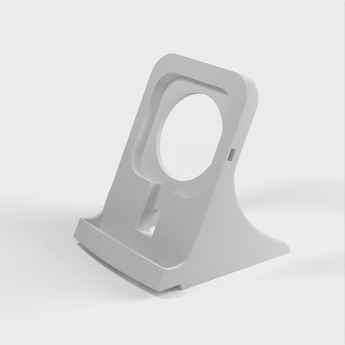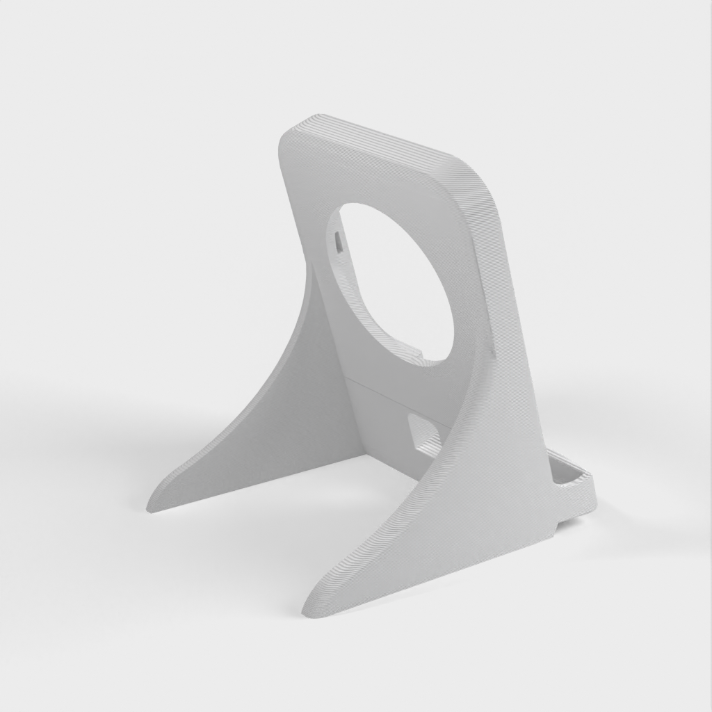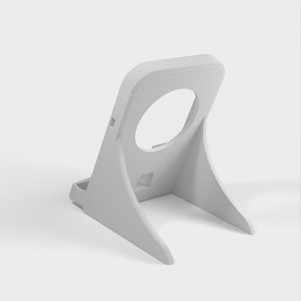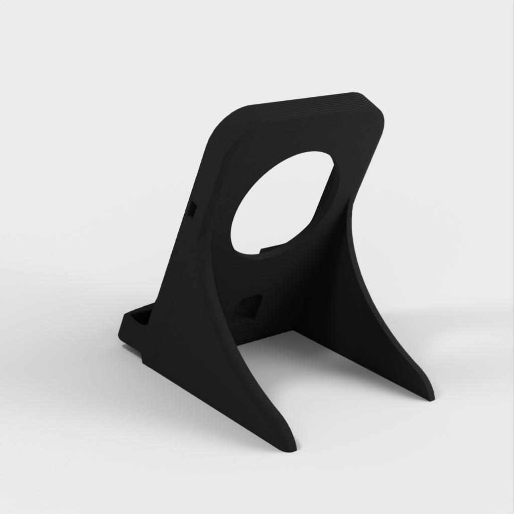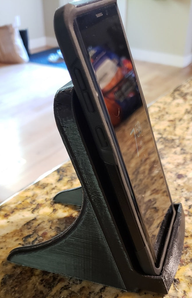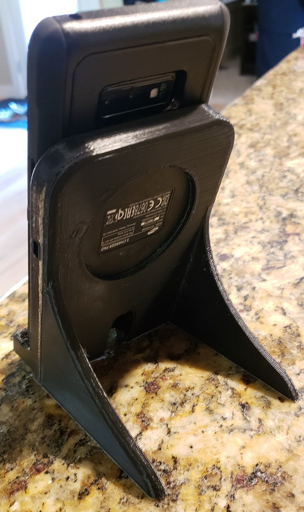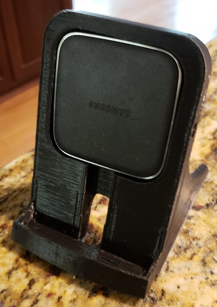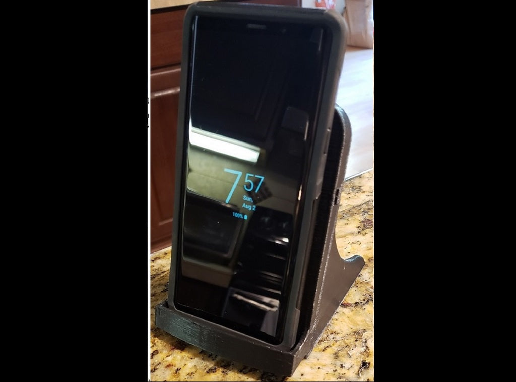Jest to podstawka do ładowarki Samsung Galaxy Note 9, zaprojektowana tak, aby pasowała do kwadratowej ładowarki Samsung EP-PG900IBE. Został on specjalnie dostosowany, aby pomieścić telefon w wytrzymałym etui Otterbox. Otwór głośnika został prawidłowo umieszczony na dole, a ładowarka została podniesiona, aby współpracować z wewnętrzną lokalizacją ładowania bezprzewodowego Note. Całe urządzenie jest nieco większe, a drukowanie zajmuje około 3,5 godziny z prędkością 80 mm/s przy wysokości warstwy 0,3 z 20% wypełnieniem.