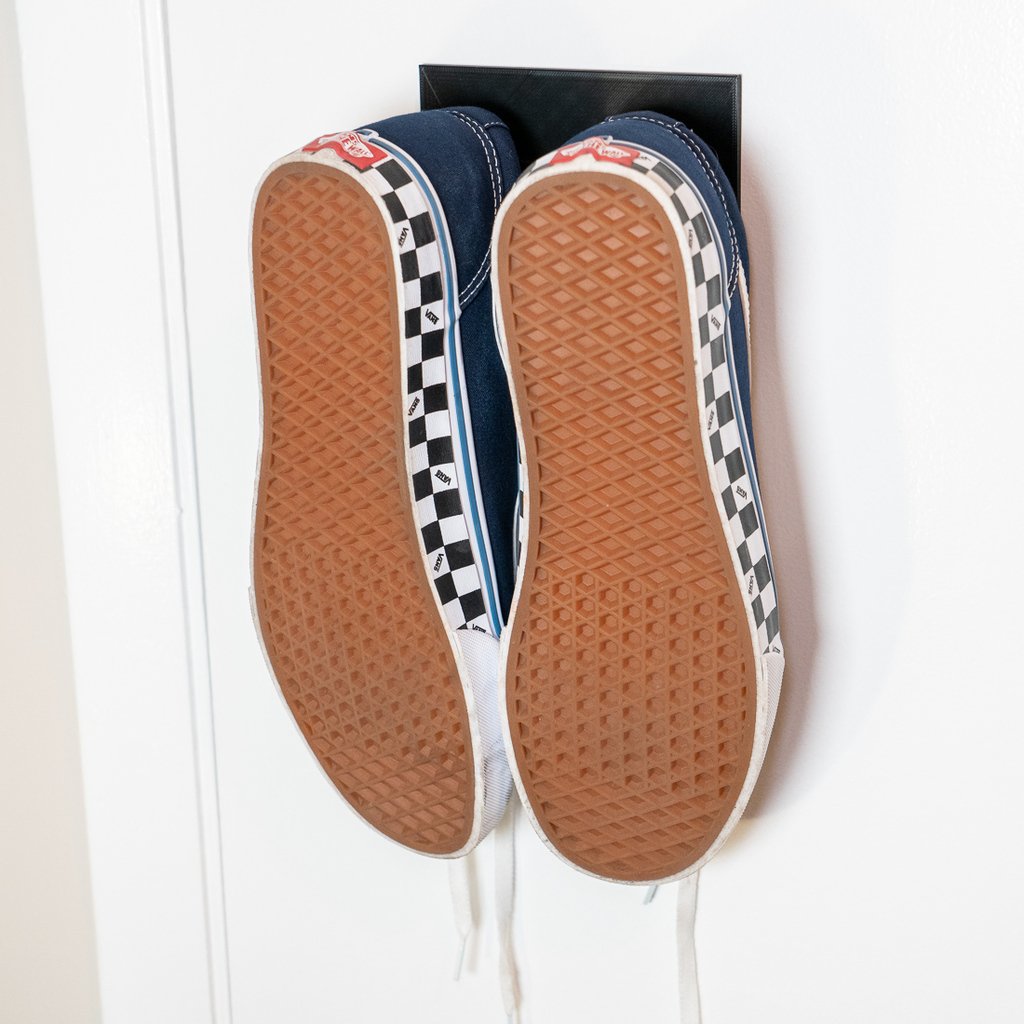 Półka na buty do montażu na ścianie. Półkę na buty można zamontować bezpośrednio na ścianie lub drzwiach za pomocą dwustronnej taśmy klejącej, co sprawia, że jest ona zdejmowana. Wykonana jest w taki sposób, że wieszak na taśmach klejących zwisa nieco poniżej półki na buty, dzięki czemu w razie potrzeby można je zdjąć.