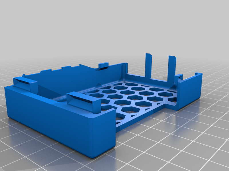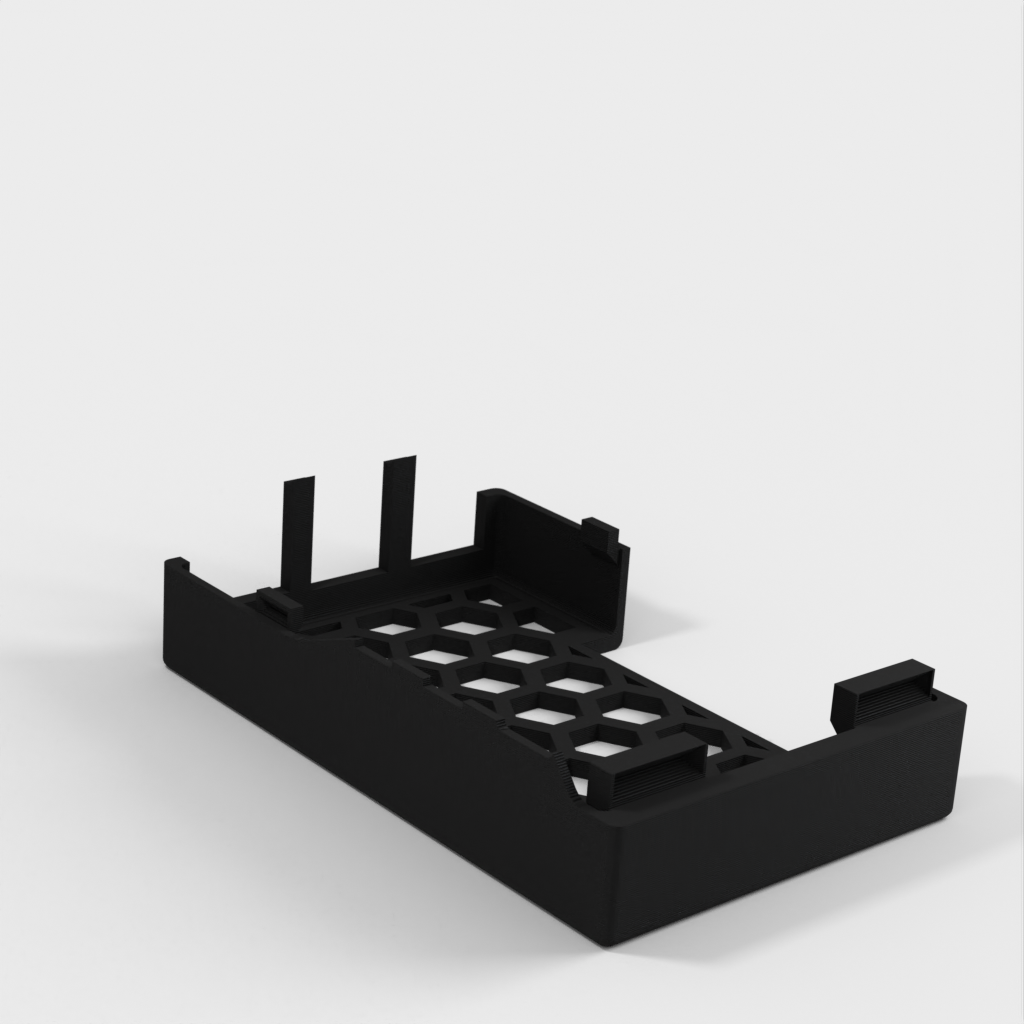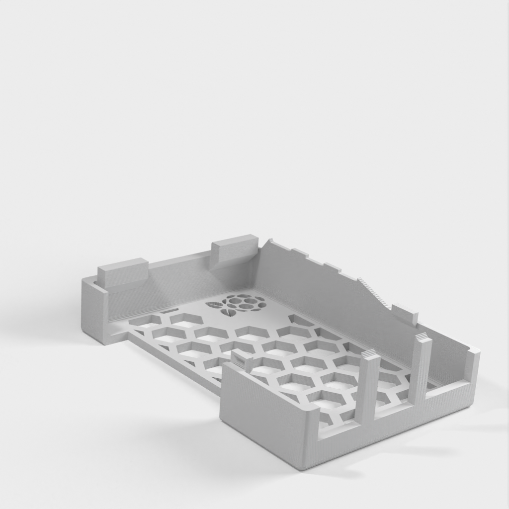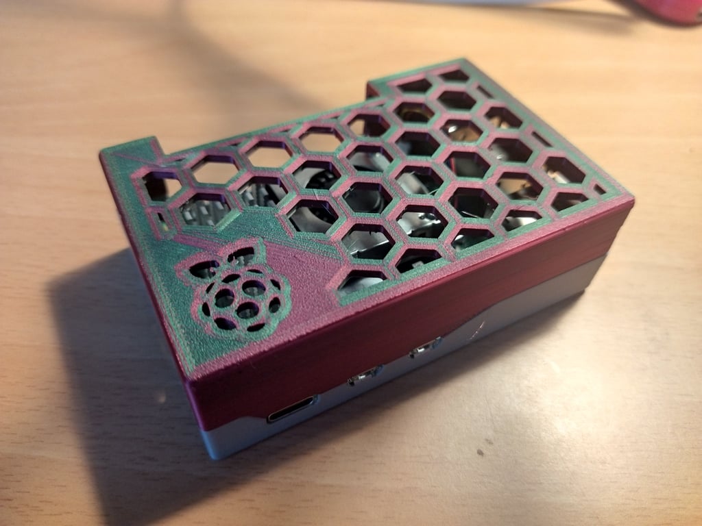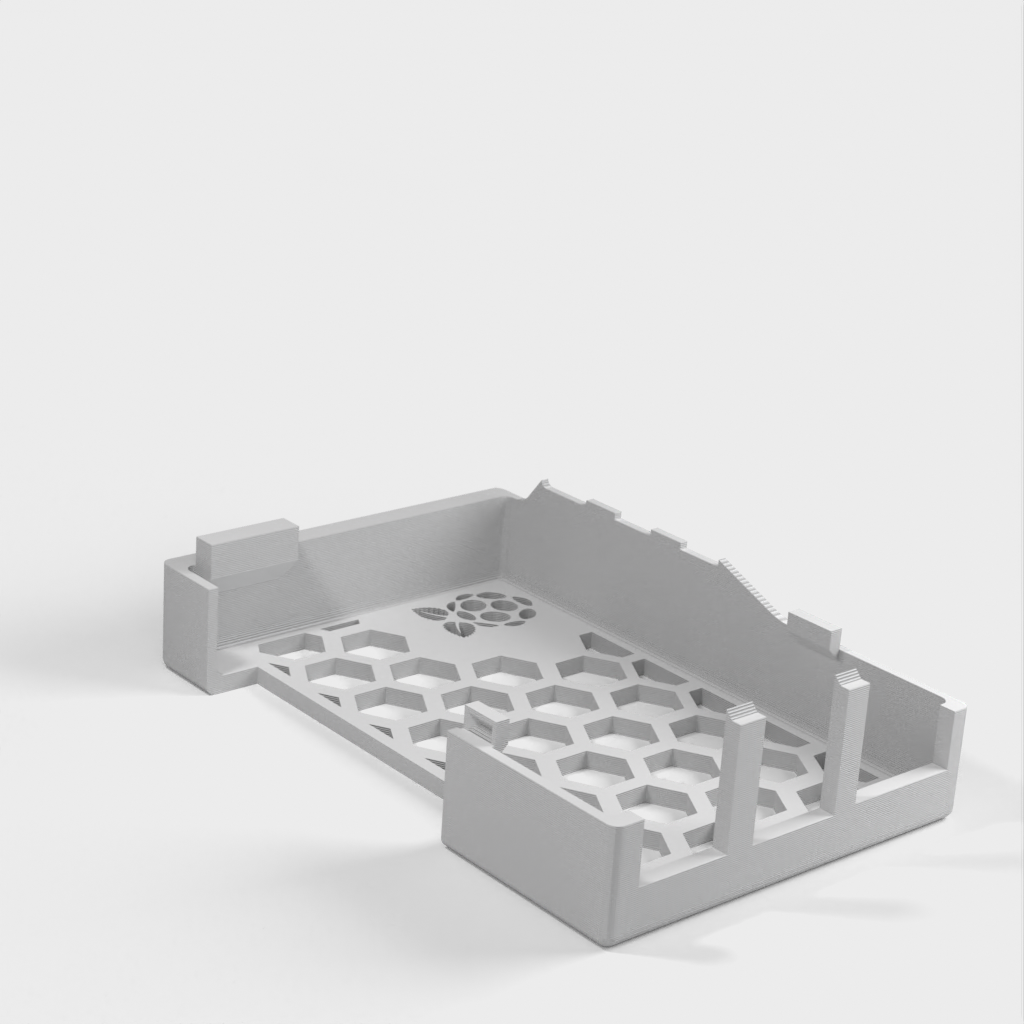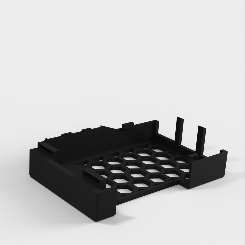 Obudowa Raspberry Pi 5 z odsłoniętymi pinami GPIO i sześciokątnymi otworami dla lepszego chłodzenia. Jeśli masz płytę chłodzącą i oficjalny wentylator podobny do tego na zdjęciu, lepiej będzie użyć 'Pins-Top-Hexed-With-Logo-HeatSink-Cutoff.stl'.