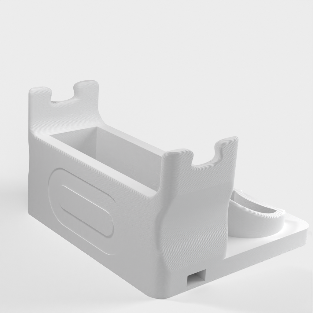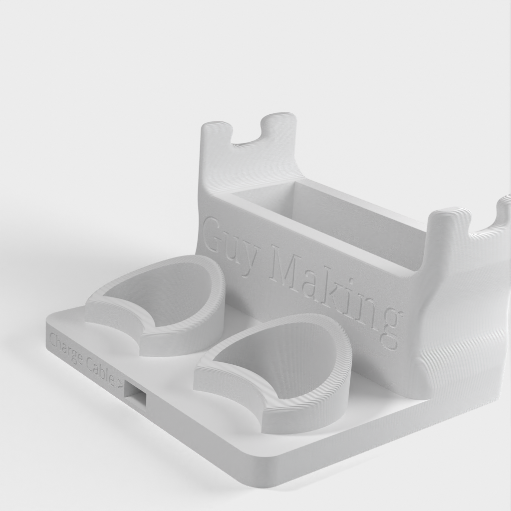 To jest stojak na Oculus Quest, który zapewnia miejsce dla zestawu słuchawkowego i kontrolerów. Posiada otwór na kabel ładujący i otwór na górze do przechowywania różnych akcesoriów.