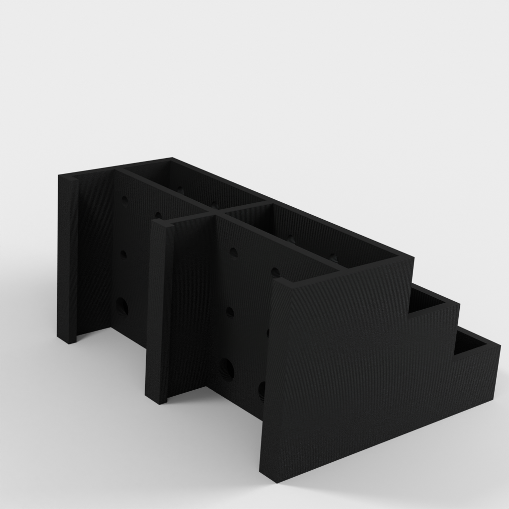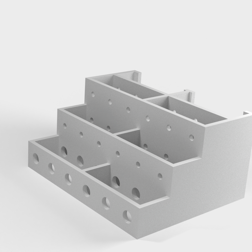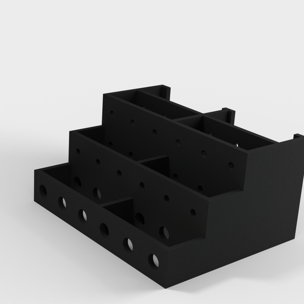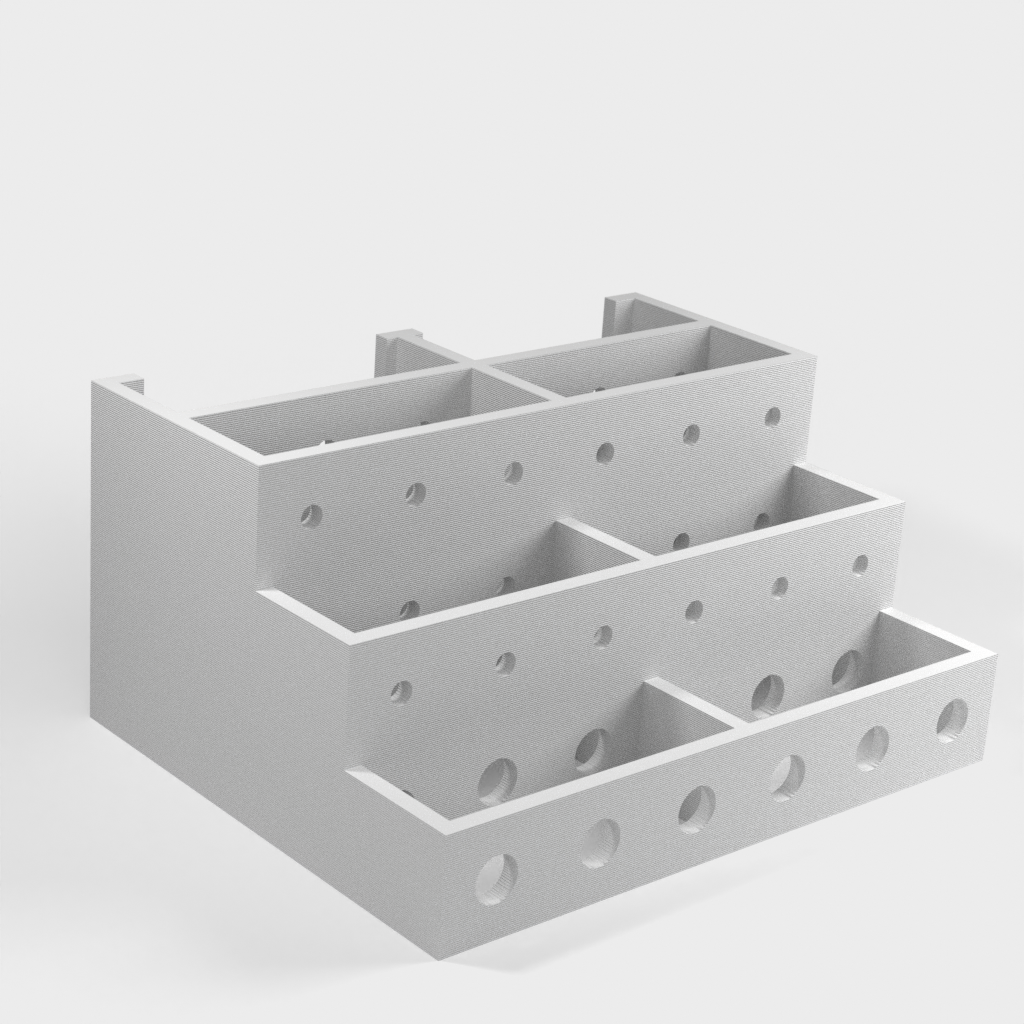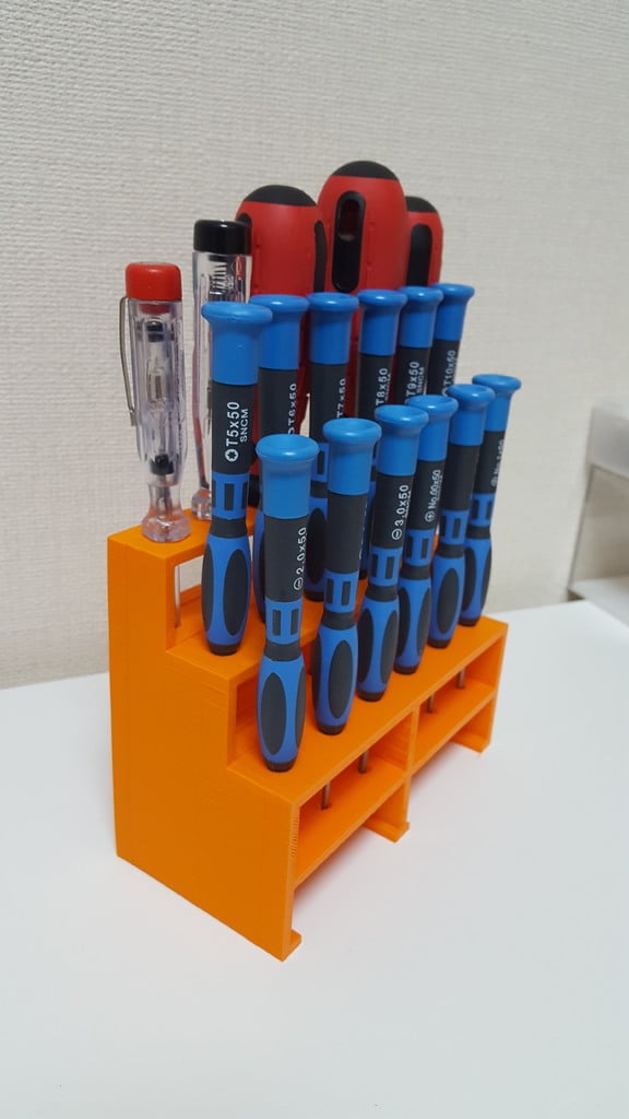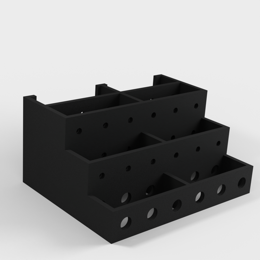 Dzięki temu uchwytowi na śrubokręt możesz łatwo i praktycznie uporządkować swoje śrubokręty. Uchwyt ma miejsce na 3 zestawy po 6 śrubokrętów, dzięki czemu zawsze masz uporządkowany przegląd swoich narzędzi. Każdy śrubokręt ma swoje miejsce, z trzema poziomami dla śrubokrętów krótkich, średnich i długich. Wersja do montażu na ścianie jest dostępna tutaj: https://www.thingiverse.com/thing:1240992