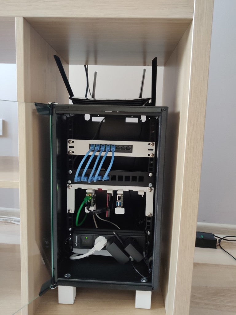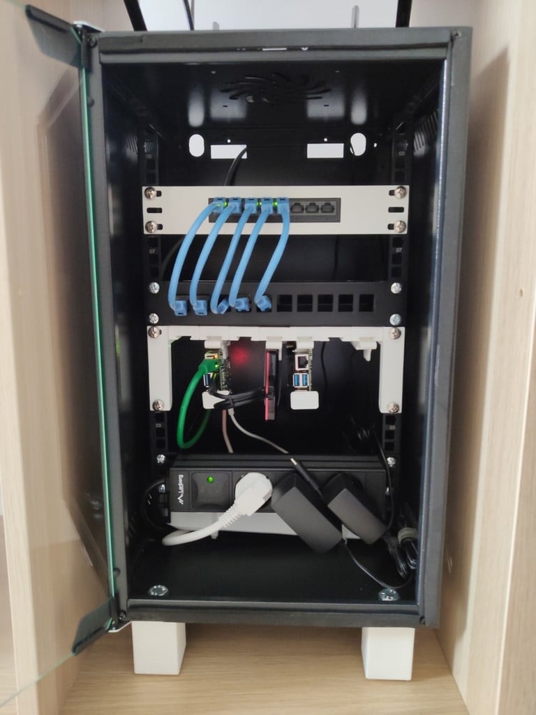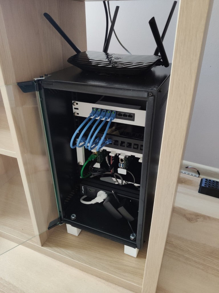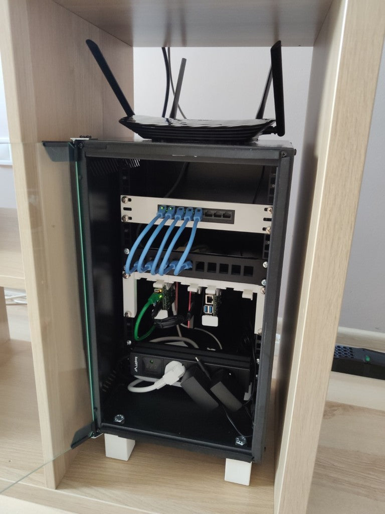 Domowy stojak serwerowy przeznaczony do użytku z obudową 10". Wykonany ze specjalnych nóg do podnoszenia pasujących do półki IKEA Kallax. Idealny do organizowania jednostek serwerowych lub konfiguracji Raspberry Pi.