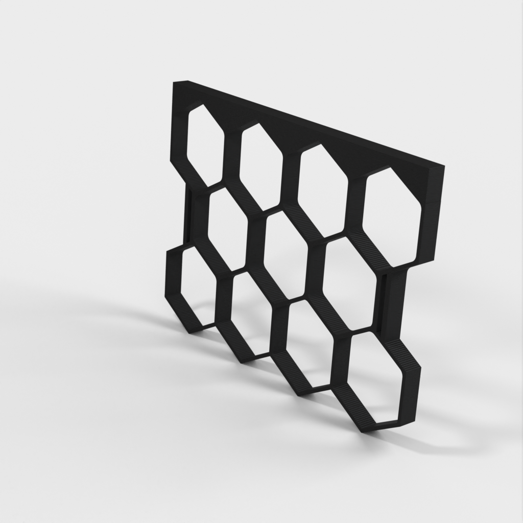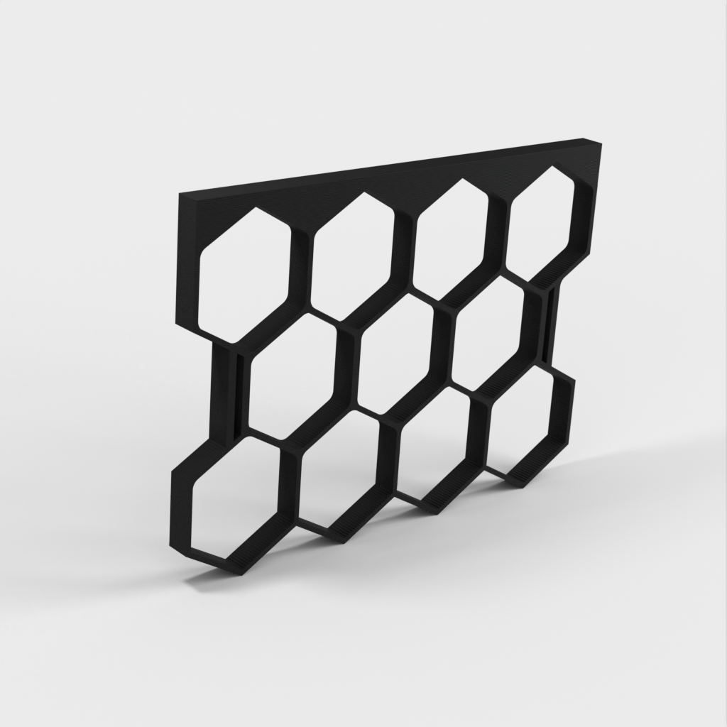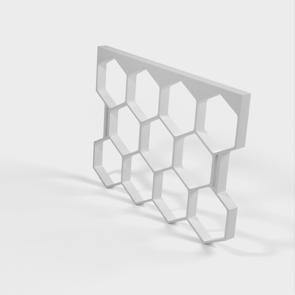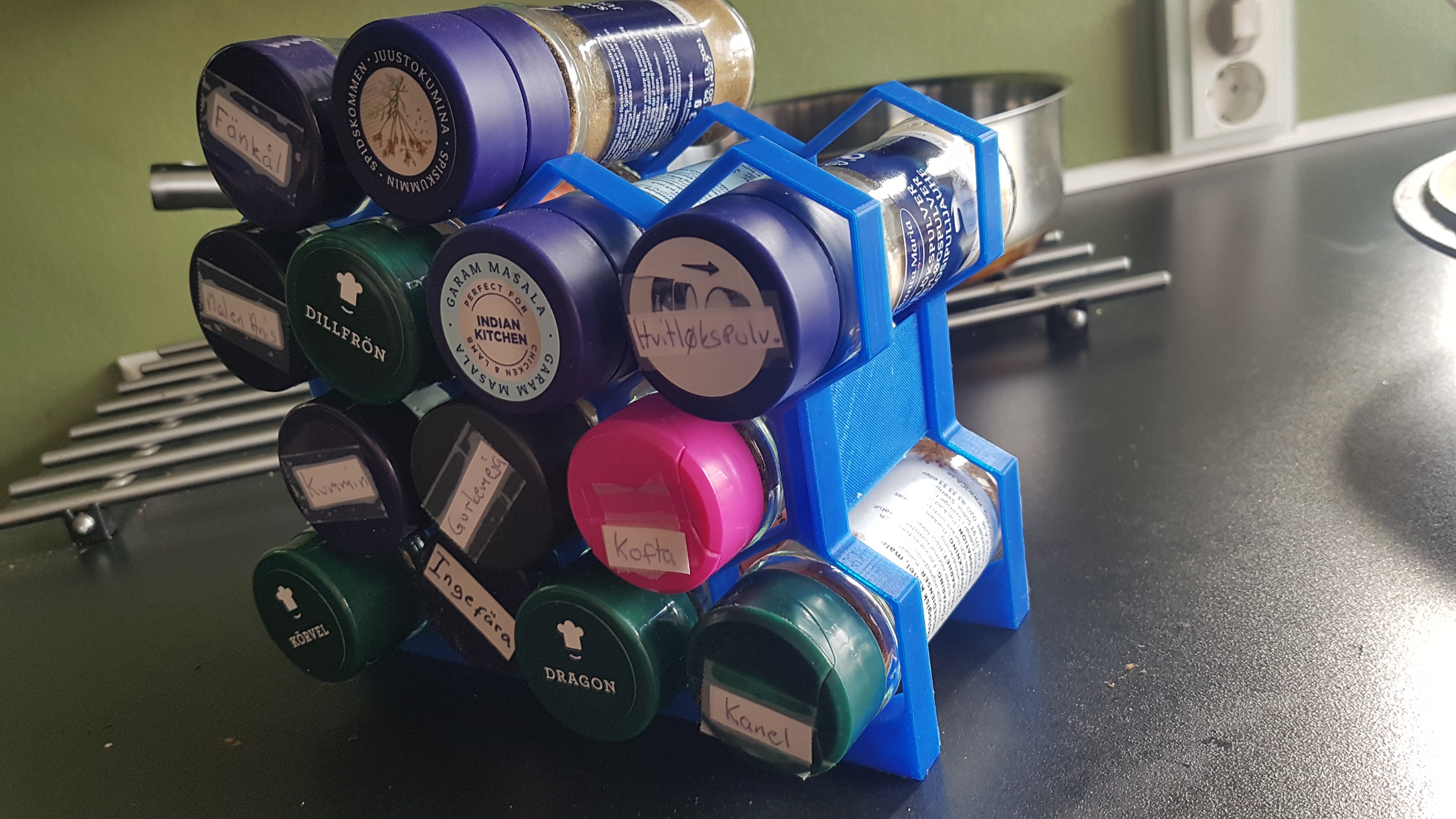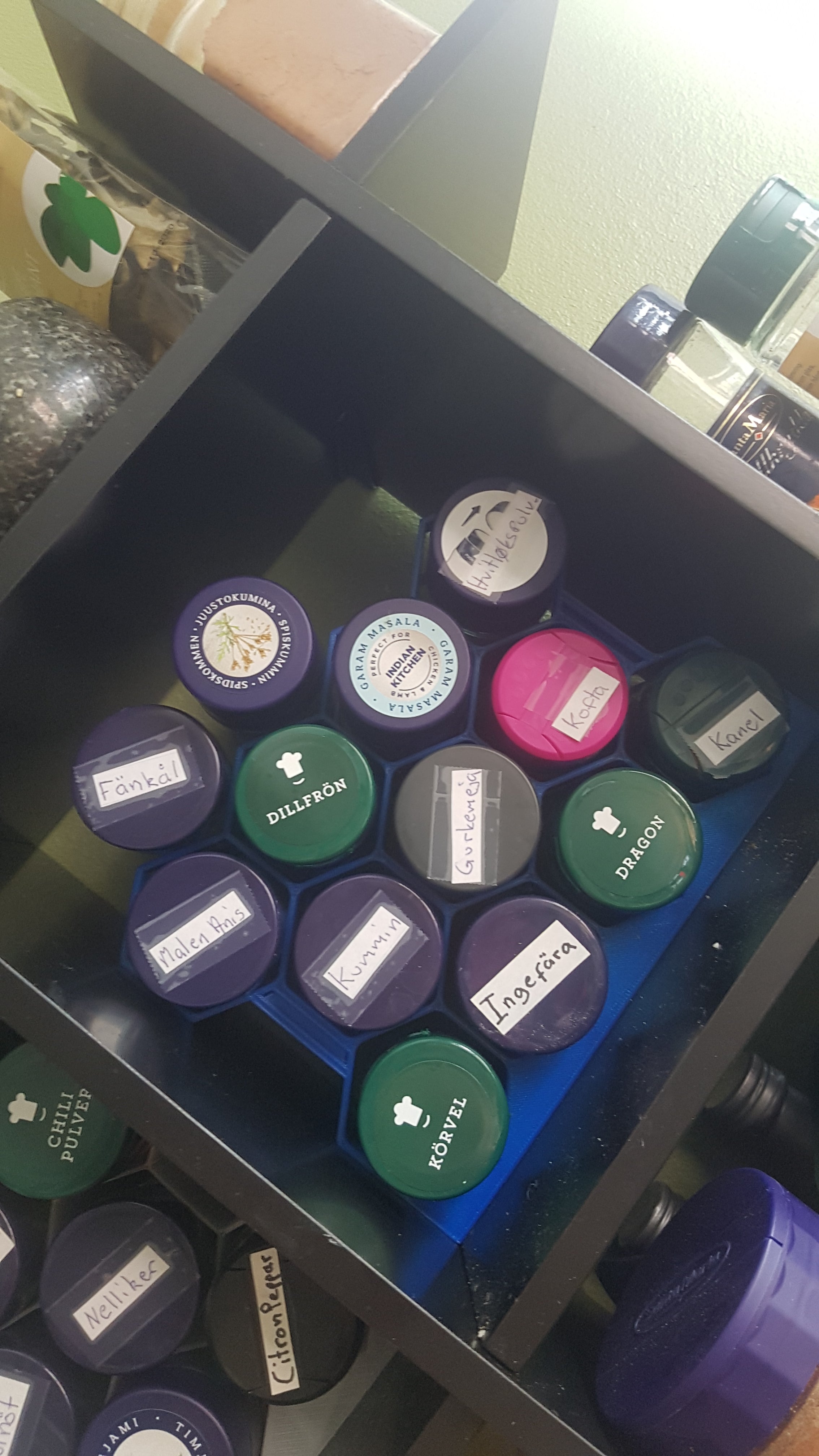 Jest to sześciokątny stojak na przyprawy zaprojektowany w celu zaoszczędzenia miejsca na półce poprzez układanie pojemników na przyprawy pionowo. Łatwiej jest również znaleźć konkretną przyprawę, jeśli napiszesz jej nazwę na pokrywie pojemników. Do złożenia półki potrzebne są 2 zaślepki i 2 uchwyty na przyprawy3.
