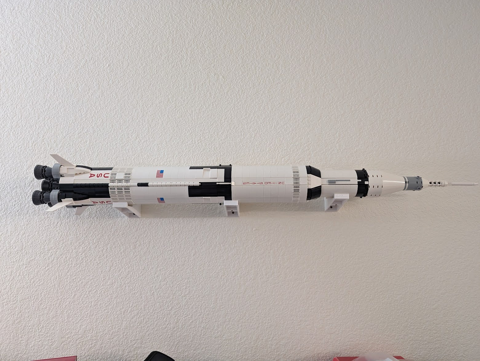 - Zaprojektowany do poziomego montau modelu rakiety LEGO Saturn V na ścianie.
