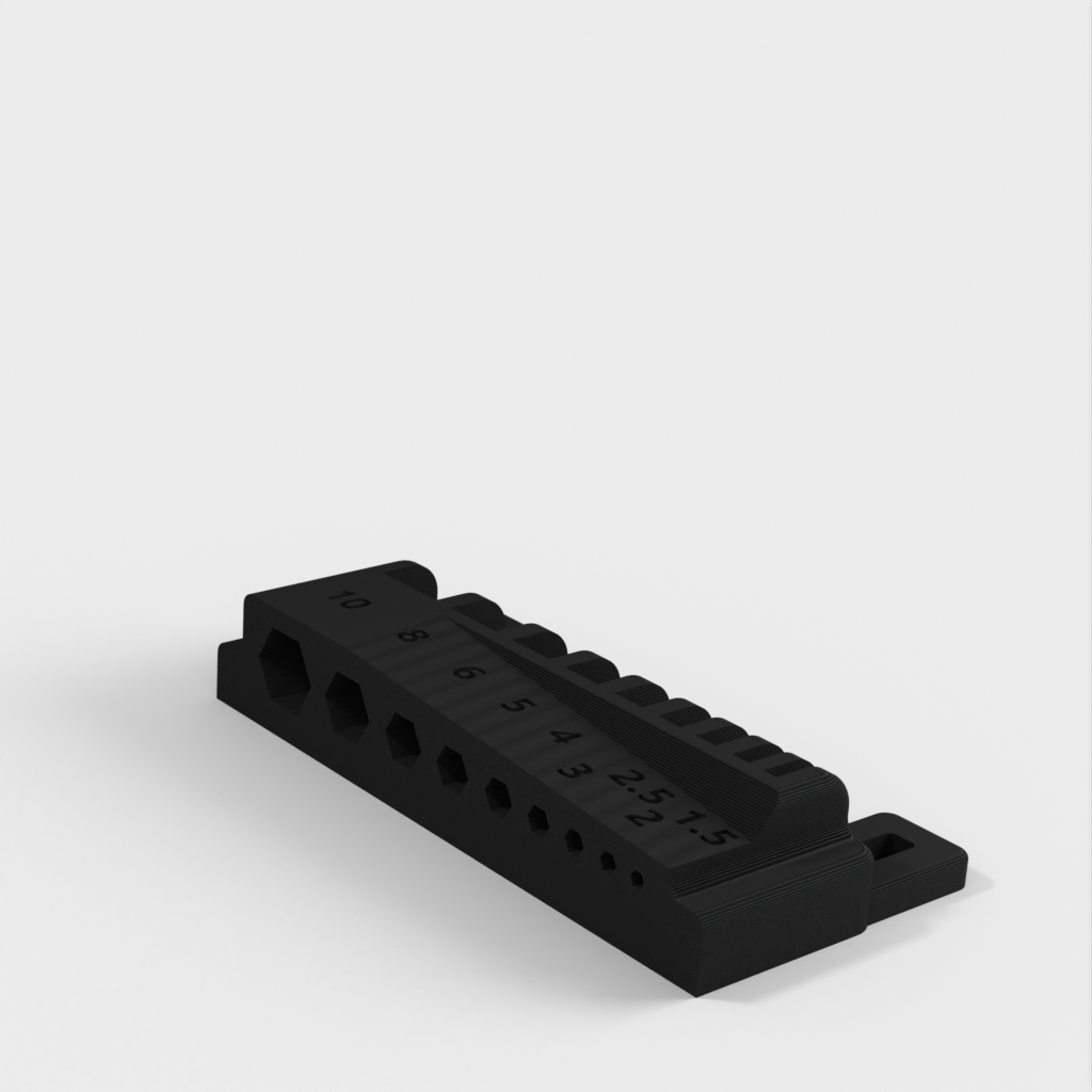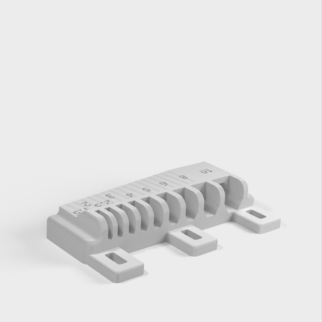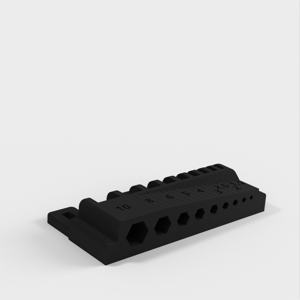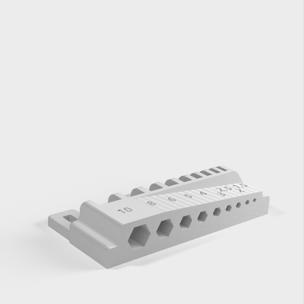 Uchwyt na klucze sześciokątne Skadis to zestaw breloków zaprojektowanych z myślą o obsłudze kluczy sześciokątnych. Posiada numery wskazujące rozmiary, co ułatwia identyfikację i można go łatwo umieścić na dowolnym panelu IKEA Skådis/Skadis. Ten projekt jest nieco bardziej fantazyjny, ponieważ część przodu jest ścięta pod kątem, aby zaoszczędzić trochę materiału.