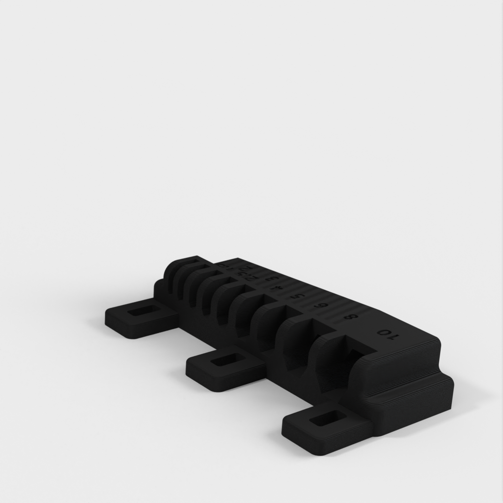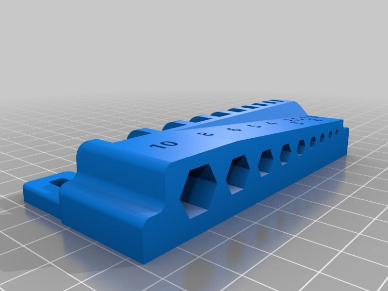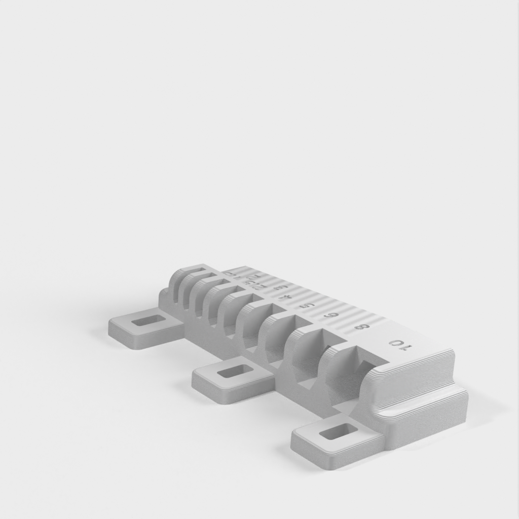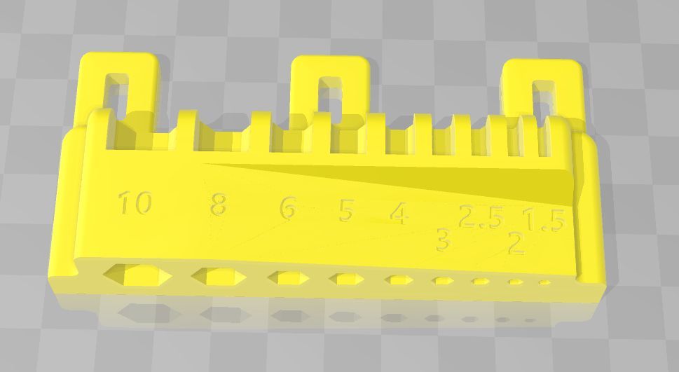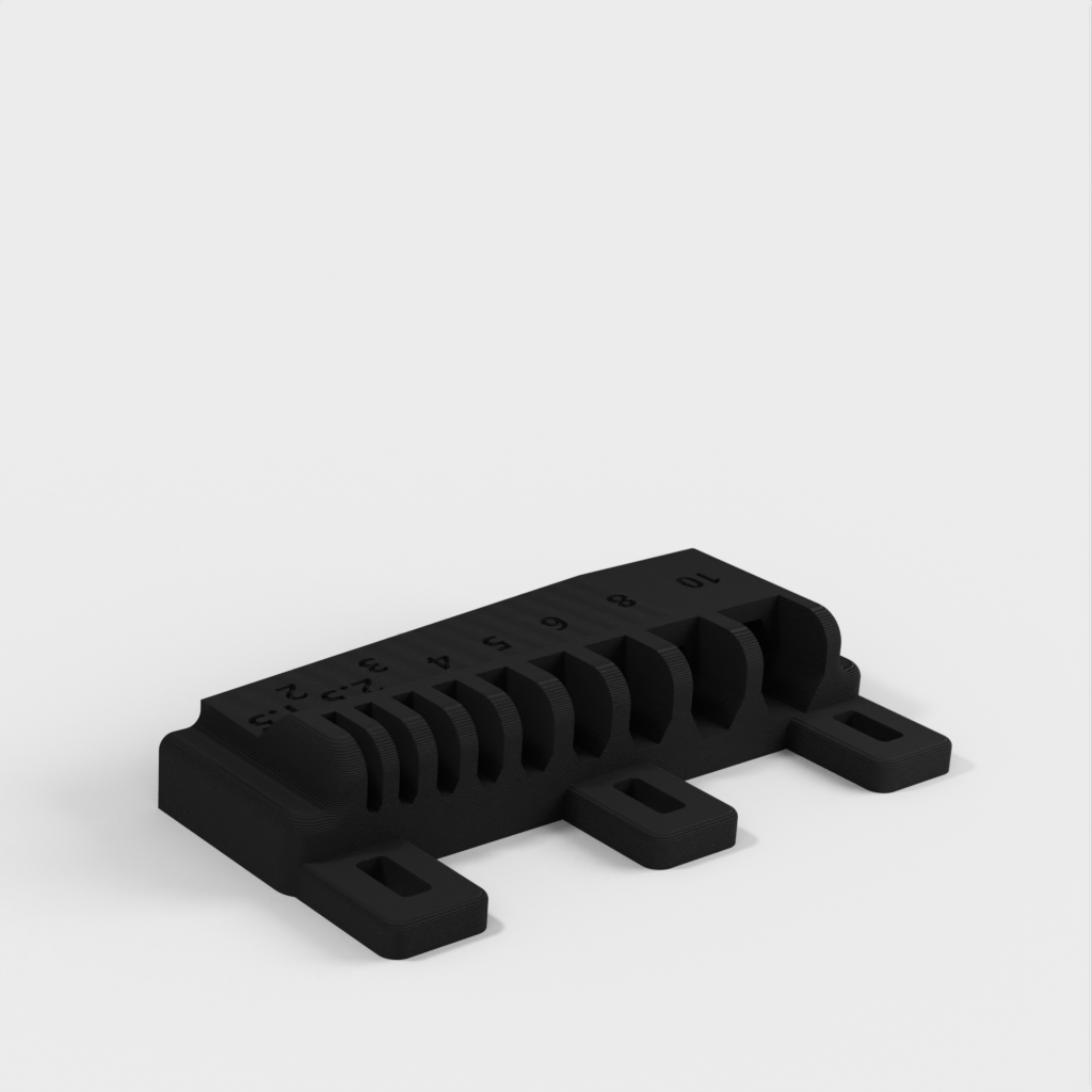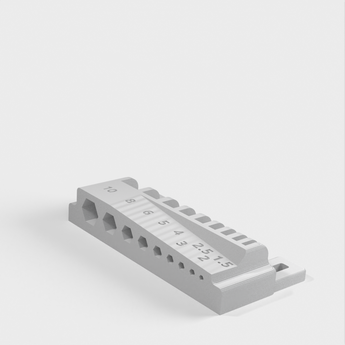 Uchwyt na klucze sześciokątne Skadis to zestaw breloków zaprojektowanych z myślą o obsłudze kluczy sześciokątnych. Posiada numery wskazujące rozmiary, co ułatwia identyfikację i można go łatwo umieścić na dowolnym panelu IKEA Skådis/Skadis. Ten projekt jest nieco bardziej fantazyjny, ponieważ część przodu jest ścięta pod kątem, aby zaoszczędzić trochę materiału.