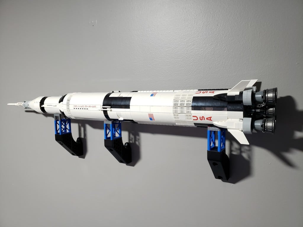 Ścienny stojak do modelu Lego Saturn V. Posiada funkcje do trzymania osi Lego, które łączą niebieski stojak dostarczany z modelem. Idealny do wyeksponowania modelu Lego Saturn V na ścianie.