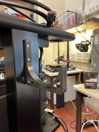 Został zaprojektowany tak, aby zachować stabilność i utrzymywać kable na miejscu, nawet gdy wózek jest w ruchu. Mocowanie odbywa się łatwo i bezpiecznie za pomocą dwóch śrub z łbem walcowym M3, co zapewnia niezawodny montaż. Ten hak na kabel jest funkcjonalnym elementem, który przyczynia się do bardziej zorganizowanego i wydajnego miejsca pracy, w którym przewody są starannie zebrane i w zasięgu ręki.