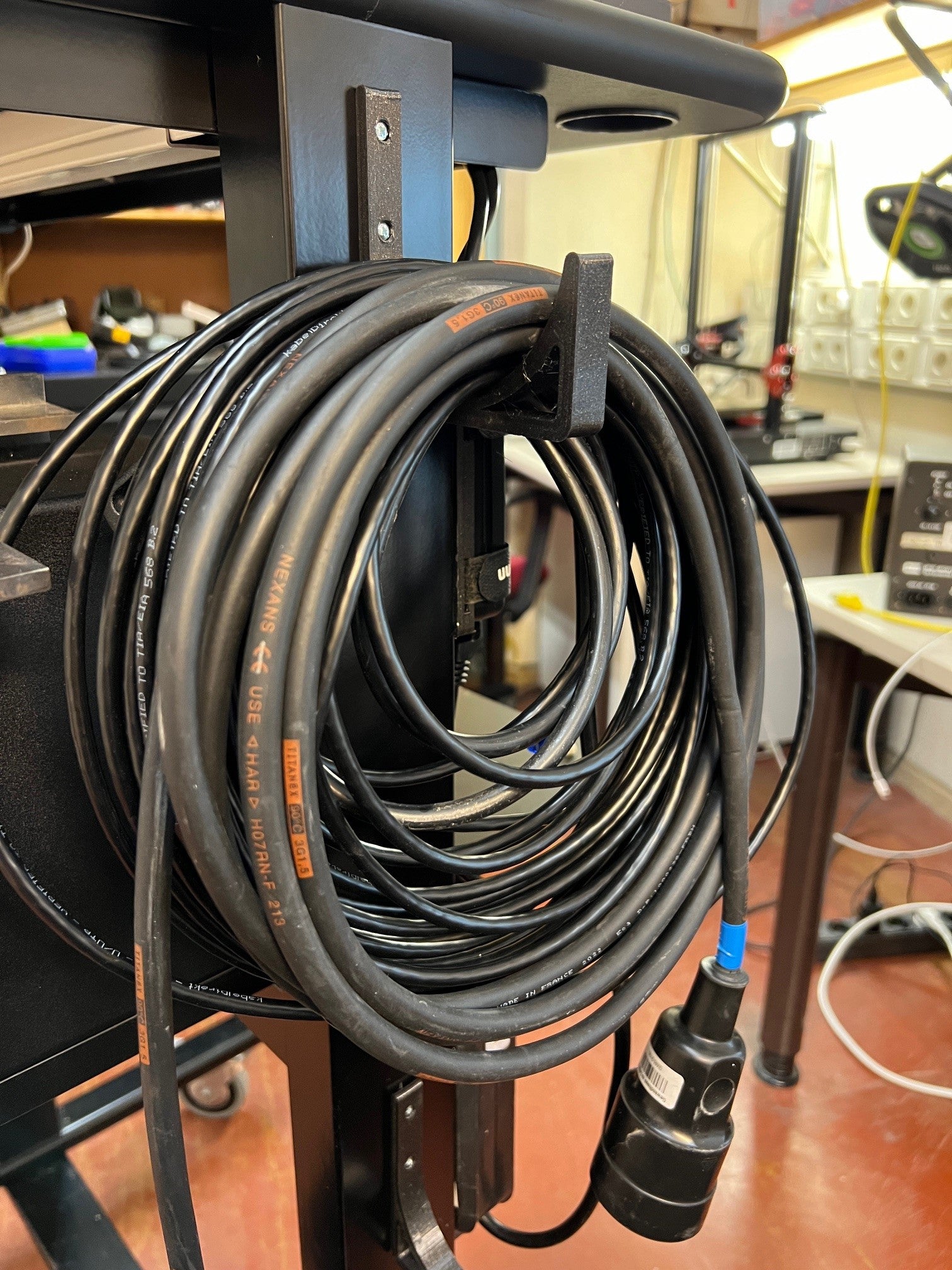 Ten solidny uchwyt na kabel został zaprojektowany, aby zapewnić praktyczne i bezpieczne rozwiązanie do organizacji kabli, szczególnie na wózkach. O wymiarach około 90x90 mm oferuje wystarczająco dużo miejsca, aby śledzić różne typy kabli, takie jak kable XLR i zasilające, dzięki czemu idealnie nadaje się do użytku w studiach, warsztatach lub podczas imprez.