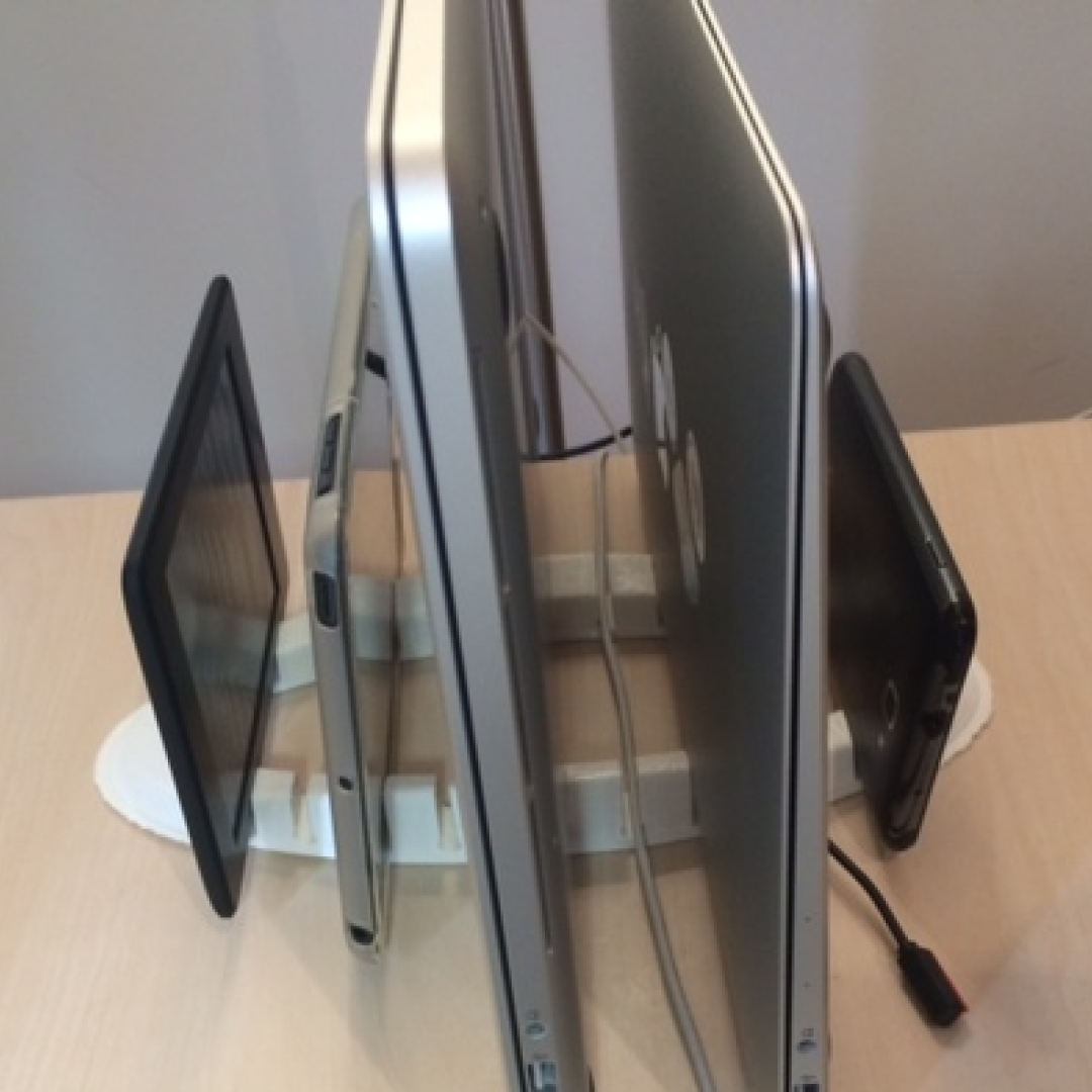 Pionowy stojak do przechowywania 5 urządzeń Apple. Na przykład Macbook Pro Retina 15, Macbook Air 13, Kindle Paperwhite, iPad i iPad mini. Posiada również szczeliny na kable, dzięki czemu kable ładujące nie wylatują z biurka po odłączeniu.