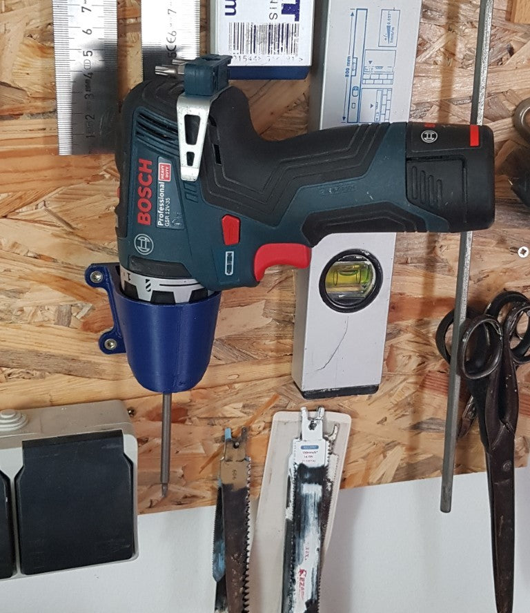 Uchwyt na narzędzia do wiertarki Bosch GSR 12V 15/20/35. Przeznaczony do przechowywania bitów lub wiertarki, gdy nie jest używana. Został zaprojektowany w taki sposób, aby można było łatwo sięgnąć po narzędzie i używać go. Łatwo go chwycić, a także łatwo i szybko schować.