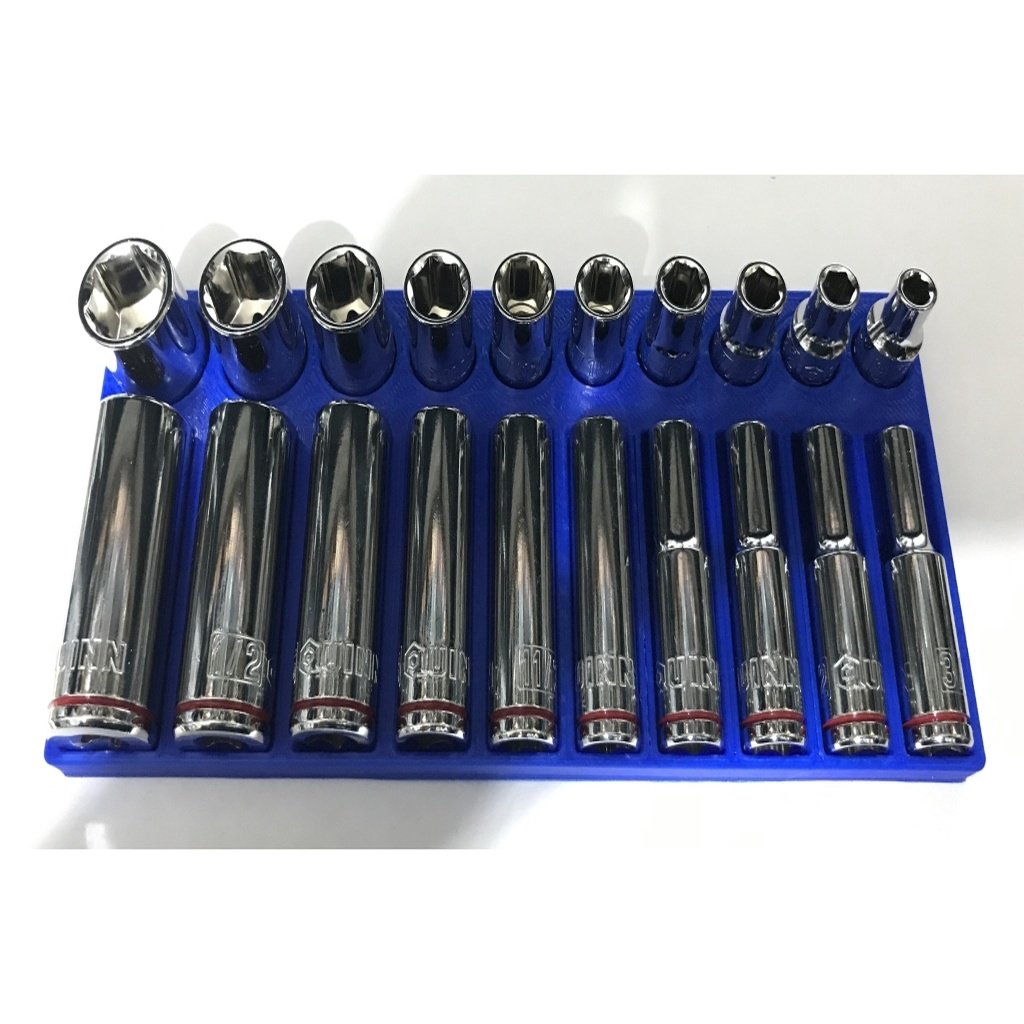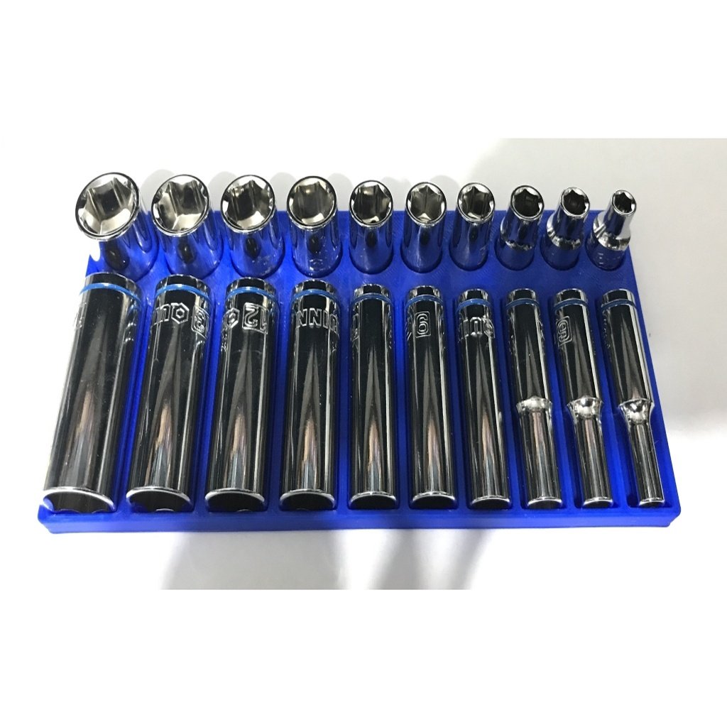 Te organizery do kluczy nasadowych 1/4" zostały zaprojektowane w celu poprawy organizacji w skrzynce narzędziowej zarówno dla rozmiarów metrycznych, jak i SAE. Pomagają one w systematycznym przechowywaniu kluczy nasadowych, dzięki czemu łatwiej je znaleźć i uzyskać do nich dostęp podczas pracy. Konstrukcja obsługuje zarówno standardowe, jak i głębokie klucze nasadowe.
