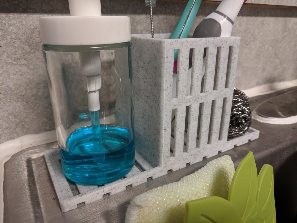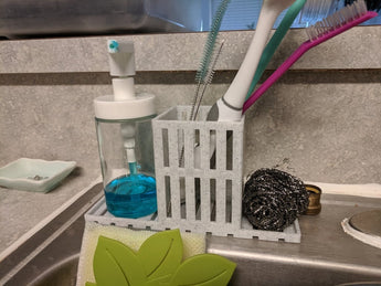 Ten pojemnik na zlew kuchenny oferuje praktyczne i stylowe rozwiązanie do przechowywania płynu do mycia naczyń i gąbek przy zlewie. Został zaprojektowany ze zintegrowanymi otworami drenażowymi i wentylacyjnymi, które skutecznie odprowadzają nadmiar wody i wspomagają cyrkulację powietrza. Pomaga to utrzymać czystość i higienę środków czystości oraz obszaru zmywania. Pojemnik został zaprojektowany tak, aby stał stabilnie, ale dla dodatkowego bezpieczeństwa można łatwo dodać elementy antypoślizgowe na spodzie. Dzięki funkcjonalnej i dyskretnej konstrukcji ten uchwyt pasuje do większości środowisk kuchennych i przyczynia się do bardziej zorganizowanego i wydajnego miejsca do zmywania.