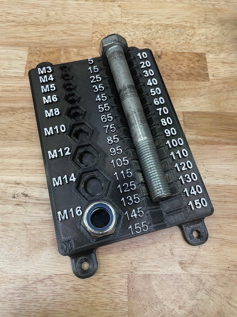 To narzędzie do sortowania śrub zostało zaprojektowane, aby pomóc w organizacji śrub i nakrętek w standardzie metrycznym. Działa jako skuteczne narzędzie pomiarowe, które pozwala na identyfikację rozmiarów od M3 do M16, a także długości od 5 mm do 155 mm, podzielonych na interwały co 5 mm.