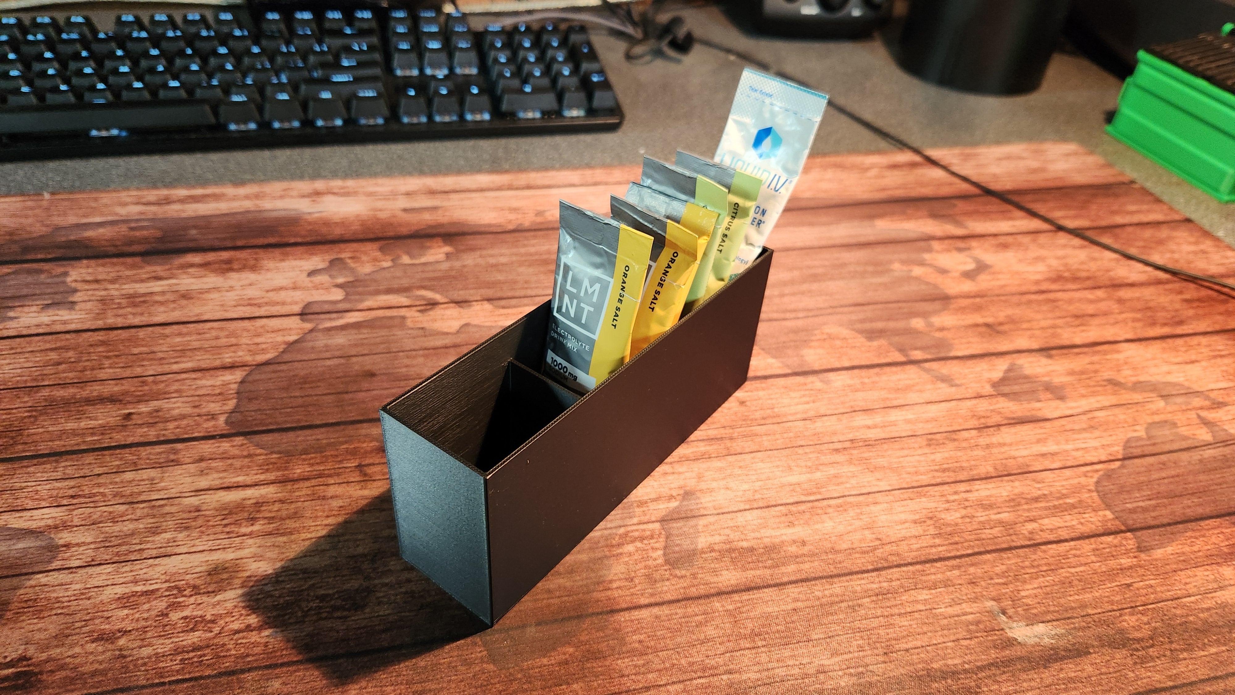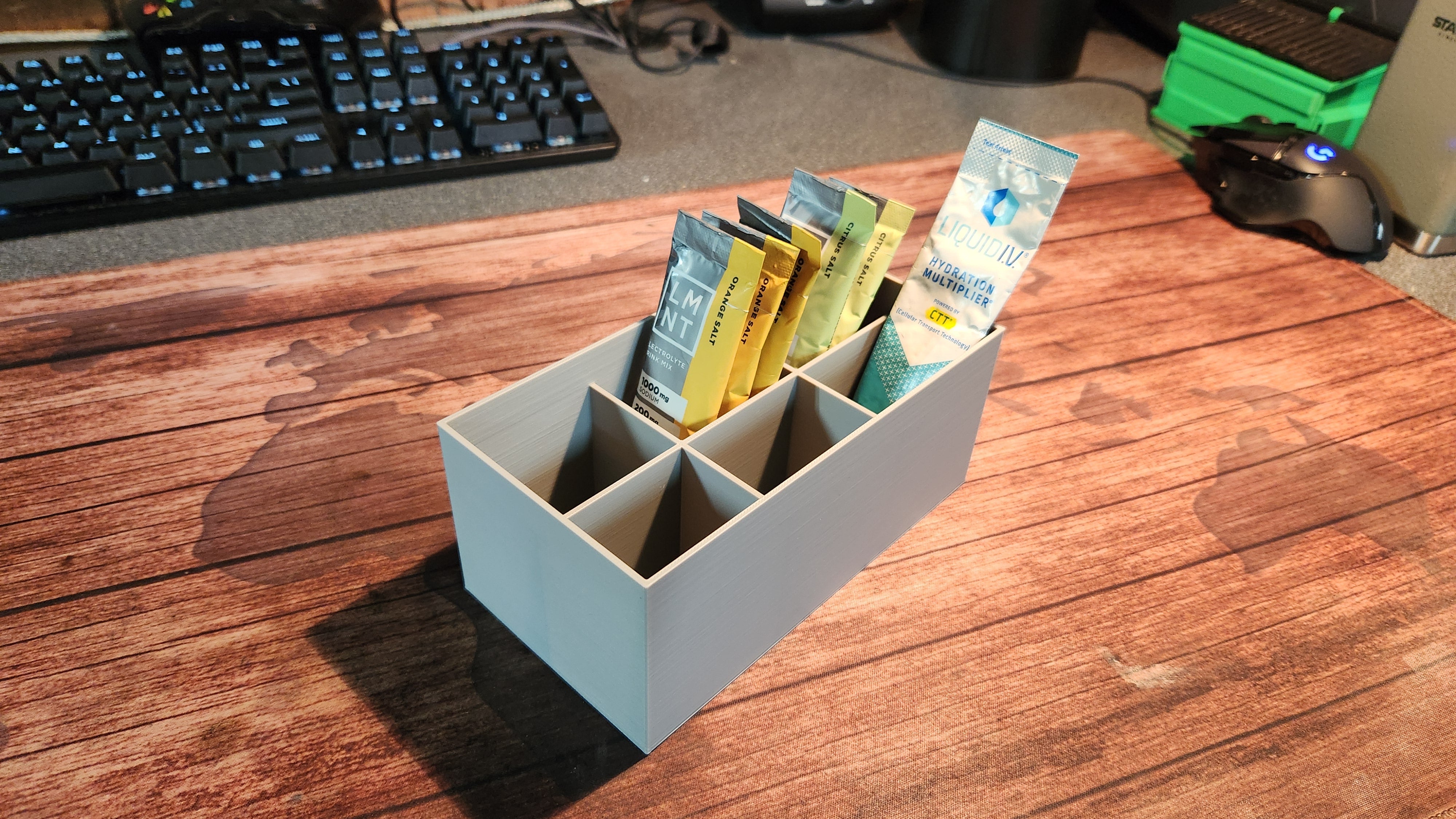 Organizer jest dostępny w dwóch wariantach: kompaktowa wersja, która może pomieścić do 15 pojedynczych saszetek, oraz większy model z miejscem na do 30 saszetek. Dzięki temu nadaje się zarówno do mniejszych gospodarstw domowych, jak i dla osób z większym wyborem napojów w proszku. Idealnie nadaje się do użytku w szafce kuchennej, spiżarni lub na półce, gdzie skutecznie minimalizuje bałagan i zapewnia, że ulubione napoje są zawsze pod ręką. Niezależnie od tego, czy używasz Liquid IV, LMNT, czy innych marek, ten organizer pomoże Ci utrzymać porządek i zoptymalizować przestrzeń.