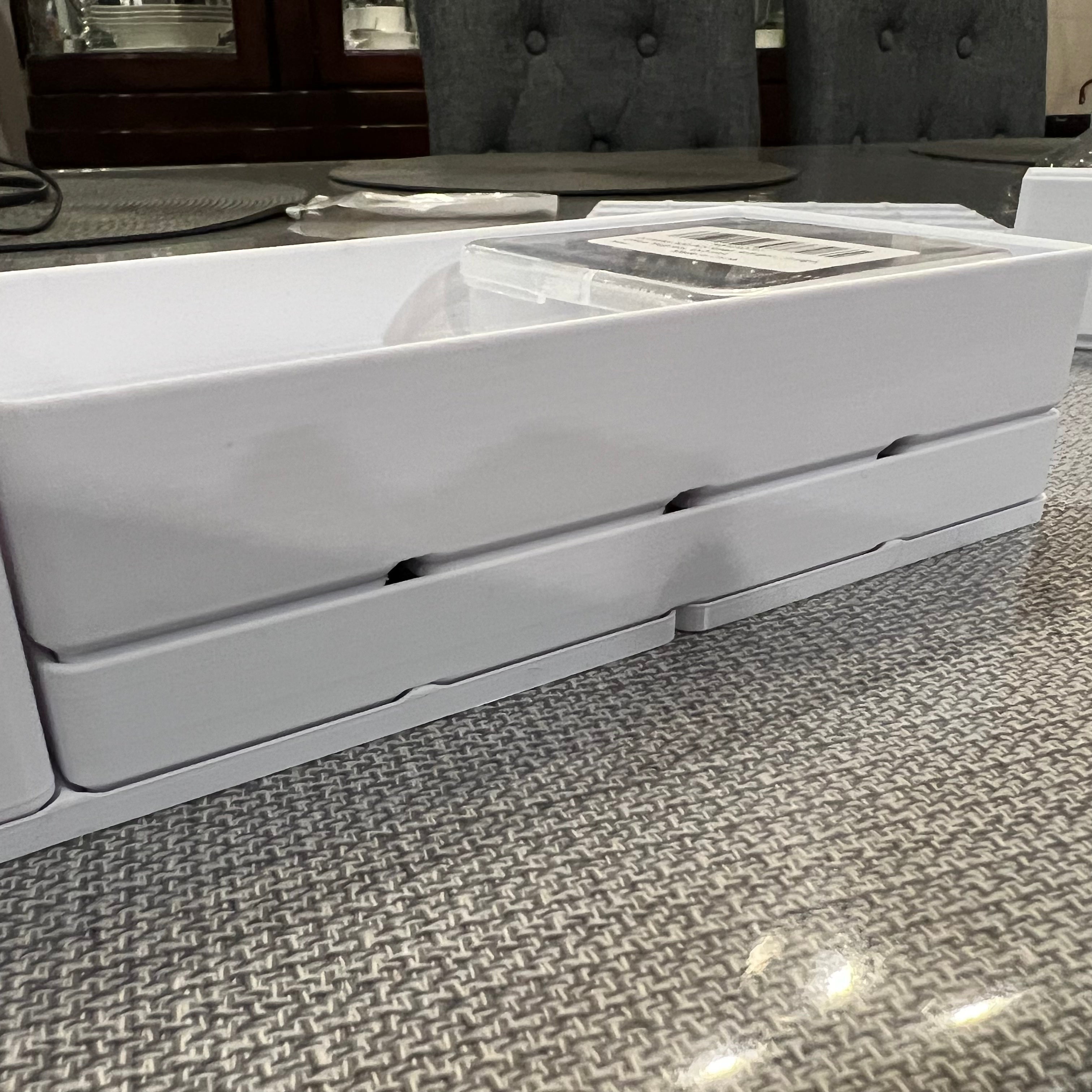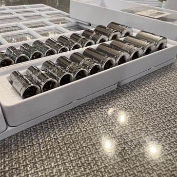 Ten organizer został zaprojektowany do przechowywania nasadek 1/4" z zestawu Harbor Freight i zapewnia uporządkowane rozwiązanie do przechowywania. Jest kompatybilny z systemem Gridfinity, co umożliwia zorganizowaną i modułową konfigurację w skrzynce narzędziowej lub szufladzie. Uchwyt jest wykonany z zachowaniem precyzyjnych wymiarów, co zapewnia, że nasadki SAE i metryczne pozostają bezpiecznie na swoim miejscu, nie przetaczając się, a jednocześnie są łatwe do wyjęcia. Głębokość tego modułu jest zoptymalizowana, dzięki czemu można umieścić na nim dodatkowe rozwiązania do przechowywania Gridfinity, co maksymalizuje wykorzystanie przestrzeni 1x4. Obsługuje szeroki zakres rozmiarów nasadek, w tym najpopularniejsze wymiary SAE (od 3/16" do 9/16") i metryczne (od 5 mm do 14 mm).