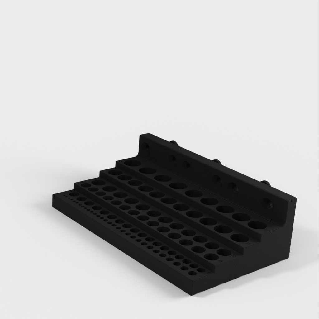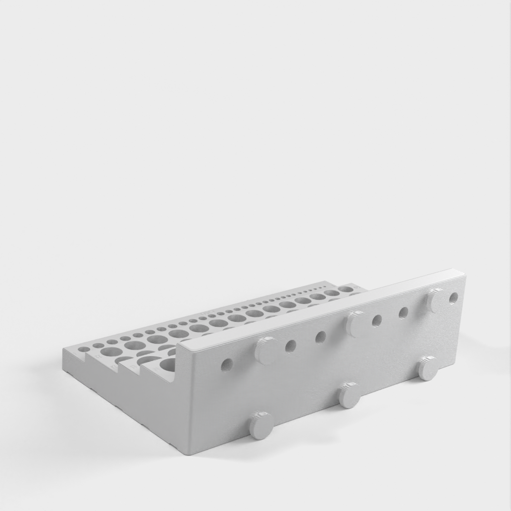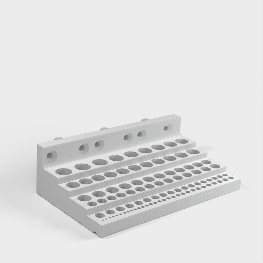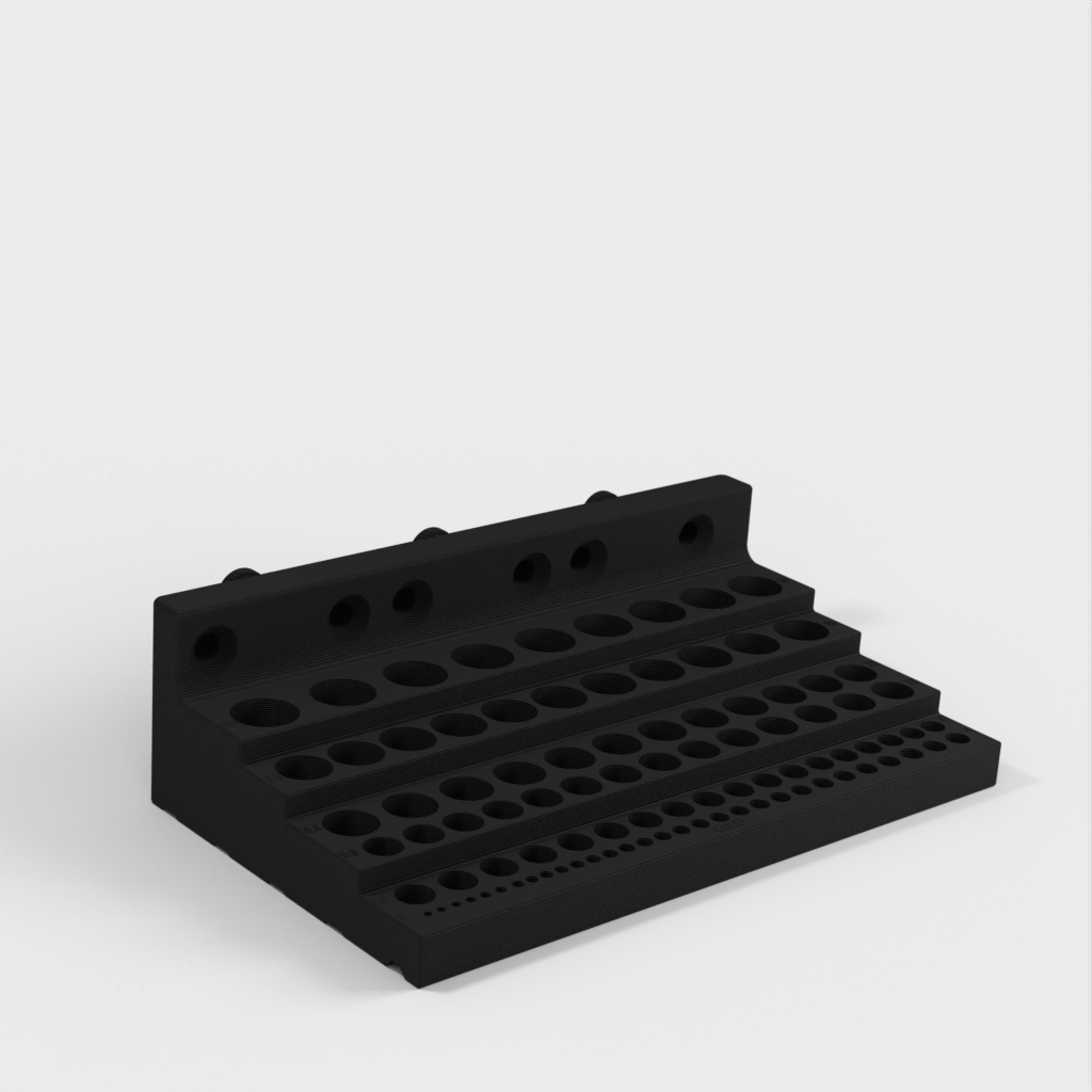 Jest to uchwyt na wiertła, który zabezpiecza i porządkuje wiertła w rozmiarach od 1 mm do 10,4 mm w odstępach co 0,1 mm. Został zaprojektowany tak, aby był kompatybilny z tablicą do przechowywania narzędzi Parkside Wall Tool, co oznacza, że można ją łatwo zamontować na tablicy, aby utrzymać porządek wierteł oraz utrzymać porządek i wydajność w miejscu pracy. Dzięki tej kombinacji zapewniasz kompletne i praktyczne rozwiązanie do przechowywania wierteł i narzędzi.