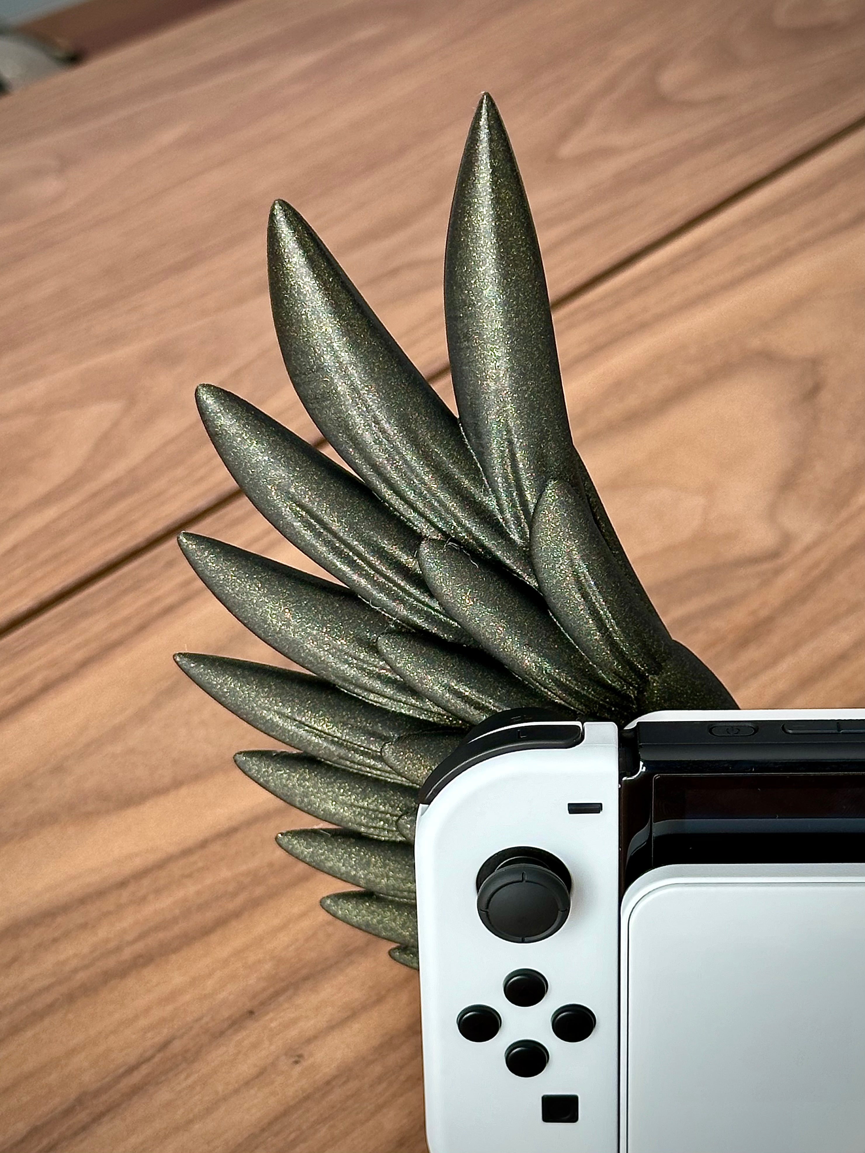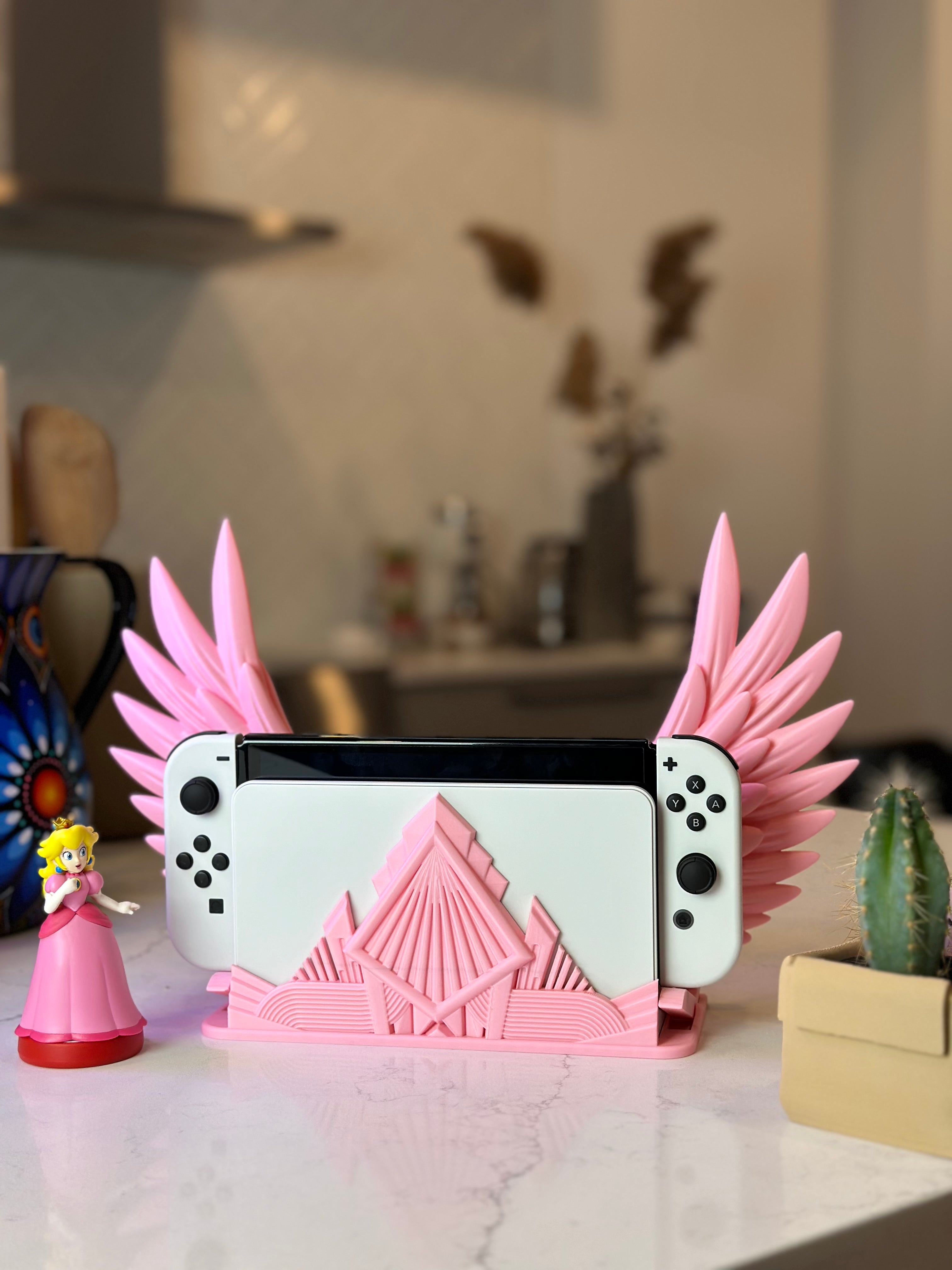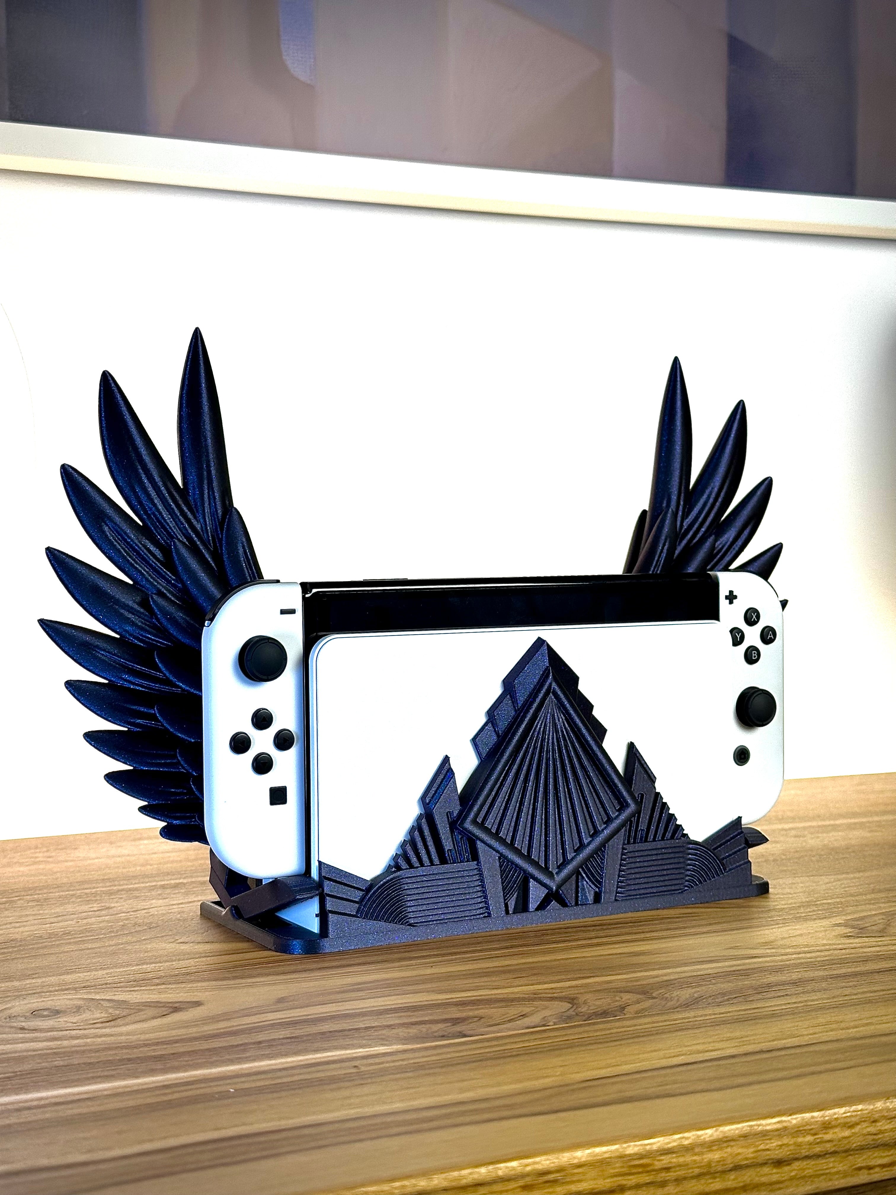Ta stacja dokująca dodaje eleganckiego akcentu Art Deco do Twojego zestawu do gier. Unikalny design posiada skrzydła, które podnoszą się po zadokowaniu konsoli Nintendo Switch lub modelu OLED. Służy jako stabilny stojak i zapewnia miejsce na kable, co zapewnia uporządkowaną konfigurację.