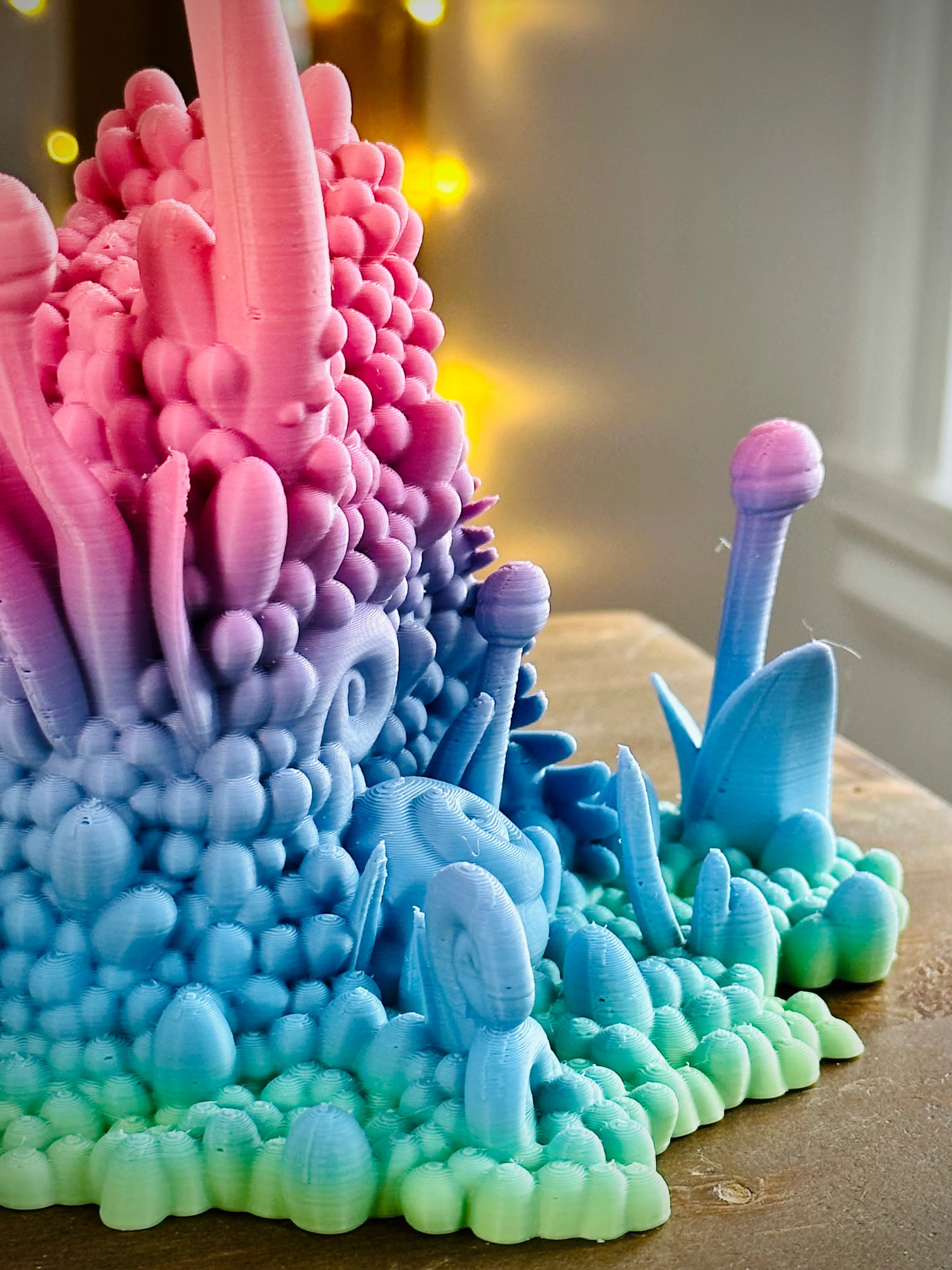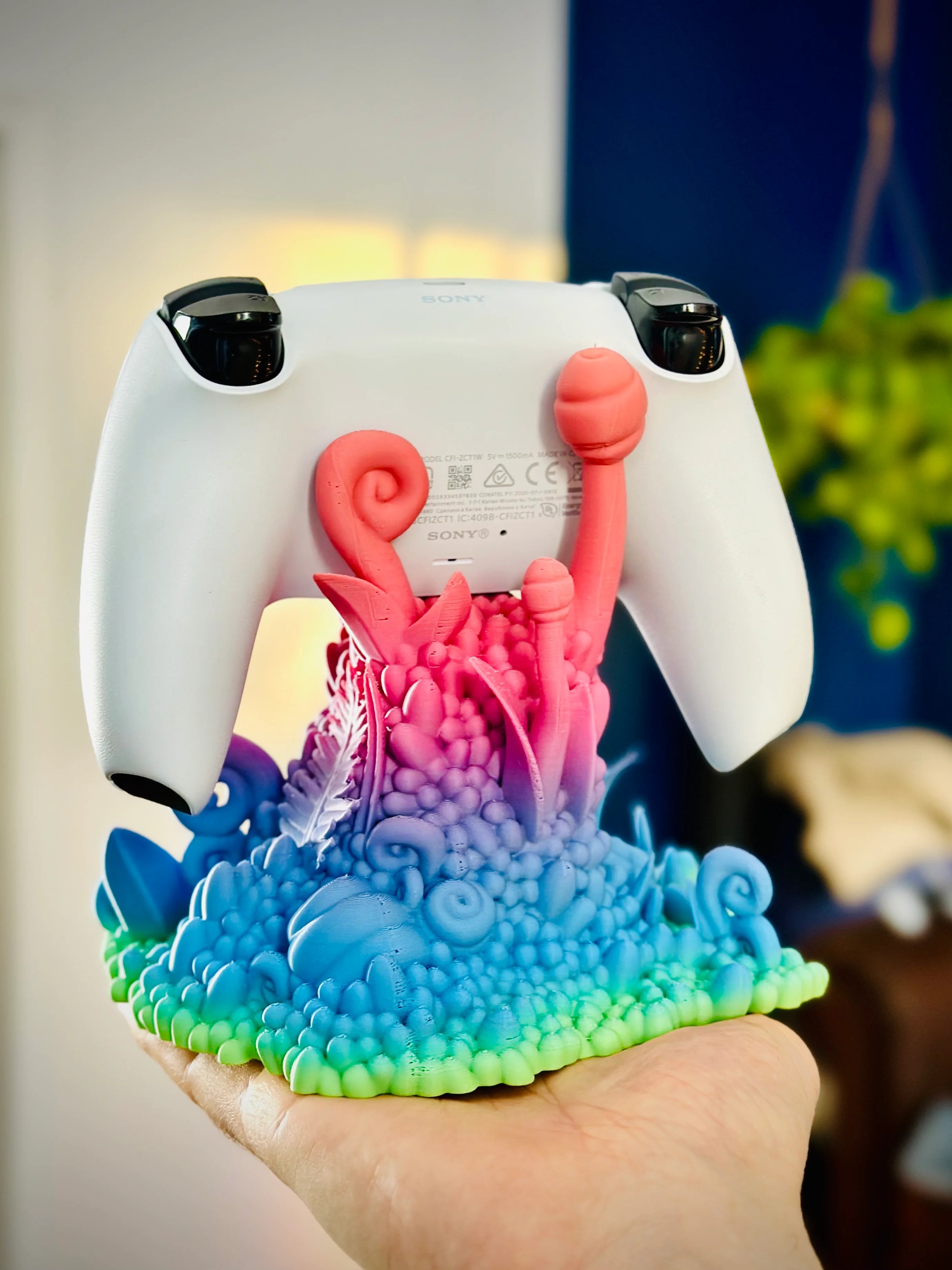• Ozdobny stojak na kontrolery z unikalnym i szczegółowym wzorem leśnego krajobrazu.
