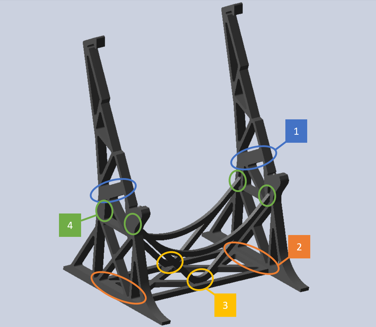 Zgodnie z poniższym rysunkiem przymocuj haki (niebieskie kółka) do Sokoła i zatrzaśnij stojak na dole, używając małych ograniczników na stopniach stojaka (pomarańczowe kółko).