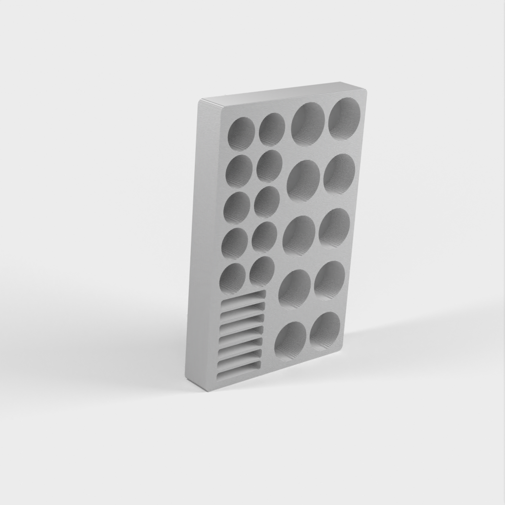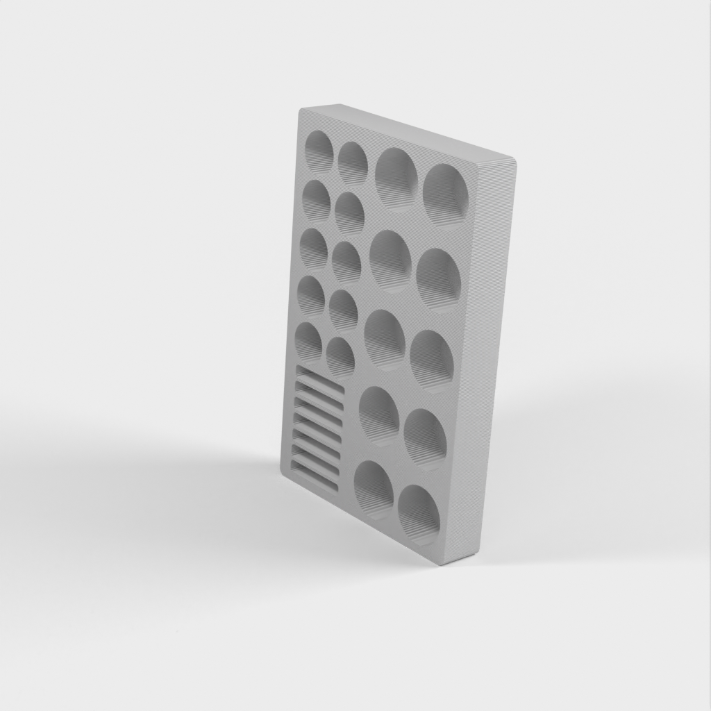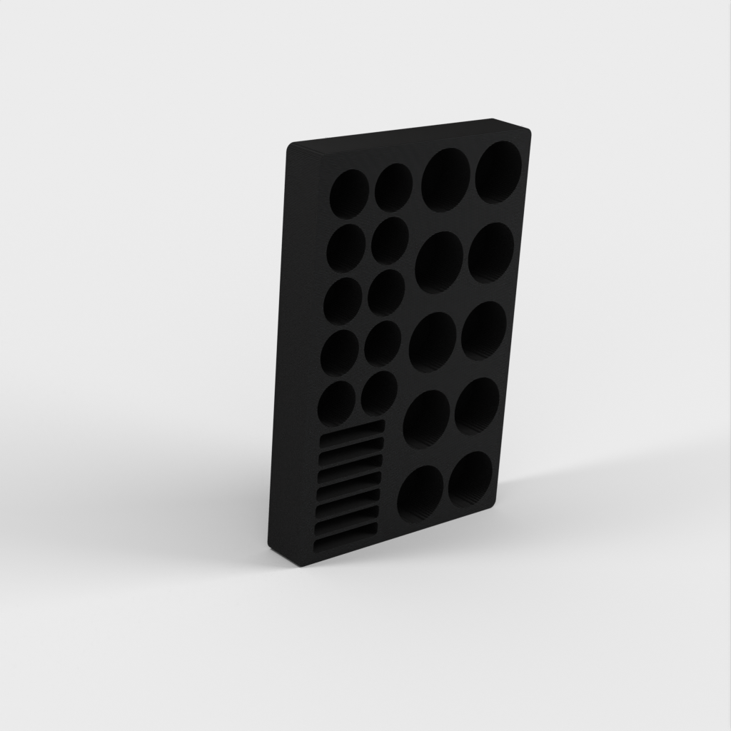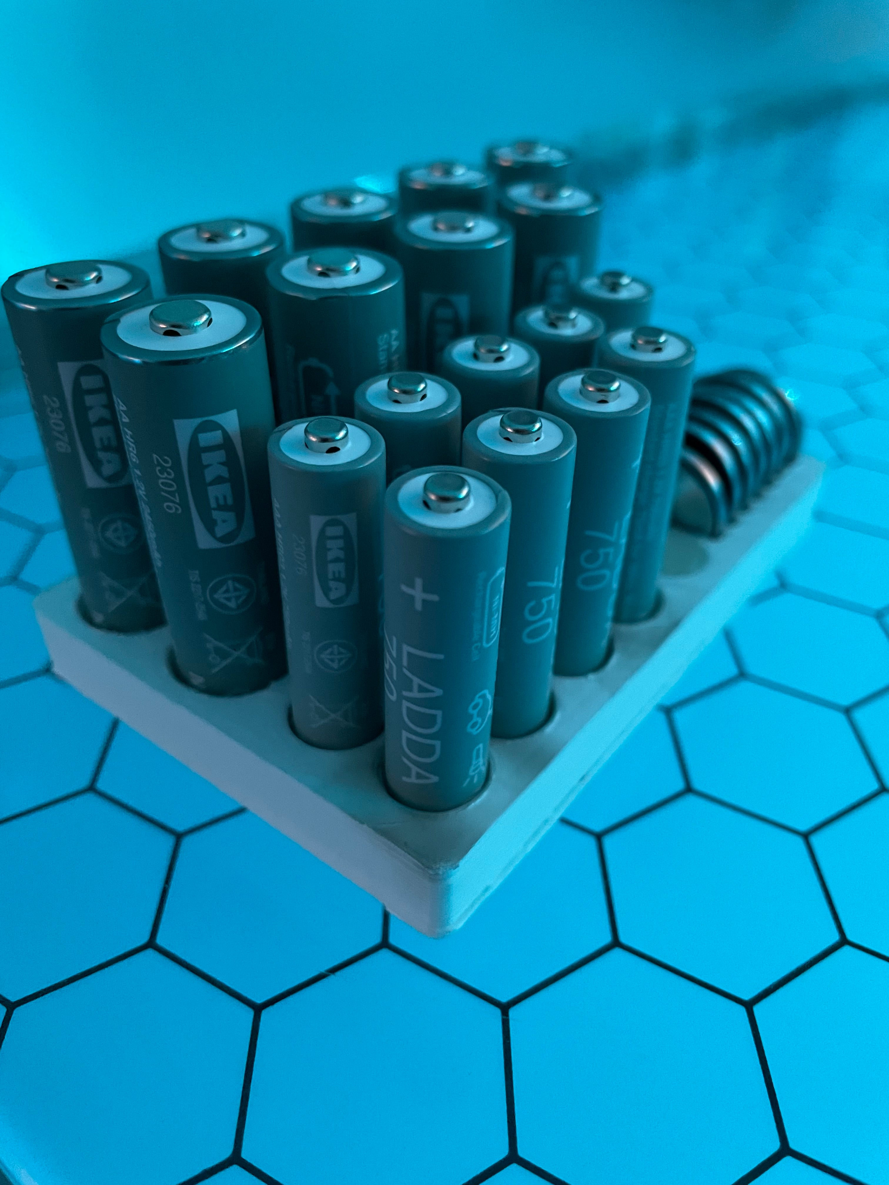 Uchwyt na baterie przeznaczony specjalnie do baterii AA, AAA i CR2032. Został zaprojektowany specjalnie dla baterii IKEA Ladda, ale pasuje również do baterii innych marek, o ile nie są cieńsze niż baterie normalnego rozmiaru. Uchwyt może pomieścić 10 baterii AA, 10 baterii AAA i 7 baterii CR2032. Dzięki temu baterie są uporządkowane i łatwo dostępne.